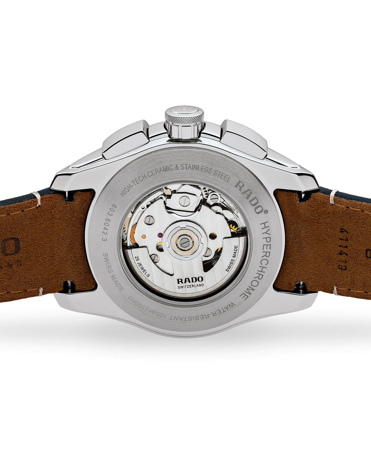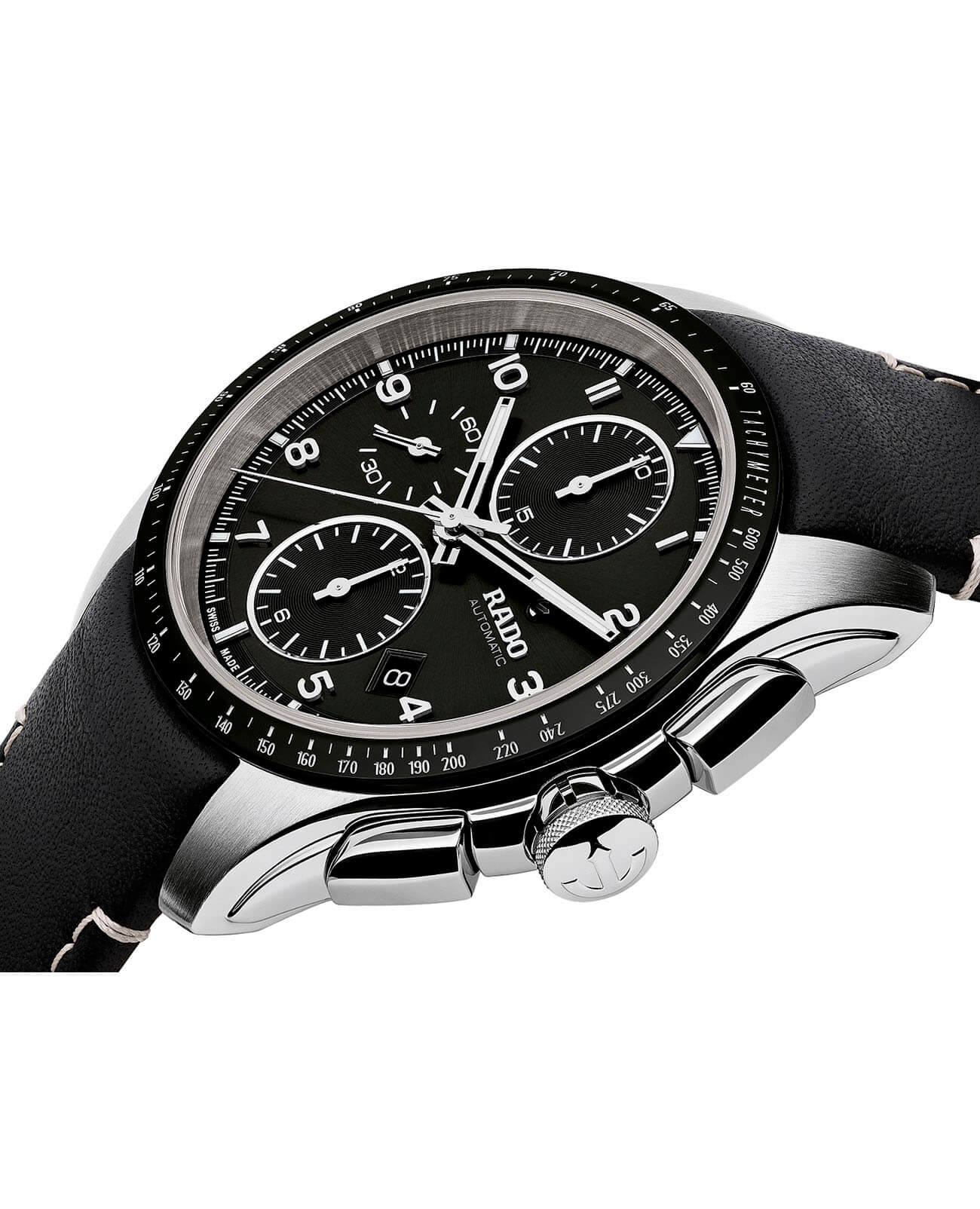 Премиальный хронографХронографФункция позволяет измерять отрезки времени с особой точностью: часы, минуты, секунды. Верным признаком хронографа является наличие на циферблате 3 дополнительных окошек-счётчиков. на классическом ремешке из натуральной кожи позволит поддерживать правильный имидж. Это лучший вариант для солидного бизнесмена или руководителя компании. Наручные часы с автоподзаводом оснащены швейцарским калибром ETA A05.H21, запас хода сохраняется до 54 часов. Прозрачная задняя крышка корпуса позволяет наблюдать за движением деталей механизма. Корпус из нержавеющей стали 316L. БезельБезельВнешний ободок, закрепляющий стекло. В спортивных часах так называется поворотное кольцо с делениями на циферблате, выполняет роль таймера – замеряет отрезки времени на шкале. Неподвижный безель – элемент декора. Однонаправленно вращающийся безель на дайверских часах позволяет фиксировать моменты погружения и выныривания на поверхность. из высокотехнологичной керамикиВысокотехнологичная керамикаИнновационный запатентованный Rado материал с гладкой или матовой поверхностью. Керамика за счёт кристаллической структуры обладает повышенной устойчивостью от возникновения царапин. Материал способен принимать температуру тела человека, обеспечивая невероятный комфорт при ношении.. Стрелки с люминесцентной подсветкойЛюминесцентное покрытиеПозволяет считывать показания времени в темноте. Производители наносят на стрелки, часовые индексы, безель или поверхность циферблата светонакопительный состав, дающий холодное свечение.. Сапфировое стекло с антибликовой поверхностью. Водостойкость 100 метров. Секундомер, отображение даты. . Диаметр корпуса: 44 мм.