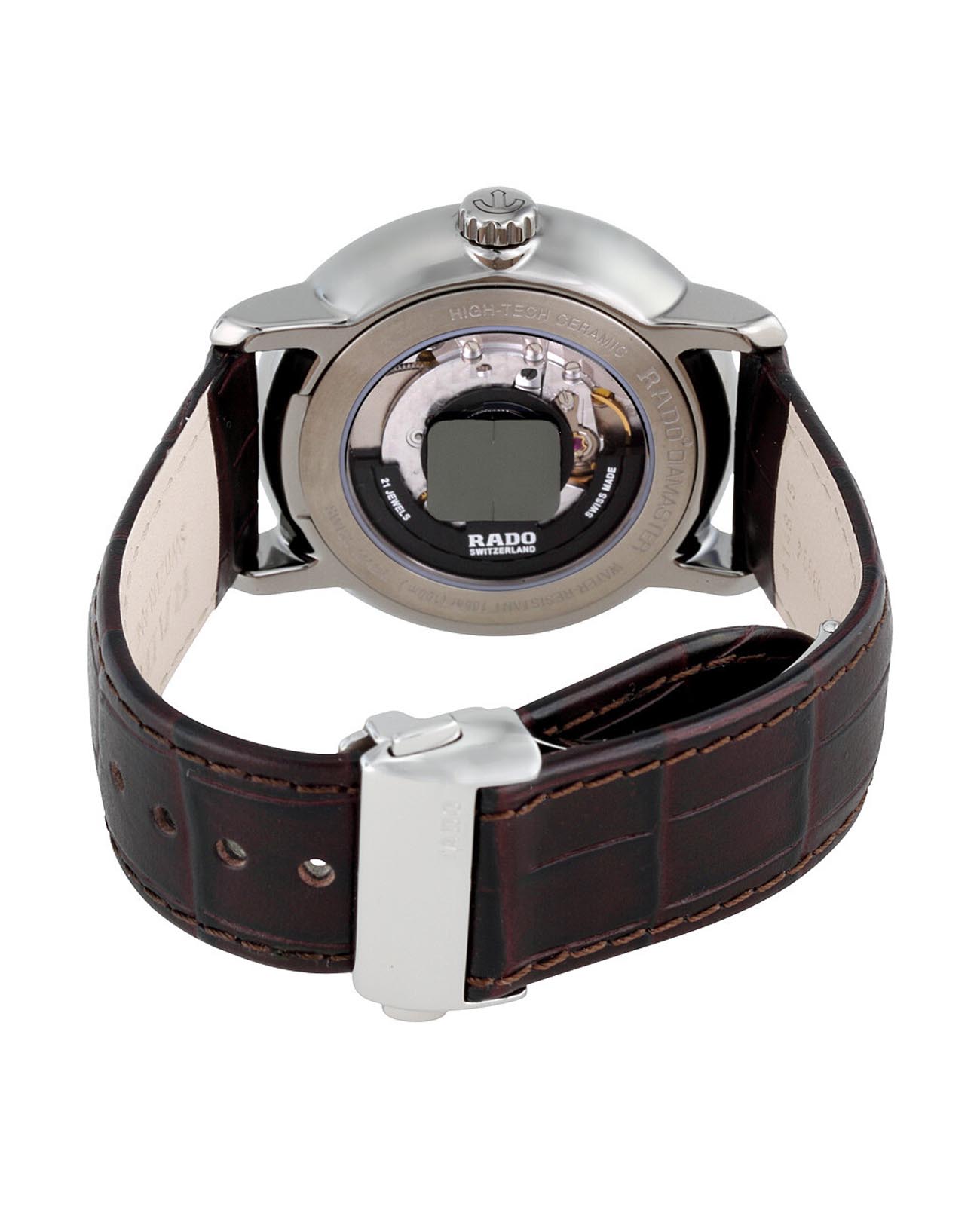 Мужские механические швейцарские часы с автоподзаводом Rado Diamaster R14074106. Сапфировое стеклоСапфировое стеклоПрочный и надёжный материал из кристалла сапфира синтетического происхождения, характеризующийся особой твёрдостью и устойчивостью к царапинам и повреждениям. устойчивое к мелким механическим повреждениям. Корпус часов изготовлен из высокотехнологичной плазменной керамикиВысокотехнологичная плазменная керамикаИнновационный материал, технология запатентована. Выплавление керамики осуществляется в печи при 20 000 °C, белоснежный материал под воздействием ультравысокой температуры приобретает уникальный блеск, присущий металлам.. Окошко даты находится в положении 6 часов. Класс водозащиты: 100 метров, позволит плавать, нырять и заниматься другими водными видами спорта. Кожаный ремешок на раскладной застёжкеРаскладная застёжкаТакой тип застёжки используется только на браслетах из металла. Она никогда не раскрывается полностью, происходит разделение на 2 и более частей. Раскладывающая застёжка снизит вероятность потери часов к минимуму..