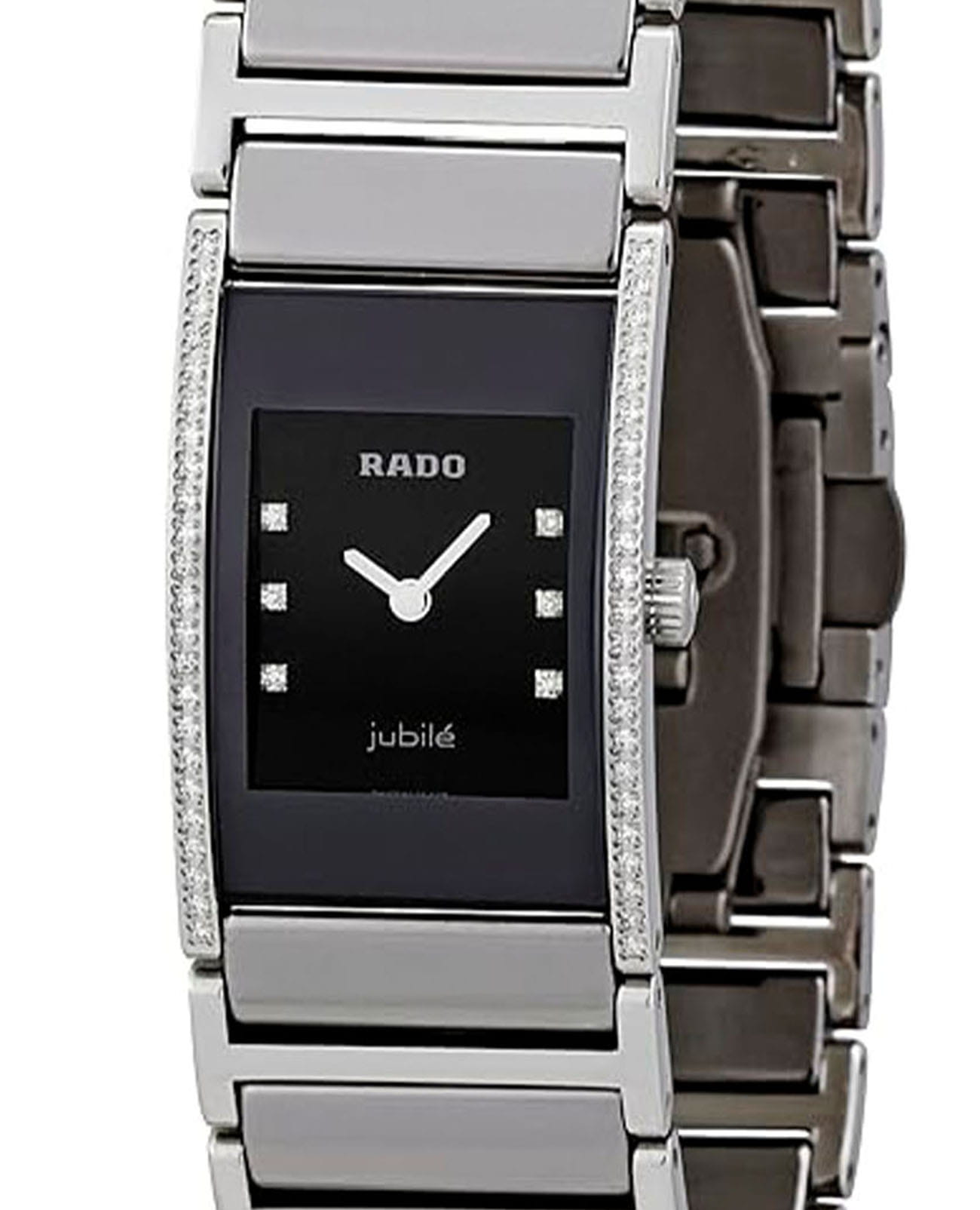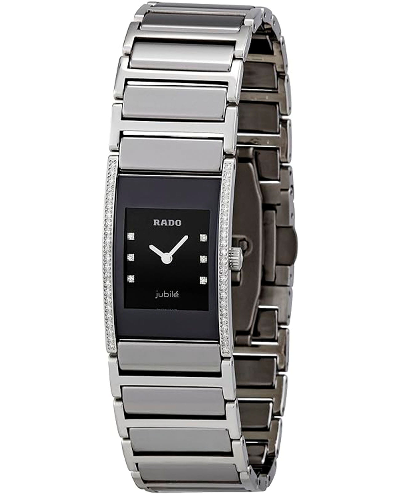 Женские часы Rado Integral Diamonds R20759752 с надёжным кварцевым механизмом. Сапфировое стеклоСапфировое стеклоПрочный и надёжный материал из кристалла сапфира синтетического происхождения, характеризующийся особой твёрдостью и устойчивостью к царапинам и повреждениям. устойчивое к мелким механическим повреждениям. Корпус выполнен из нержавеющей стали. Циферблат инкрустирован бриллиантами. Окошко даты находится в положении 6 часов. Класс водозащиты: 30 метров, позволит защитить корпус от случайных брызг или капель дождя. Стальной браслет с керамическими вставками на раскладной застёжкеРаскладная застёжкаТакой тип застёжки используется только на браслетах из металла. Она никогда не раскрывается полностью, происходит разделение на 2 и более частей. Раскладывающая застёжка снизит вероятность потери часов к минимуму.. Корпус украшен бриллиантами.