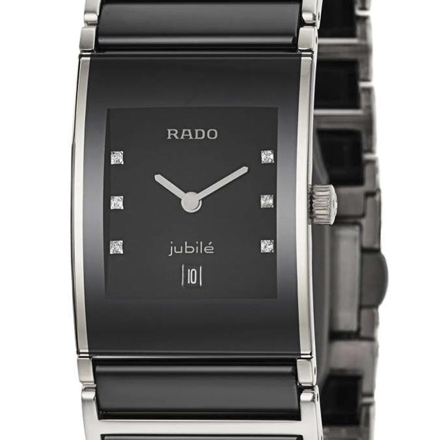 Женские часы Rado Integral R20785752 с надёжным кварцевым механизмом. Сапфировое стеклоСапфировое стеклоПрочный и надёжный материал из кристалла сапфира синтетического происхождения, характеризующийся особой твёрдостью и устойчивостью к царапинам и повреждениям. устойчивое к мелким механическим повреждениям. Корпус выполнен из нержавеющей стали. Класс водозащиты: 30 метров, позволит защитить корпус от случайных брызг или капель дождя. Циферблат декорирован 6 бриллиантами. Стальной браслет с вставками из высокотехнологичной керамикиВысокотехнологичная керамикаИнновационный запатентованный Rado материал с гладкой или матовой поверхностью. Керамика за счёт кристаллической структуры обладает повышенной устойчивостью от возникновения царапин. Материал способен принимать температуру тела человека, обеспечивая невероятный комфорт при ношении. на раскладной застёжкеРаскладная застёжкаТакой тип застёжки используется только на браслетах из металла. Она никогда не раскрывается полностью, происходит разделение на 2 и более частей. Раскладывающая застёжка снизит вероятность потери часов к минимуму.. Отображение даты в положении «6 часов».