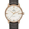 Премиальная модель очаровывает классическим исполнением, не лишённым роскошного стиля. Каждый по достоинству оценит ремешок из натуральной кожи с имитацией рисунка кожи крокодила на застёжке бабочка с кнопкамиЗастёжка "бабочка"Такой вид застёжки дополняется предохранителями, помогающими избежать случайного раскрытия браслета. Обладают изящным исполнением. . Надёжный стальной корпус защищает автоматический механизм с увеличенным резервом хода до 80 часов. Прозрачная задняя крышка позволяет наблюдать за движением деталей. Стекло из сапфира с антибликовой поверхностью. PVD-покрытиеPVDУльтратонкое покрытие наносится в технике вакуумного напыления, сочетает в себе нитрид титана особой прочности со слоем золота или оксида хрома. Несёт в себе декоративную или защитную функцию. цвета розового золота. Водонепроницаемость 50 метров. Индикация текущего числа. Диаметр корпуса: 37,7 мм.