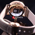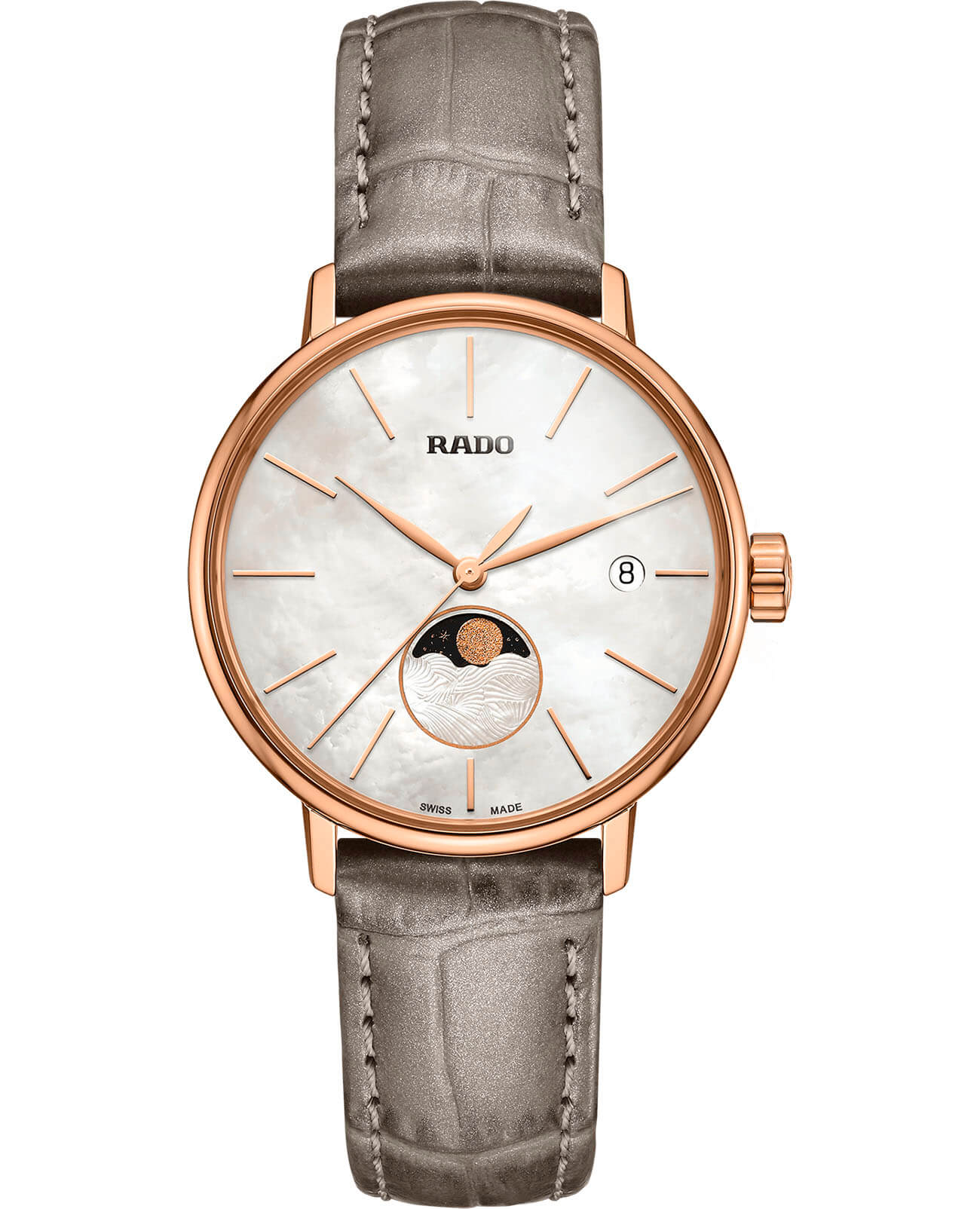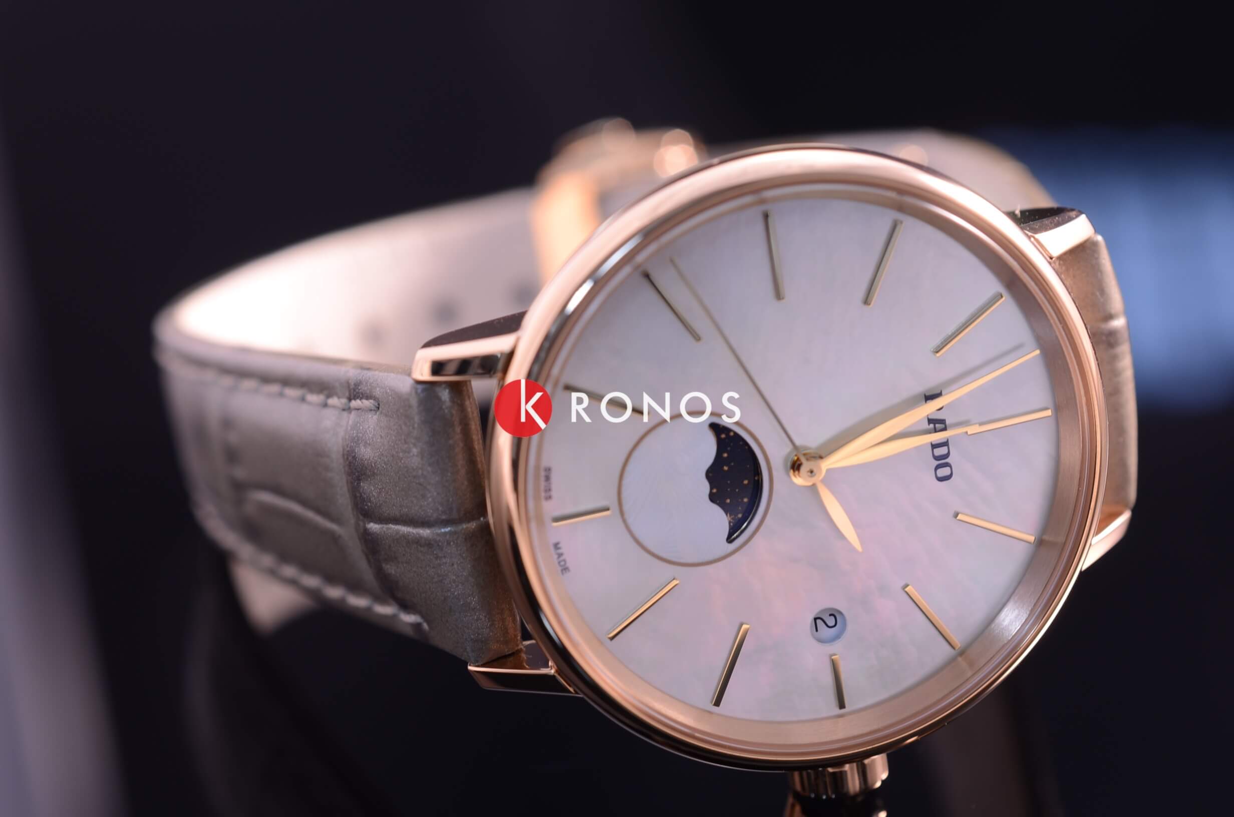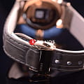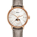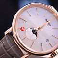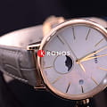 Роскошный перламутровый циферблат завораживает переливающимися оттенками, такое исполнение являет собой настоящую элегантность и особый стиль. Привлекательностью обладает и календарь, отображающий фазы луны. Такое оформление идеально сочетается с тонким серым ремешком с жемчужным отливом из натуральной кожи. Часы работают за счёт высокоточного кварцевого калибра ETA F05.841. Сапфировое стекло имеет антибликовое покрытие. Апертура даты. PVD-покрытиеPVDУльтратонкое покрытие наносится в технике вакуумного напыления, сочетает в себе нитрид титана особой прочности со слоем золота или оксида хрома. Несёт в себе декоративную или защитную функцию. корпуса. Диаметр корпуса: 34 мм.