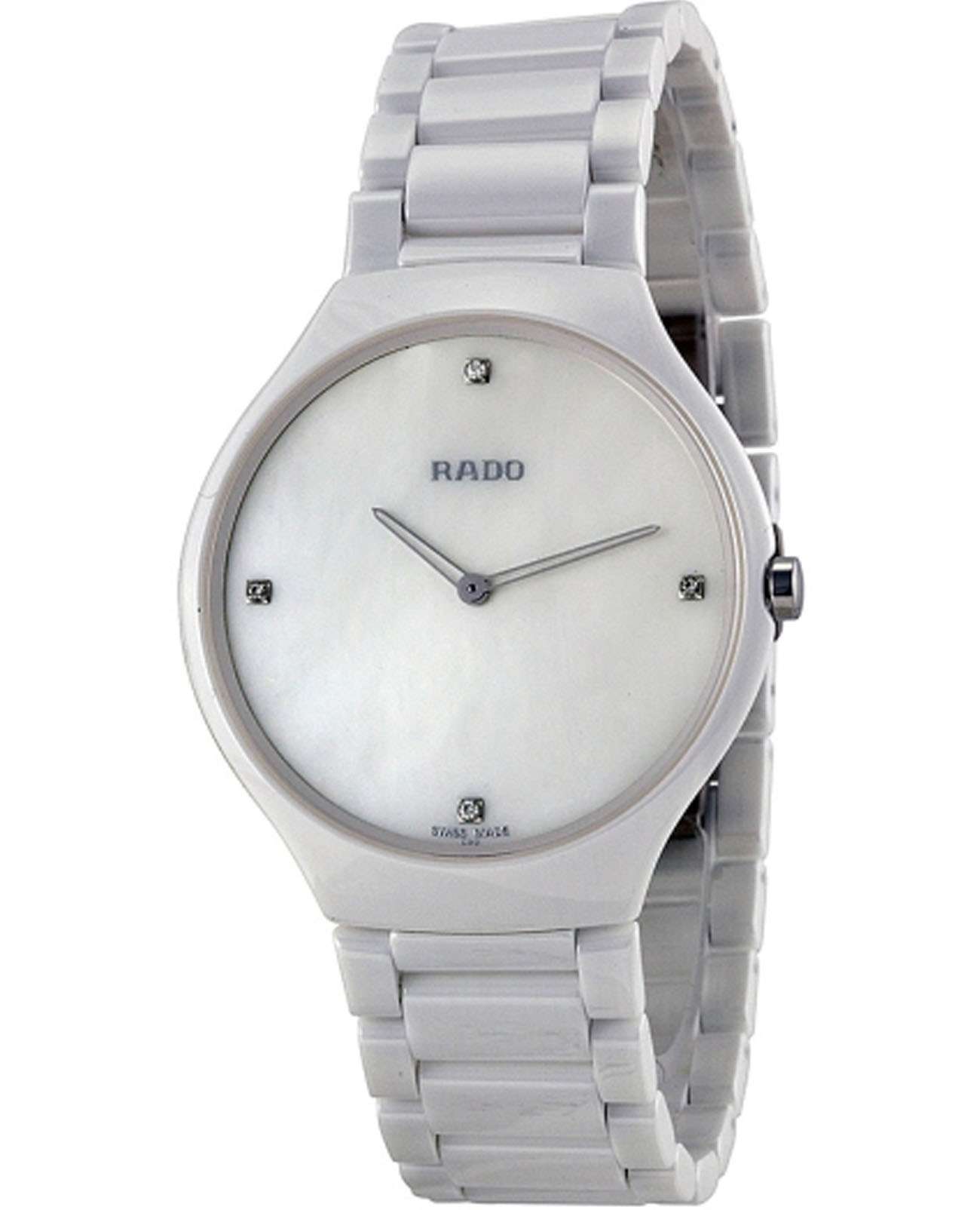 Швейцарские женские Rado True Thinline R27957902, кварцевый механизм с высокой точностью. Сапфировое стеклоСапфировое стеклоПрочный и надёжный материал из кристалла сапфира синтетического происхождения, характеризующийся особой твёрдостью и устойчивостью к царапинам и повреждениям. устойчивое к появлению царапин, обладающее высокой прозрачностью. Корпус часов изготовлен из высокотехнологичной керамикиВысокотехнологичная керамикаИнновационный запатентованный Rado материал с гладкой или матовой поверхностью. Керамика за счёт кристаллической структуры обладает повышенной устойчивостью от возникновения царапин. Материал способен принимать температуру тела человека, обеспечивая невероятный комфорт при ношении.. Циферблат украшен бриллиантами. Класс водозащиты: 30 метров, позволит защитить корпус от случайных брызг или капель дождя. Керамический браслет на застёжке-бабочке с кнопкамиЗастёжка "бабочка"Такой вид застёжки дополняется предохранителями, помогающими избежать случайного раскрытия браслета. Обладают изящным исполнением. .