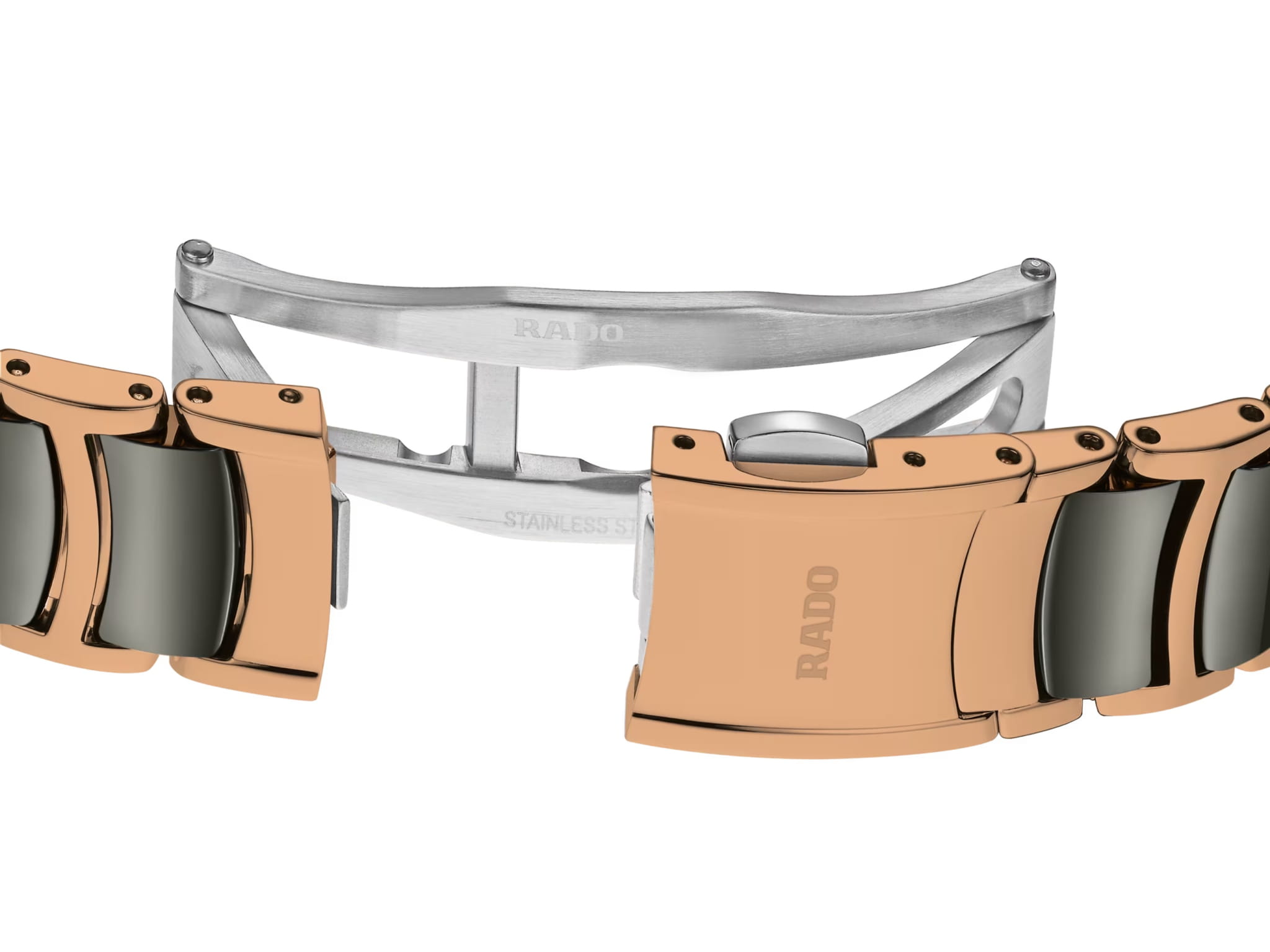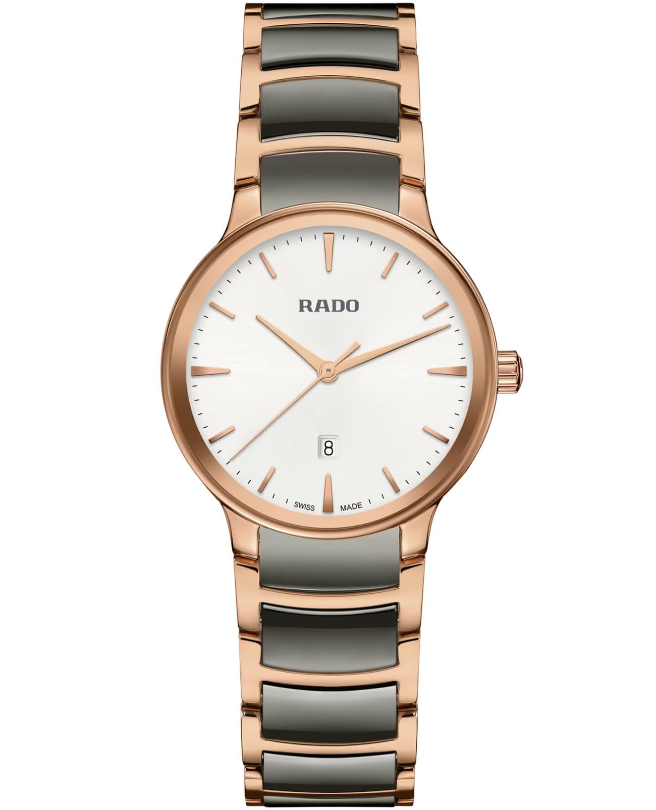 Швейцарские женские часы с надёжным кварцевым механизмом Rado Centrix R30024012. Корпус часов изготовлен из нержавеющей стали с PVD-покрытиемPVDУльтратонкое покрытие наносится в технике вакуумного напыления, сочетает в себе нитрид титана особой прочности со слоем золота или оксида хрома. Несёт в себе декоративную или защитную функцию.. Браслет из стали и высокотехнологичной керамикиВысокотехнологичная керамикаИнновационный запатентованный Rado материал с гладкой или матовой поверхностью. Керамика за счёт кристаллической структуры обладает повышенной устойчивостью от возникновения царапин. Материал способен принимать температуру тела человека, обеспечивая невероятный комфорт при ношении. на раскладной застёжкеРаскладная застёжкаТакой тип застёжки используется только на браслетах из металла. Она никогда не раскрывается полностью, происходит разделение на 2 и более частей. Раскладывающая застёжка снизит вероятность потери часов к минимуму.. Сапфировое стеклоСапфировое стеклоПрочный и надёжный материал из кристалла сапфира синтетического происхождения, характеризующийся особой твёрдостью и устойчивостью к царапинам и повреждениям. устойчивое к мелким механическим повреждениям. Класс водозащиты: 50 метров, позволит защитить корпус от случайных брызг или капель дождя. Окошко даты находится в положении 6 часов.