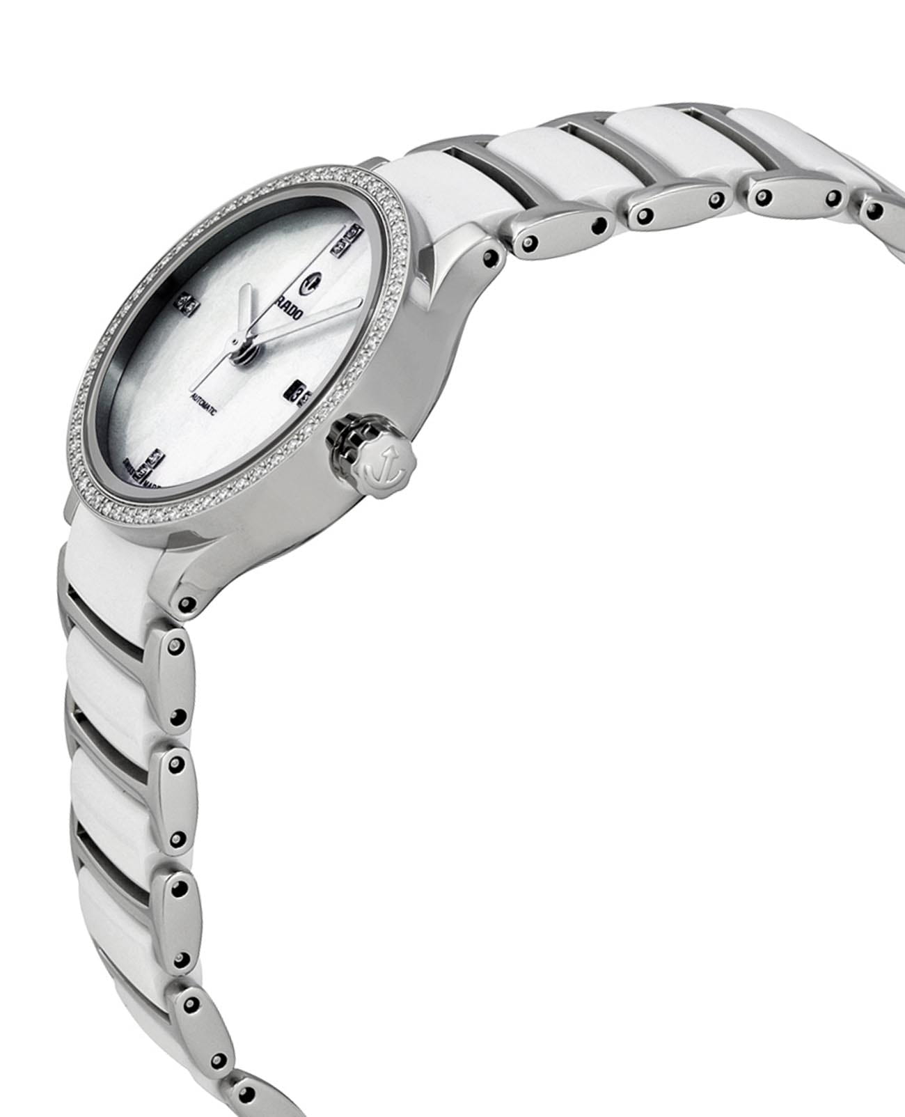 Женские швейцарские часы с автоподзаводом Rado Centrix Automatic Diamonds R30160912. Сапфировое стеклоСапфировое стеклоПрочный и надёжный материал из кристалла сапфира синтетического происхождения, характеризующийся особой твёрдостью и устойчивостью к царапинам и повреждениям. устойчивое к мелким механическим повреждениям. Браслет из стали и высокотехнологичной керамикиВысокотехнологичная керамикаИнновационный запатентованный Rado материал с гладкой или матовой поверхностью. Керамика за счёт кристаллической структуры обладает повышенной устойчивостью от возникновения царапин. Материал способен принимать температуру тела человека, обеспечивая невероятный комфорт при ношении. на раскладной застёжкеРаскладная застёжкаТакой тип застёжки используется только на браслетах из металла. Она никогда не раскрывается полностью, происходит разделение на 2 и более частей. Раскладывающая застёжка снизит вероятность потери часов к минимуму.. Корпус часов изготовлен из нержавеющей стали. Окошко даты находится в положении 3 часа. Циферблат и безельБезельВнешний ободок, закрепляющий стекло. В спортивных часах так называется поворотное кольцо с делениями на циферблате, выполняет роль таймера – замеряет отрезки времени на шкале. Неподвижный безель – элемент декора. Однонаправленно вращающийся безель на дайверских часах позволяет фиксировать моменты погружения и выныривания на поверхность. инкрустирован бриллиантами. Класс водозащиты: 30 метров, позволит защитить корпус от случайных брызг или капель дождя.