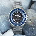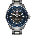 Премиальная модель обладает винтажным характером, синий циферблат обращает наше внимание на оригинальные стрелки в виде меча и стрелы. Часы обладают высокими показателями водонепроницаемости - сохранение герметичности до 20 бар, что стало возможным благодаря завинчивающейся задней крышке и заводной головке. Автоподзавод. Антибликовая обработка сапфирового стекла. Прочный керамический браслет. Отображение числа. Диаметр корпуса: 43 мм.
