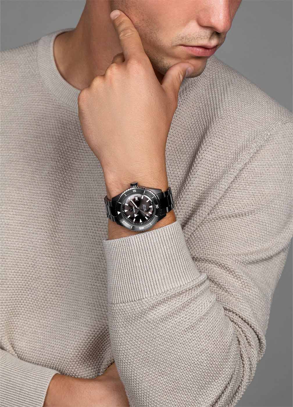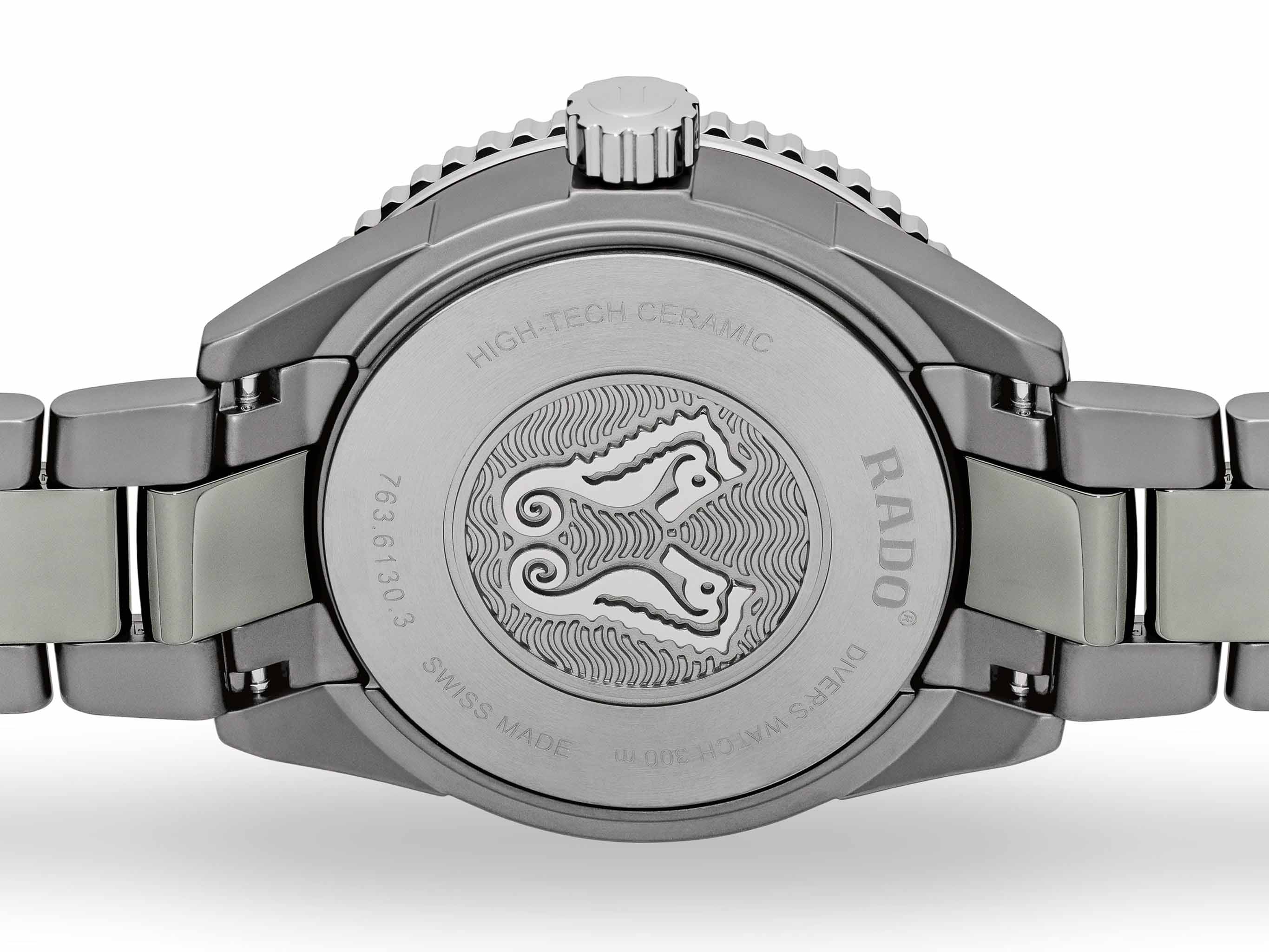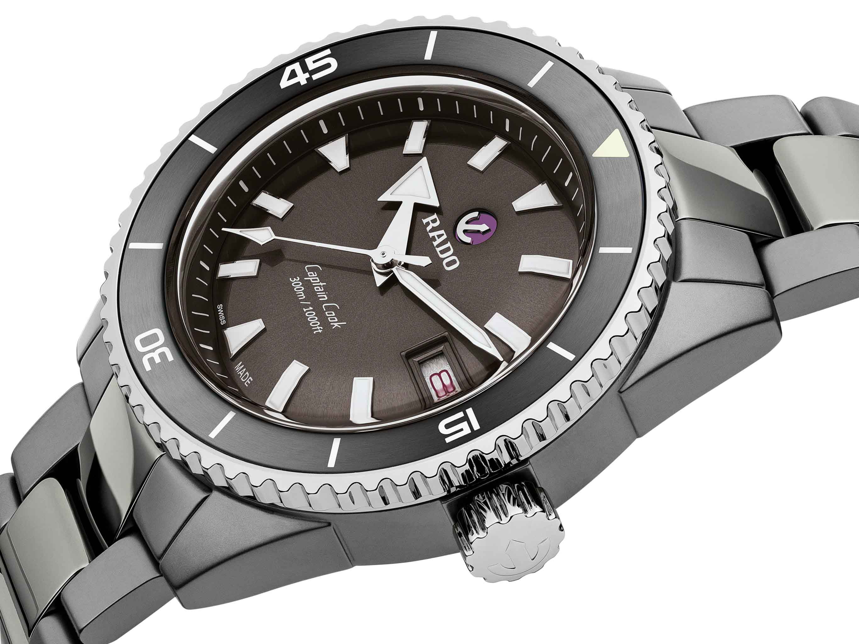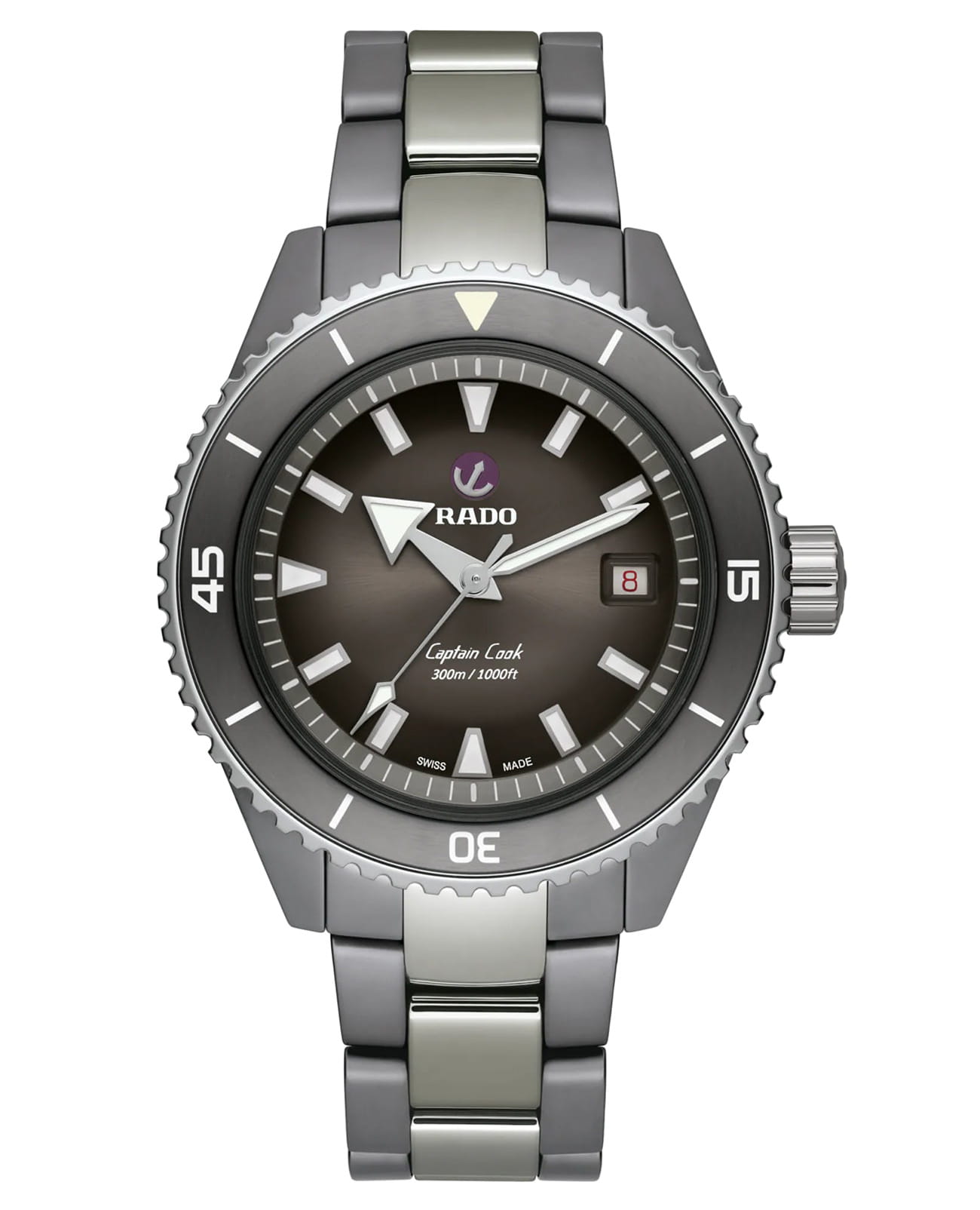 Высокотехнологичные керамические часы Captain Cook для дайверов (300 WR). Стрелки и индексы дайверских часов, сертифицированных по стандарту ISO 6425, покрыты SuperLuminova®, что обеспечивает отличную видимость на сером лакированном и полированном циферблате. 43-миллиметровый моноблочный корпус изготовлен из матовой плазменной высокотехнологичной керамикиВысокотехнологичная плазменная керамикаИнновационный материал, технология запатентована. Выплавление керамики осуществляется в печи при 20 000 °C, белоснежный материал под воздействием ультравысокой температуры приобретает уникальный блеск, присущий металлам., а вращающийся безельБезельВнешний ободок, закрепляющий стекло. В спортивных часах так называется поворотное кольцо с делениями на циферблате, выполняет роль таймера – замеряет отрезки времени на шкале. Неподвижный безель – элемент декора. Однонаправленно вращающийся безель на дайверских часах позволяет фиксировать моменты погружения и выныривания на поверхность. - из полированной нержавеющей стали. Внутри механизм Rado R763 с автоподзаводом превосходит стандартные требования по проверке точности в 3-5 положениях и обеспечивает 80 часов запаса хода. Эта модель поставляется с полированным плазменным высокотехнологичным керамическим браслетом. Какой бы ни была ваша область исследований, ваш высокотехнологичный керамический дайвер Captain Cook станет надежным партнером на долгие годы.