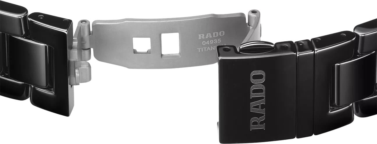 Женские швейцарские механические часы с автоподзаводом Rado Hyperchrome R32157152. Сапфировое стеклоСапфировое стеклоПрочный и надёжный материал из кристалла сапфира синтетического происхождения, характеризующийся особой твёрдостью и устойчивостью к царапинам и повреждениям. устойчивое к мелким механическим повреждениям. Корпус часов изготовлен из нержавеющей стали с PVD-покрытиемPVDУльтратонкое покрытие наносится в технике вакуумного напыления, сочетает в себе нитрид титана особой прочности со слоем золота или оксида хрома. Несёт в себе декоративную или защитную функцию. и высокотехнологичной керамикиВысокотехнологичная керамикаИнновационный запатентованный Rado материал с гладкой или матовой поверхностью. Керамика за счёт кристаллической структуры обладает повышенной устойчивостью от возникновения царапин. Материал способен принимать температуру тела человека, обеспечивая невероятный комфорт при ношении.. Керамический браслет на раскладной застёжкеРаскладная застёжкаТакой тип застёжки используется только на браслетах из металла. Она никогда не раскрывается полностью, происходит разделение на 2 и более частей. Раскладывающая застёжка снизит вероятность потери часов к минимуму.. Стрелки и метки с люминесцентным покрытиемЛюминесцентное покрытиеПозволяет считывать показания времени в темноте. Производители наносят на стрелки, часовые индексы, безель или поверхность циферблата светонакопительный состав, дающий холодное свечение.. Класс водозащиты: 50 метров, позволит защитить корпус от случайных брызг или капель дождя. БезельБезельВнешний ободок, закрепляющий стекло. В спортивных часах так называется поворотное кольцо с делениями на циферблате, выполняет роль таймера – замеряет отрезки времени на шкале. Неподвижный безель – элемент декора. Однонаправленно вращающийся безель на дайверских часах позволяет фиксировать моменты погружения и выныривания на поверхность. инкрустирован бриллиантами.