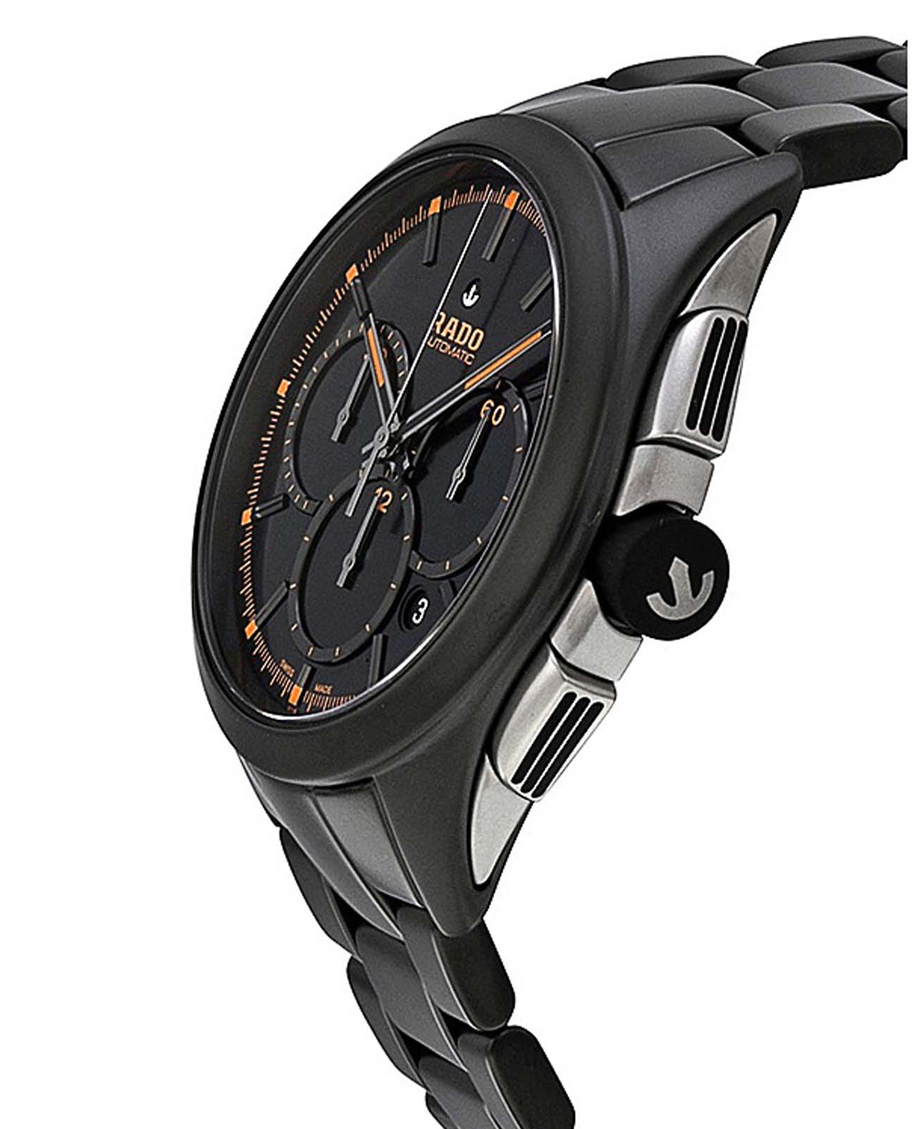 Мужские механические швейцарские часы- хронографХронографФункция позволяет измерять отрезки времени с особой точностью: часы, минуты, секунды. Верным признаком хронографа является наличие на циферблате 3 дополнительных окошек-счётчиков. с автоподзаводом Rado HyperChrome Automatic Chronograph R32525162. Сапфировое стеклоСапфировое стеклоПрочный и надёжный материал из кристалла сапфира синтетического происхождения, характеризующийся особой твёрдостью и устойчивостью к царапинам и повреждениям. устойчивое к мелким механическим повреждениям. Корпус часов изготовлен из высокотехнологичной керамикиВысокотехнологичная керамикаИнновационный запатентованный Rado материал с гладкой или матовой поверхностью. Керамика за счёт кристаллической структуры обладает повышенной устойчивостью от возникновения царапин. Материал способен принимать температуру тела человека, обеспечивая невероятный комфорт при ношении.. Окошко даты находится в положении между 4 и 5 часами. Стрелки с люминесцентным покрытиемЛюминесцентное покрытиеПозволяет считывать показания времени в темноте. Производители наносят на стрелки, часовые индексы, безель или поверхность циферблата светонакопительный состав, дающий холодное свечение.. Класс водозащиты: 100 метров, позволит плавать, нырять и заниматься другими водными видами спорта. Браслет из высокотехнологичной керамикиВысокотехнологичная керамикаИнновационный запатентованный Rado материал с гладкой или матовой поверхностью. Керамика за счёт кристаллической структуры обладает повышенной устойчивостью от возникновения царапин. Материал способен принимать температуру тела человека, обеспечивая невероятный комфорт при ношении. на раскладной застёжкеРаскладная застёжкаТакой тип застёжки используется только на браслетах из металла. Она никогда не раскрывается полностью, происходит разделение на 2 и более частей. Раскладывающая застёжка снизит вероятность потери часов к минимуму..