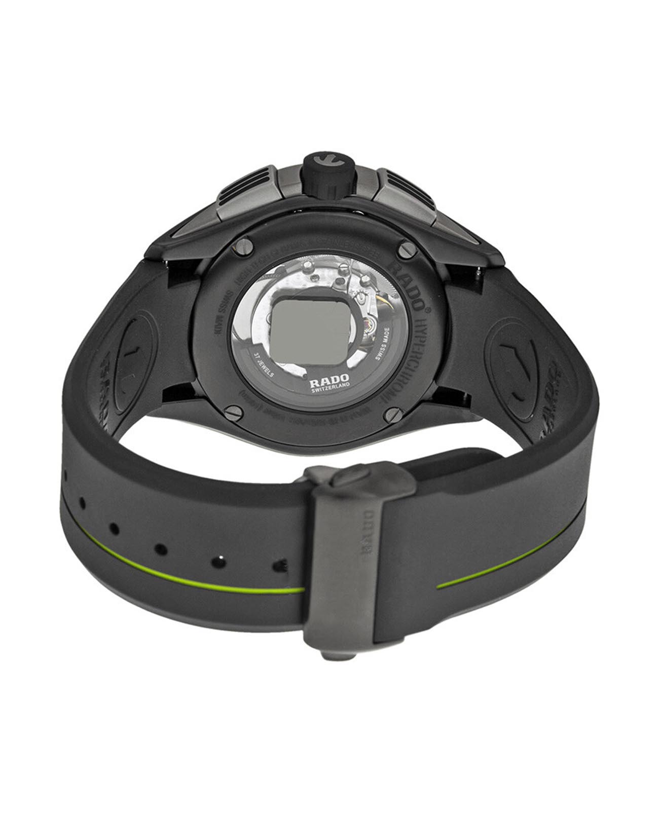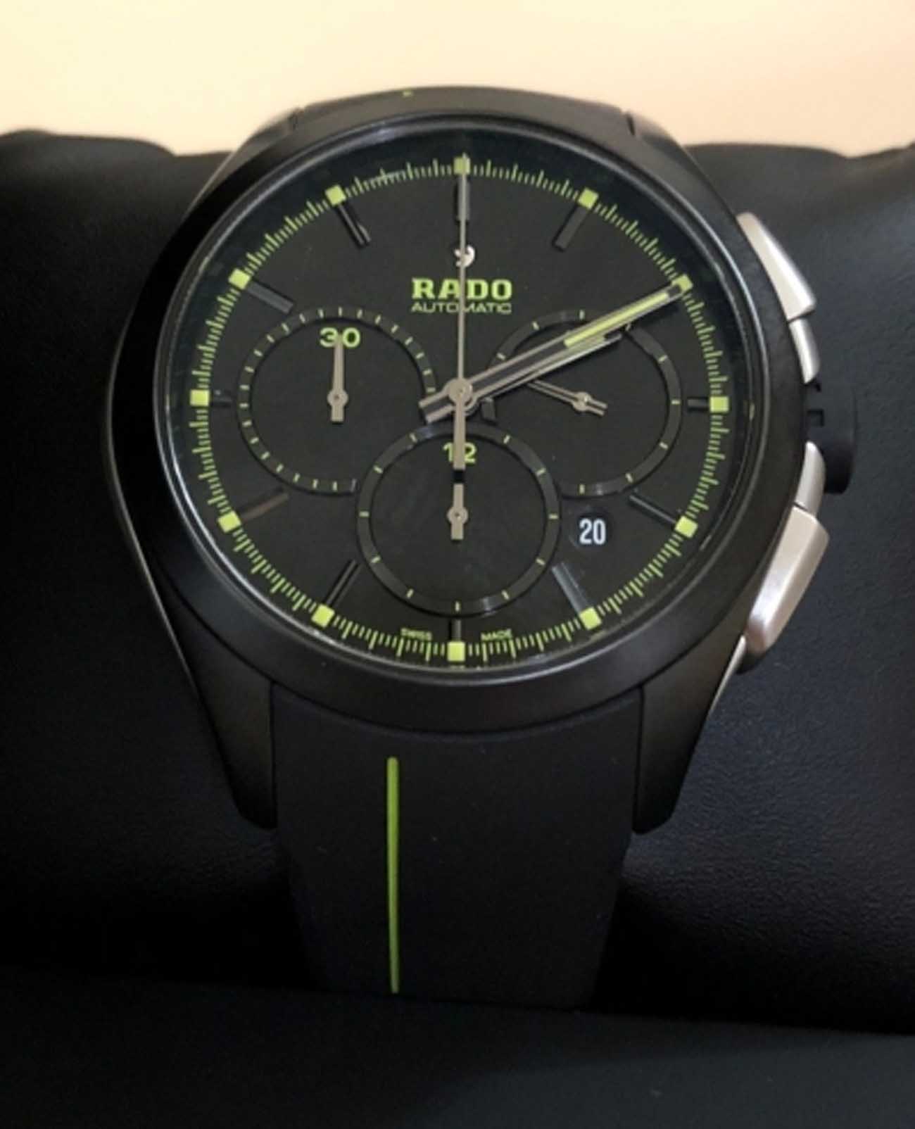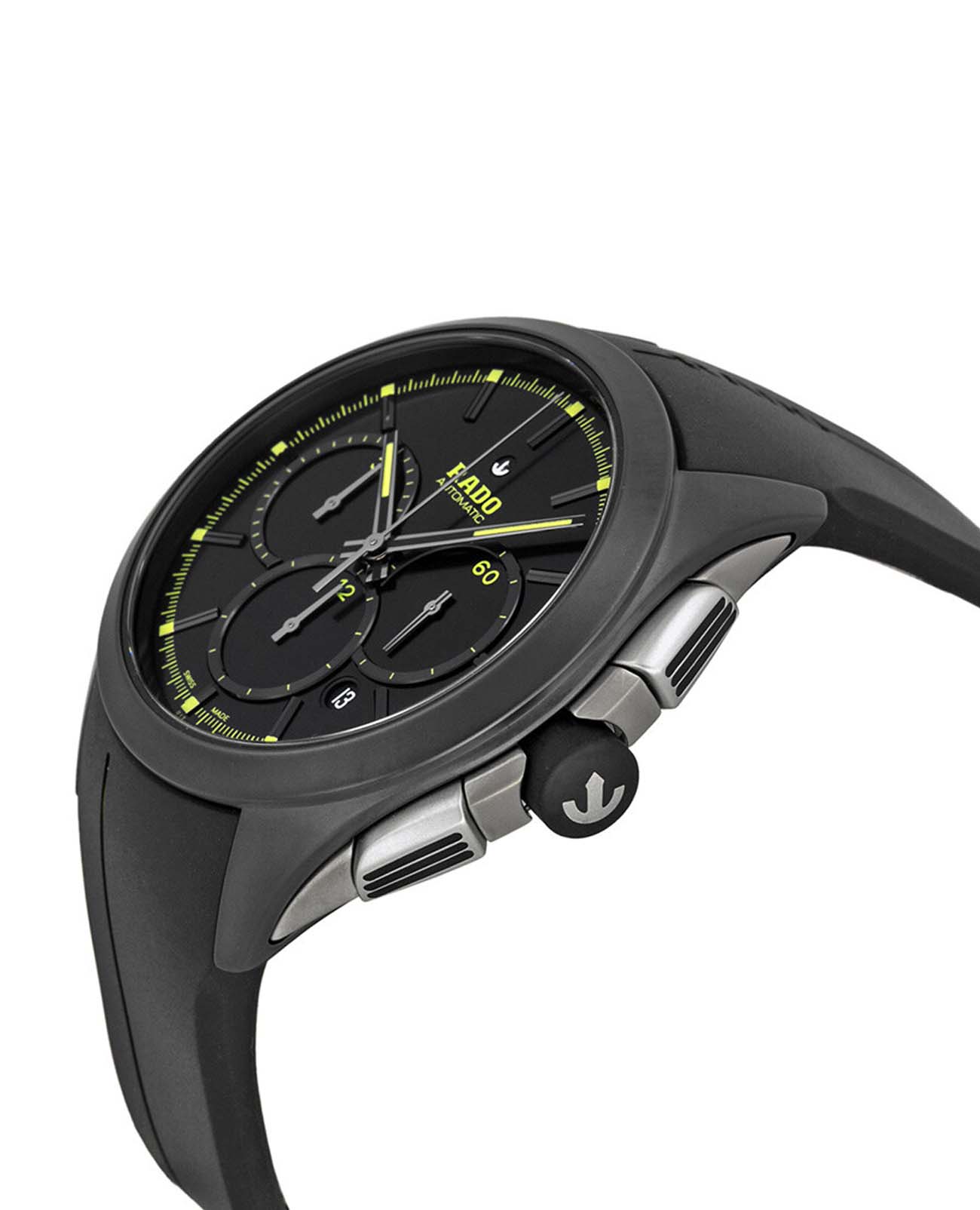 Мужские механические швейцарские часы- хронографХронографФункция позволяет измерять отрезки времени с особой точностью: часы, минуты, секунды. Верным признаком хронографа является наличие на циферблате 3 дополнительных окошек-счётчиков. с автоподзаводом Rado HyperChrome Automatic Chronograph R32525179. Сапфировое стеклоСапфировое стеклоПрочный и надёжный материал из кристалла сапфира синтетического происхождения, характеризующийся особой твёрдостью и устойчивостью к царапинам и повреждениям. устойчивое к мелким механическим повреждениям. Корпус часов изготовлен из высокотехнологичной керамикиВысокотехнологичная керамикаИнновационный запатентованный Rado материал с гладкой или матовой поверхностью. Керамика за счёт кристаллической структуры обладает повышенной устойчивостью от возникновения царапин. Материал способен принимать температуру тела человека, обеспечивая невероятный комфорт при ношении.. Окошко даты находится в положении между 4 и 5 часами. Стрелки с люминесцентным покрытиемЛюминесцентное покрытиеПозволяет считывать показания времени в темноте. Производители наносят на стрелки, часовые индексы, безель или поверхность циферблата светонакопительный состав, дающий холодное свечение.. Класс водозащиты: 100 метров, позволит плавать, нырять и заниматься другими водными видами спорта. Каучуковый ремешок на раскладной застёжкеРаскладная застёжкаТакой тип застёжки используется только на браслетах из металла. Она никогда не раскрывается полностью, происходит разделение на 2 и более частей. Раскладывающая застёжка снизит вероятность потери часов к минимуму..