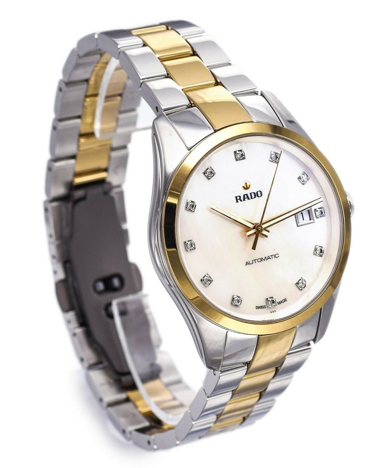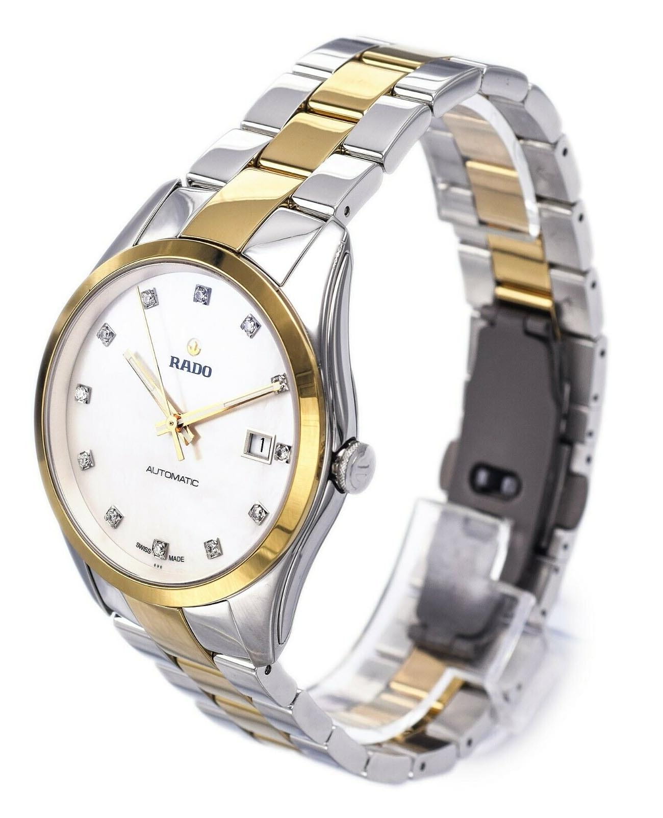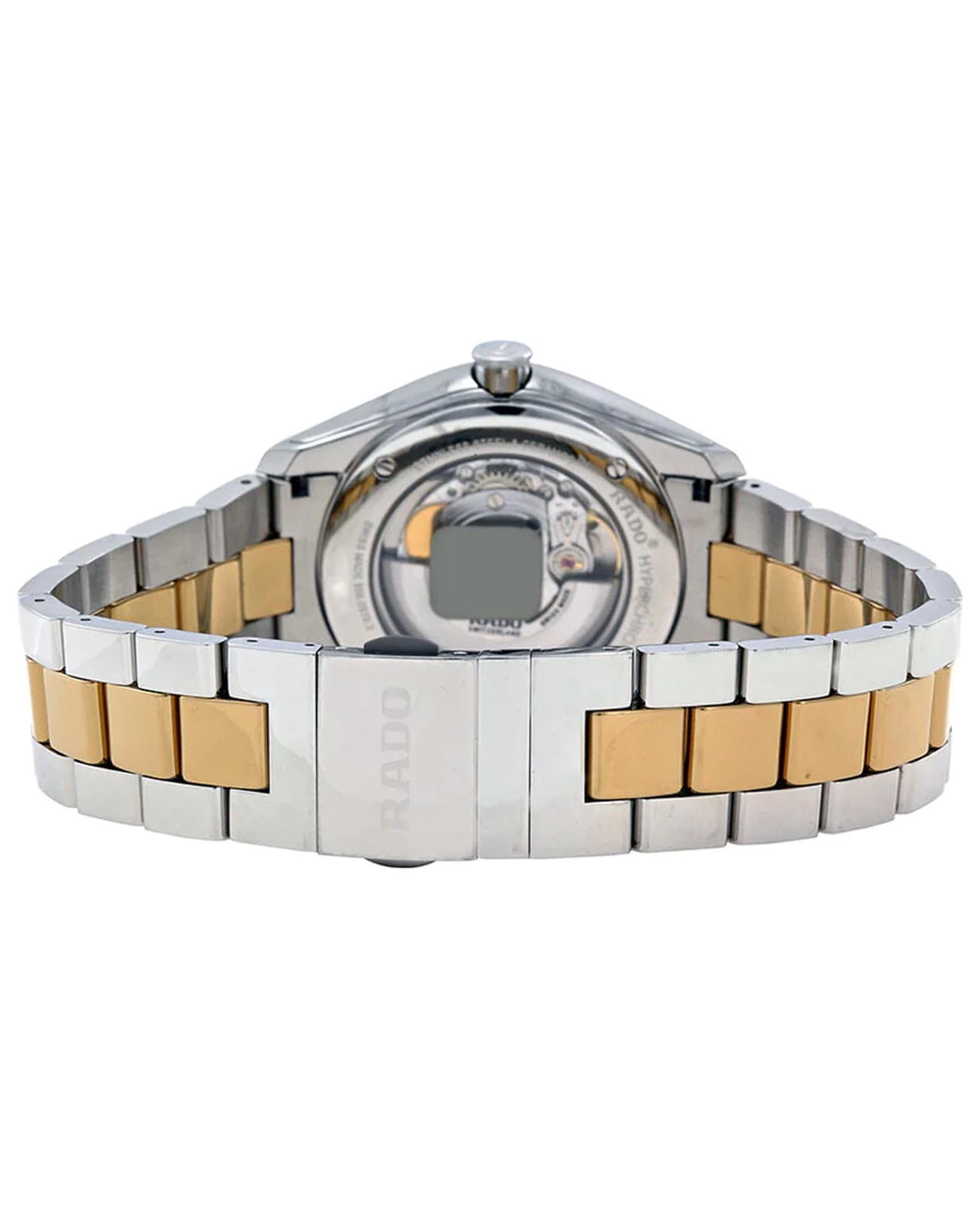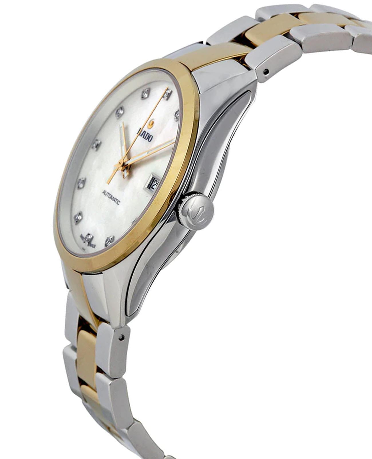Женские швейцарские механические часы с автоподзаводом Rado Hyperchrome R32979902. Сапфировое стеклоСапфировое стеклоПрочный и надёжный материал из кристалла сапфира синтетического происхождения, характеризующийся особой твёрдостью и устойчивостью к царапинам и повреждениям. устойчивое к мелким механическим повреждениям. Корпус часов изготовлен из нержавеющей стали. Стальной браслет с частичным PVD-покрытиемPVDУльтратонкое покрытие наносится в технике вакуумного напыления, сочетает в себе нитрид титана особой прочности со слоем золота или оксида хрома. Несёт в себе декоративную или защитную функцию. на раскладной застёжкеРаскладная застёжкаТакой тип застёжки используется только на браслетах из металла. Она никогда не раскрывается полностью, происходит разделение на 2 и более частей. Раскладывающая застёжка снизит вероятность потери часов к минимуму.. Окошко даты находится в положении 3 часа. Класс водозащиты: 50 метров, позволит защитить корпус от случайных брызг или капель дождя. Циферблат инкрустирован бриллиантами.