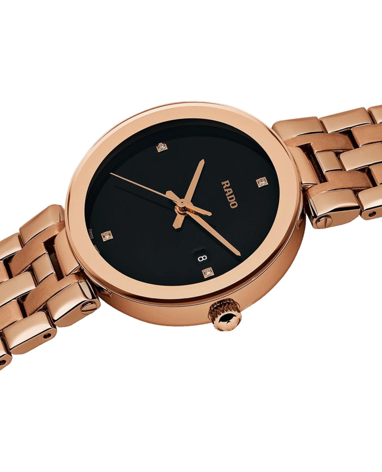 Женские швейцарские кварцевые часы Rado Florence R48893713. Сапфировое стеклоСапфировое стеклоПрочный и надёжный материал из кристалла сапфира синтетического происхождения, характеризующийся особой твёрдостью и устойчивостью к царапинам и повреждениям. устойчивое к мелким механическим повреждениям. Стальной браслет на застёжке-бабочке. Корпус и браслет часов изготовлены из нержавеющей стали с PVD-покрытиемPVDУльтратонкое покрытие наносится в технике вакуумного напыления, сочетает в себе нитрид титана особой прочности со слоем золота или оксида хрома. Несёт в себе декоративную или защитную функцию.. Окошко даты находится в положении 3 часа. Класс водозащиты: 30 метров, позволит защитить корпус от случайных брызг или капель дождя. Циферблат инкрустирован бриллиантами.