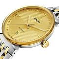 Универсальные механические часы с автоподзаводом Rado из коллекции Florence — это воплощение швейцарской точности и элегантности. Корпус диаметром 39 мм и толщиной 11 мм выполнен из нержавеющей стали. Циферблат золотистого цвета с рельефным узором оформлен накладными индексами и подвижным якорем бренда — символом Rado. Циферблат защищён сапфировым стекломСапфировое стеклоПрочный и надёжный материал из кристалла сапфира синтетического происхождения, характеризующийся особой твёрдостью и устойчивостью к царапинам и повреждениям. с антибликовым покрытиемАнтибликовое покрытиеСлой оксида металла в 0,13-0,3 микрон, благодаря которому стекло часов не бликует и не отражает свет. Антибликовое покрытие уменьшает отражение света в 10 раз, обеспечивая отличную читаемость показателей циферблата., которое одновременно выполняет функцию безеляБезельВнешний ободок, закрепляющий стекло. В спортивных часах так называется поворотное кольцо с делениями на циферблате, выполняет роль таймера – замеряет отрезки времени на шкале. Неподвижный безель – элемент декора. Однонаправленно вращающийся безель на дайверских часах позволяет фиксировать моменты погружения и выныривания на поверхность. с PVD-покрытиемPVDУльтратонкое покрытие наносится в технике вакуумного напыления, сочетает в себе нитрид титана особой прочности со слоем золота или оксида хрома. Несёт в себе декоративную или защитную функцию. жёлтого золота. Механизм — автоматический калибр R763 с пружиной Nivachron™Nivachron™Специально разработанный инновационный сплав Nivachron™ повышает устойчивость часов к воздействию магнитных полей., отрегулированный в пяти положениях, с запасом хода 80 часов. Окошко даты расположено в положении 3 часов. Прозрачная задняя крышка с сапфировым стеклом позволяет наблюдать за работой механизма. Завинчивающаяся коронка обеспечивает дополнительную защиту. Часы оснащены двухцветным стальным браслетом с PVD-покрытиемPVDУльтратонкое покрытие наносится в технике вакуумного напыления, сочетает в себе нитрид титана особой прочности со слоем золота или оксида хрома. Несёт в себе декоративную или защитную функцию. жёлтого золота и трёхсекционной застёжкой из нержавеющей стали. Водонепроницаемость 50 м позволяет использовать часы в повседневных условиях. Идеальный выбор для тех, кто ценит мастерство, стиль и универсальность.
