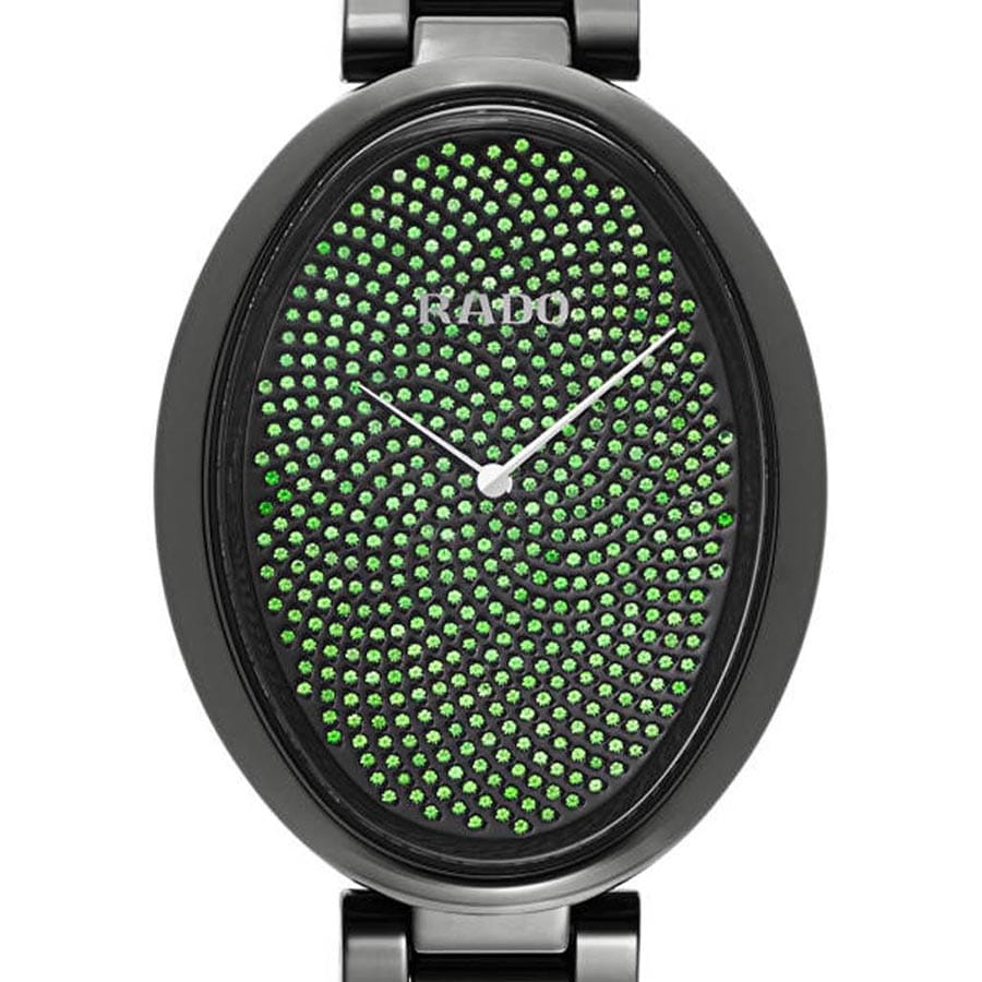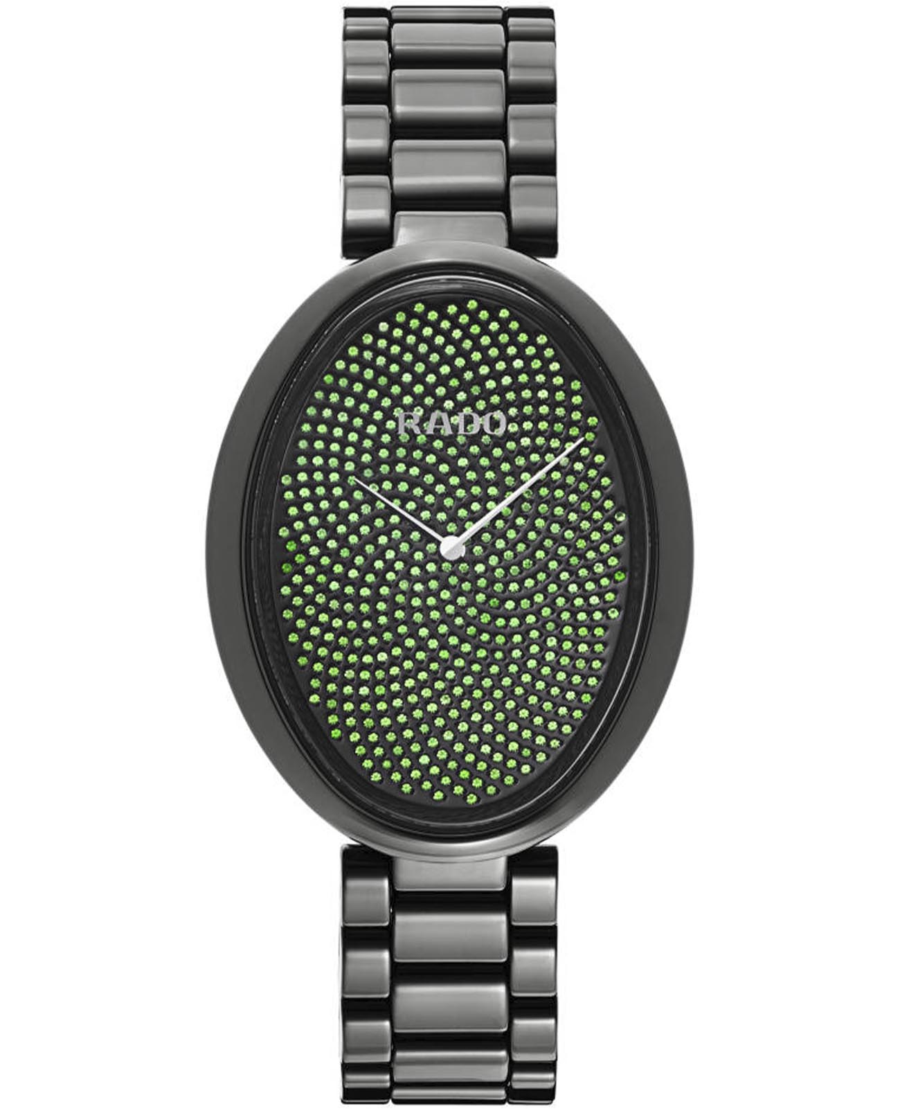 Женские керамические швейцарские часы с бриллиантами Rado Esenza R53094732, кварцевый механизм с высокой точностью. Сапфировое стеклоСапфировое стеклоПрочный и надёжный материал из кристалла сапфира синтетического происхождения, характеризующийся особой твёрдостью и устойчивостью к царапинам и повреждениям. устойчивое к появлению царапин, обладающее высокой прозрачностью. Класс водозащиты: 30 метров, позволит защитить корпус от случайных брызг или капель дождя. Корпус и браслет часов изготовлены из высокотехнологичной керамикиВысокотехнологичная керамикаИнновационный запатентованный Rado материал с гладкой или матовой поверхностью. Керамика за счёт кристаллической структуры обладает повышенной устойчивостью от возникновения царапин. Материал способен принимать температуру тела человека, обеспечивая невероятный комфорт при ношении.. Браслет на раскладной застёжкеРаскладная застёжкаТакой тип застёжки используется только на браслетах из металла. Она никогда не раскрывается полностью, происходит разделение на 2 и более частей. Раскладывающая застёжка снизит вероятность потери часов к минимуму.. Циферблат декорирован зелеными цаворитами .801 карат.