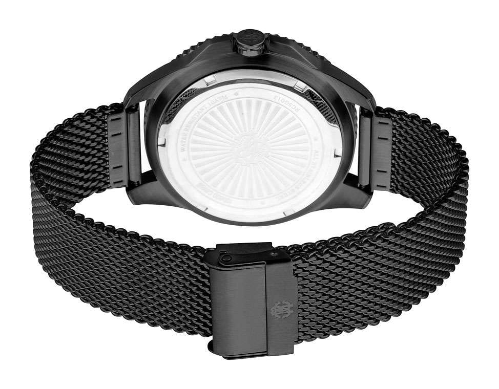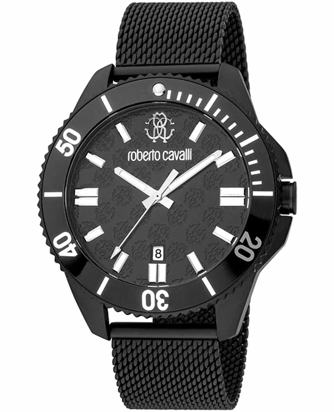ROBERTO CAVALLI Uomo Sport RC5G013M0075 — стильные итальянские часы сочетающие в себе элегантность и современный функционал. Круглый корпус диаметром 44 мм выполнен из нержавеющей стали с PVD-покрытиемPVDУльтратонкое покрытие наносится в технике вакуумного напыления, сочетает в себе нитрид титана особой прочности со слоем золота или оксида хрома. Несёт в себе декоративную или защитную функцию., толщина корпуса составляет 11 мм, что придает модели выразительный внешний вид и надежную защиту от внешних воздействий. Часы оснащены кварцевым механизмом, также обладают функцией отображения даты, что делает их удобными для ежедневного использования. Минеральное стеклоМинеральное стеклоМинеральное стекло представляет собой искусственно выращенный минерал кварца. Такое стекло отличается особой устойчивостью к повреждениям и царапинам. Уступает по некоторым качествам сапфировому стеклу. защищает часы от царапин. Водозащита 100 метров, позволит плавать, нырять и заниматься другими водными видами спорта. Стальной браслет миланского плетения на раскладной застёжкеРаскладная застёжкаТакой тип застёжки используется только на браслетах из металла. Она никогда не раскрывается полностью, происходит разделение на 2 и более частей. Раскладывающая застёжка снизит вероятность потери часов к минимуму. обеспечивает комфортное ношение. БезельБезельВнешний ободок, закрепляющий стекло. В спортивных часах так называется поворотное кольцо с делениями на циферблате, выполняет роль таймера – замеряет отрезки времени на шкале. Неподвижный безель – элемент декора. Однонаправленно вращающийся безель на дайверских часах позволяет фиксировать моменты погружения и выныривания на поверхность. с PVD-покрытиемPVDУльтратонкое покрытие наносится в технике вакуумного напыления, сочетает в себе нитрид титана особой прочности со слоем золота или оксида хрома. Несёт в себе декоративную или защитную функцию.. Стрелки и метки с люминесцентным покрытиемЛюминесцентное покрытиеПозволяет считывать показания времени в темноте. Производители наносят на стрелки, часовые индексы, безель или поверхность циферблата светонакопительный состав, дающий холодное свечение. обеспечивают отличную читаемость в любое время суток.