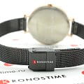 Брендовый аксессуар в стиле fashion отличается эксклюзивным оформлением, над которым работал знаменитый европейский дизайнер Вольфганг Джонсон. Чёрный циферблат с золотистыми стрелками и метками имеет оригинальный узор посередине, по окружности он украшен сияющими цирконами. Привлекательно смотрится браслет плетения Mesh. Кварцевый механизм с высокой точностью хода. Минеральное стекло противостоит образованию царапин. Цветное PVD-покрытиеPVDУльтратонкое покрытие наносится в технике вакуумного напыления, сочетает в себе нитрид титана особой прочности со слоем золота или оксида хрома. Несёт в себе декоративную или защитную функцию. нержавеющей стали. Водонепроницаемость 30 метров. Диаметр корпуса: 34 мм.