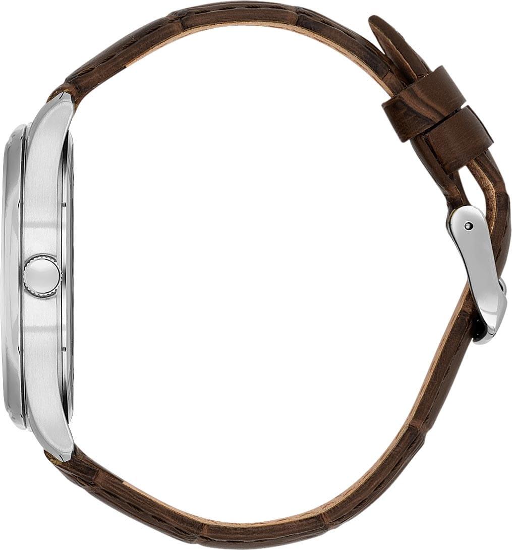 Часы защищены минеральным стекломМинеральное стеклоМинеральное стекло представляет собой искусственно выращенный минерал кварца. Такое стекло отличается особой устойчивостью к повреждениям и царапинам. Уступает по некоторым качествам сапфировому стеклу., а точность хода гарантирует кварцевый механизм. Эта модель сочетает в себе классику и практичность, делая её универсальной — как для делового костюма, так и для повседневного образа.