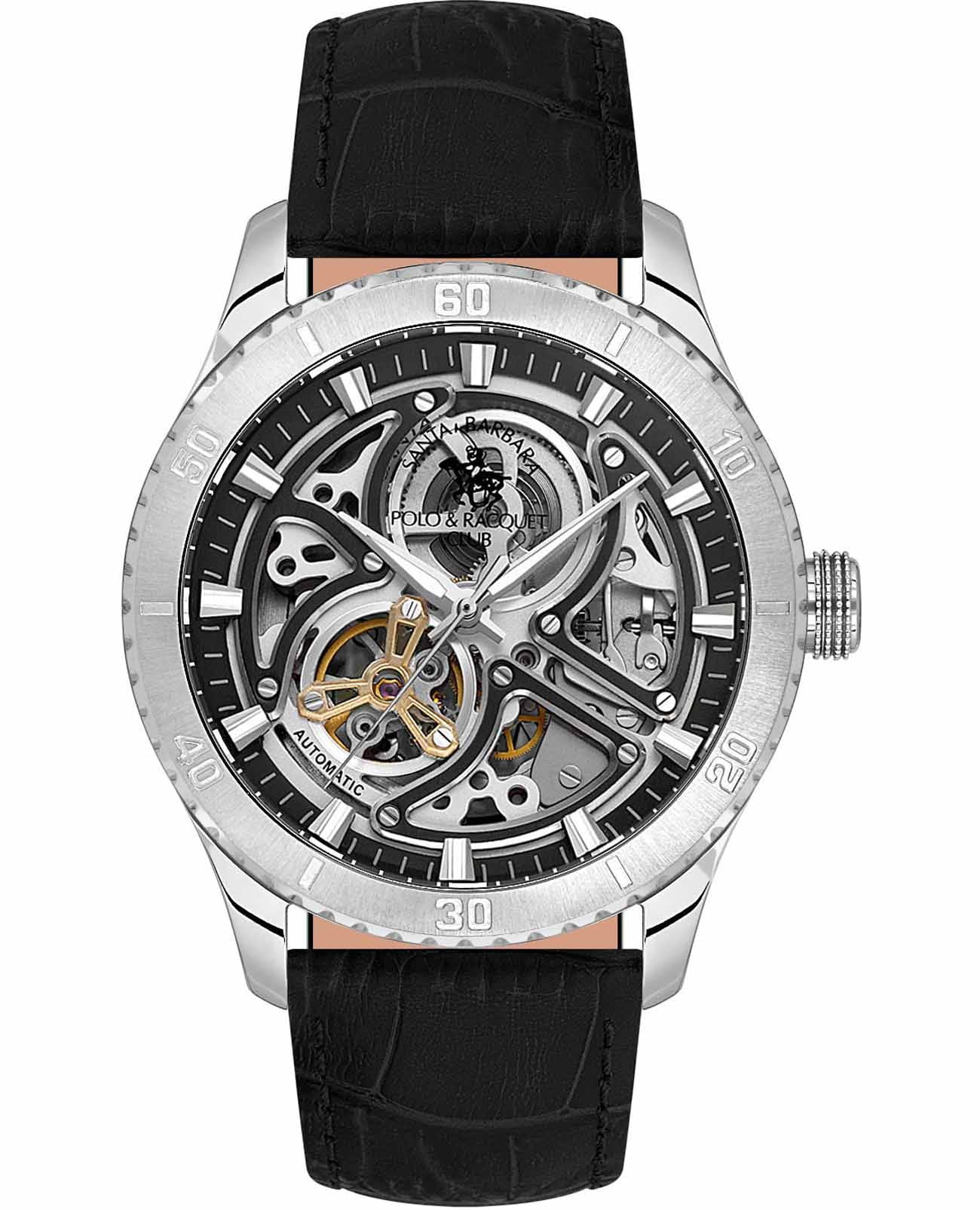 Мужские механические часы с автоподзаводом Santa Barbara Polo & Racquet Club Luxury SB.1.10573-1 — это стильный и функциональный аксессуар для современного джентльмена. Изысканный корпус из стали 316L  диаметром 42.5 мм. Изящный скелетонизированный циферблат украшен фирменным логотипом, с метками. Накладные лаконичные метки и стрелки с люминесцентным покрытиемЛюминесцентное покрытиеПозволяет считывать показания времени в темноте. Производители наносят на стрелки, часовые индексы, безель или поверхность циферблата светонакопительный состав, дающий холодное свечение., обеспечивающим хорошую читаемость в темноте. Циферблат защищён минеральным стекломМинеральное стеклоМинеральное стекло представляет собой искусственно выращенный минерал кварца. Такое стекло отличается особой устойчивостью к повреждениям и царапинам. Уступает по некоторым качествам сапфировому стеклу., устойчивым к царапинам и механическим повреждениям. Надежный кожаный ремешок на стандартной застёжке обеспечивает комфортное и безопасное ношение. Водонепроницаемость 50 м позволяет использовать часы в повседневных условиях. Идеальный выбор для тех, кто ценит элегантность, точность и надёжность.