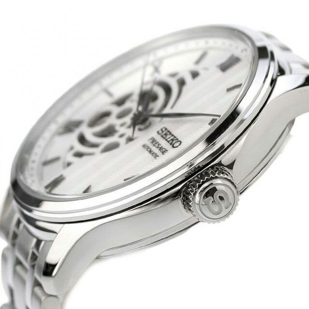Модель Seiko SARY251 из коллекции Presage — это утончённые автоматические часы, вдохновлённые эстетикой японского сада и классическим часовым искусством. Корпус диаметром 41,8 мм выполнен из нержавеющей стали с зеркальной полировкой и оснащён прозрачной задней крышкой. Водозащита составляет 30 метров — надёжно для повседневного ношения. Фиксированный безельБезельВнешний ободок, закрепляющий стекло. В спортивных часах так называется поворотное кольцо с делениями на циферблате, выполняет роль таймера – замеряет отрезки времени на шкале. Неподвижный безель – элемент декора. Однонаправленно вращающийся безель на дайверских часах позволяет фиксировать моменты погружения и выныривания на поверхность. из стали подчёркивает изящные линии корпуса. Главный акцент — серебристый циферблат с текстурой, напоминающей гравий в японском саду. Открытое окно «open heart» на 9 часах позволяет наблюдать за работой баланса. Циферблат защищён выпуклым сапфировым стекломСапфировое стеклоПрочный и надёжный материал из кристалла сапфира синтетического происхождения, характеризующийся особой твёрдостью и устойчивостью к царапинам и повреждениям., устойчивым к царапинам. Внутри установлен автоматический механизм Seiko 4R71 с функцией ручного подзавода, остановкой секундной стрелки и запасом хода около 41 часа. Браслет из нержавеющей стали с 5-звеньевой конструкцией снабжён надёжной застёжкой «бабочка» с кнопкамиЗастёжка "бабочка"Такой вид застёжки дополняется предохранителями, помогающими избежать случайного раскрытия браслета. Обладают изящным исполнением. . Seiko SARY251 — это гармоничное сочетание японского эстетизма, классического дизайна и механической надёжности в стильных повседневных часах.