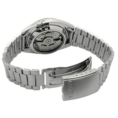 Мужские японские часы с запасом хода 41 час Seiko 5 Regular SNXS79K1 с минеральным стекломМинеральное стеклоМинеральное стекло представляет собой искусственно выращенный минерал кварца. Такое стекло отличается особой устойчивостью к повреждениям и царапинам. Уступает по некоторым качествам сапфировому стеклу. повышенной прочности Hardlex, механический механизм (автоматический калибр) с высокой точностью. Класс водозащиты: 30 метров, позволит защитить корпус от случайных брызг или капель дождя. Корпус и браслет часов изготовлен из стали. Браслет на раскладной застёжкеРаскладная застёжкаТакой тип застёжки используется только на браслетах из металла. Она никогда не раскрывается полностью, происходит разделение на 2 и более частей. Раскладывающая застёжка снизит вероятность потери часов к минимуму. с кнопками. Окошко даты и дня недели находятся в положении 3 часа. Заводная коронка находится на «4 часах». Стрелки и метки с люминесцентным покрытиемЛюминесцентное покрытиеПозволяет считывать показания времени в темноте. Производители наносят на стрелки, часовые индексы, безель или поверхность циферблата светонакопительный состав, дающий холодное свечение..