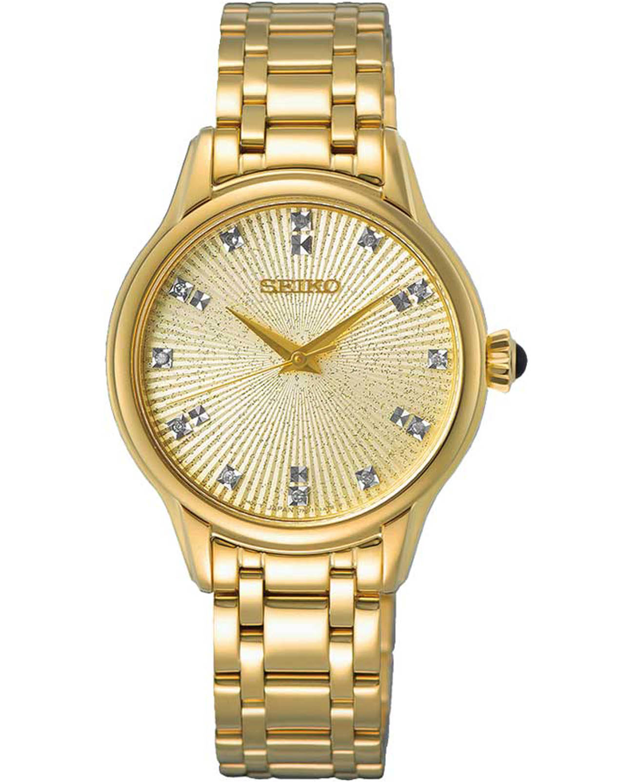 Женские японские часы Seiko Discover More SRZ552P1 c кварцевым механизмом с высокой точностью. Сапфировое стеклоСапфировое стеклоПрочный и надёжный материал из кристалла сапфира синтетического происхождения, характеризующийся особой твёрдостью и устойчивостью к царапинам и повреждениям., устойчивое к появлению царапин, обладающее высокой прозрачностью. Класс водозащиты: 50 метров, позволит плавать, нырять и заниматься другими водными видами спорта. Корпус и браслет часов изготовлен из стали с частичным PVDPVDУльтратонкое покрытие наносится в технике вакуумного напыления, сочетает в себе нитрид титана особой прочности со слоем золота или оксида хрома. Несёт в себе декоративную или защитную функцию. покрытием. Циферблат украшен кристаллами. Браслет с тройной раскладной застёжкойРаскладная застёжкаТакой тип застёжки используется только на браслетах из металла. Она никогда не раскрывается полностью, происходит разделение на 2 и более частей. Раскладывающая застёжка снизит вероятность потери часов к минимуму.. Seiko — это гармония изящного дизайна и технологичной надёжности, компактный и стильный выбор для повседневной классики.