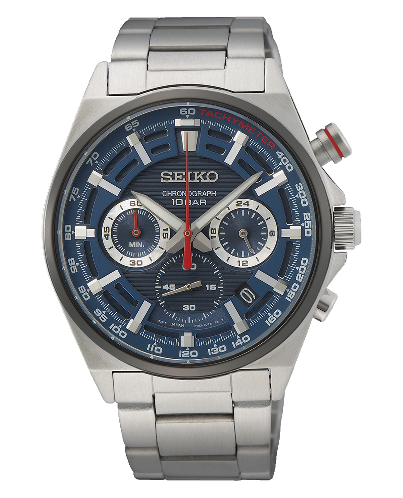 Мужские японские часы Seiko SSB407P1 c хронографомХронографФункция позволяет измерять отрезки времени с особой точностью: часы, минуты, секунды. Верным признаком хронографа является наличие на циферблате 3 дополнительных окошек-счётчиков., кварцевый механизм с высокой точностью. Минеральное стеклоМинеральное стеклоМинеральное стекло представляет собой искусственно выращенный минерал кварца. Такое стекло отличается особой устойчивостью к повреждениям и царапинам. Уступает по некоторым качествам сапфировому стеклу., устойчивое к появлению царапин, обладающее высокой прозрачностью. Класс водозащиты: 100 метров, позволит плавать, нырять и заниматься другими водными видами спорта. Корпус и браслет часов изготовлен из стали. Неподвижный безельБезельВнешний ободок, закрепляющий стекло. В спортивных часах так называется поворотное кольцо с делениями на циферблате, выполняет роль таймера – замеряет отрезки времени на шкале. Неподвижный безель – элемент декора. Однонаправленно вращающийся безель на дайверских часах позволяет фиксировать моменты погружения и выныривания на поверхность. со шкалой тахиметраТахиметрРазмеченная шкала, располагается на ободке или безеле часов. Тахиметр позволяет рассчитать скорость на определённом участке пути, расстояние измеряется в километрах или милях.. Стрелки и метки с люминесцентным покрытиемЛюминесцентное покрытиеПозволяет считывать показания времени в темноте. Производители наносят на стрелки, часовые индексы, безель или поверхность циферблата светонакопительный состав, дающий холодное свечение. LumiBrite. Браслет на раскладной застёжкеРаскладная застёжкаТакой тип застёжки используется только на браслетах из металла. Она никогда не раскрывается полностью, происходит разделение на 2 и более частей. Раскладывающая застёжка снизит вероятность потери часов к минимуму. с кнопками. СекундомерСекундомерСекундоме́р — прибор, способный измерять интервалы времени с точностью до долей секунды.. Окошко даты находится в положении между 4 и 5 часов.