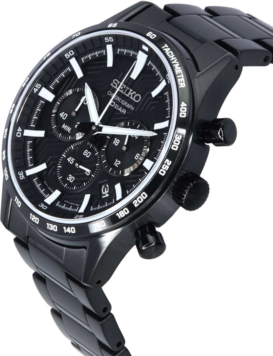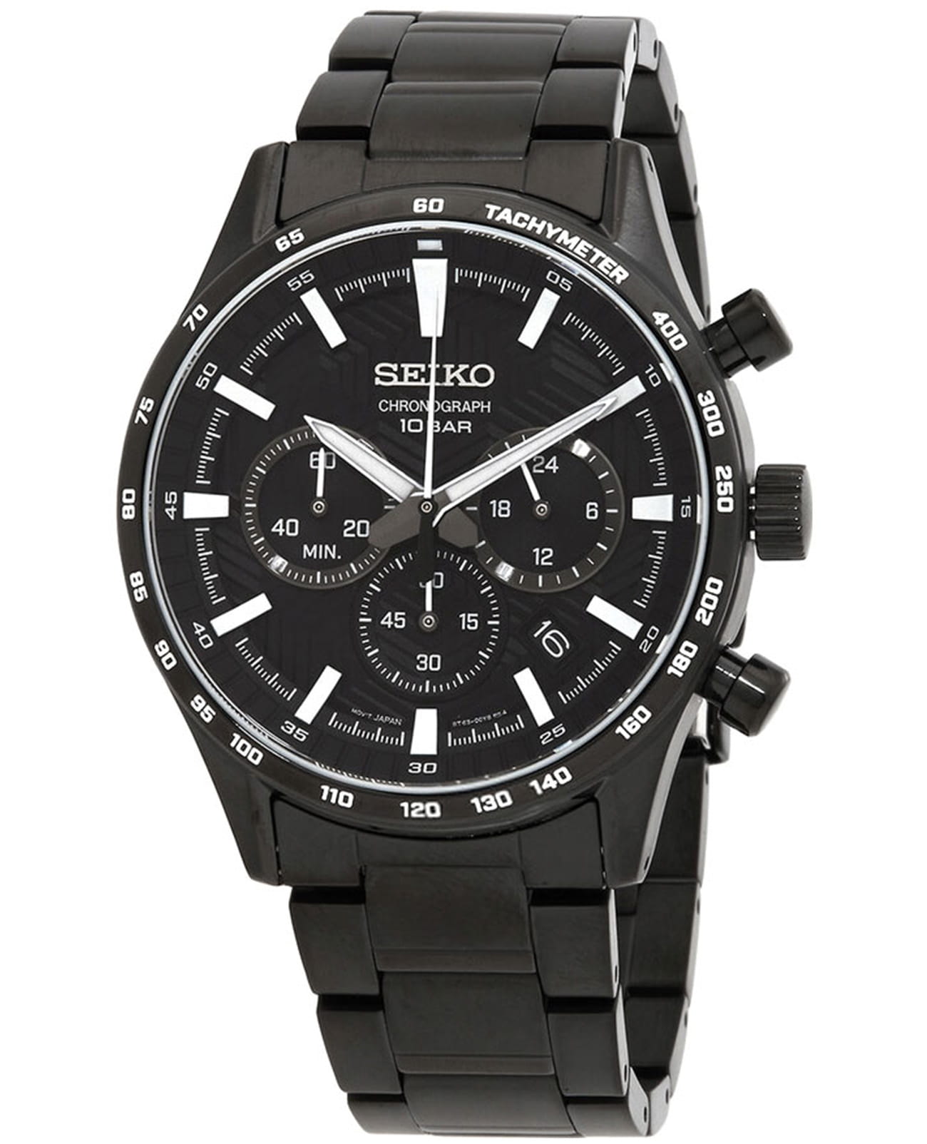 Мужские японские часы Seiko Conceptual Series Sports SSB415P1 c хронографомХронографФункция позволяет измерять отрезки времени с особой точностью: часы, минуты, секунды. Верным признаком хронографа является наличие на циферблате 3 дополнительных окошек-счётчиков., кварцевый механизм с высокой точностью. Сапфировое стеклоСапфировое стеклоПрочный и надёжный материал из кристалла сапфира синтетического происхождения, характеризующийся особой твёрдостью и устойчивостью к царапинам и повреждениям., устойчивое к появлению царапин, обладающее высокой прозрачностью. Класс водозащиты: 100 метров, позволит плавать, нырять и заниматься другими водными видами спорта. Корпус и браслет часов изготовлен из сталис PVD-покрытиемPVDУльтратонкое покрытие наносится в технике вакуумного напыления, сочетает в себе нитрид титана особой прочности со слоем золота или оксида хрома. Несёт в себе декоративную или защитную функцию.. Неподвижный безельБезельВнешний ободок, закрепляющий стекло. В спортивных часах так называется поворотное кольцо с делениями на циферблате, выполняет роль таймера – замеряет отрезки времени на шкале. Неподвижный безель – элемент декора. Однонаправленно вращающийся безель на дайверских часах позволяет фиксировать моменты погружения и выныривания на поверхность. со шкалой тахиметраТахиметрРазмеченная шкала, располагается на ободке или безеле часов. Тахиметр позволяет рассчитать скорость на определённом участке пути, расстояние измеряется в километрах или милях.. Стрелки и метки с люминесцентным покрытиемЛюминесцентное покрытиеПозволяет считывать показания времени в темноте. Производители наносят на стрелки, часовые индексы, безель или поверхность циферблата светонакопительный состав, дающий холодное свечение.. Браслет на раскладной застёжкеРаскладная застёжкаТакой тип застёжки используется только на браслетах из металла. Она никогда не раскрывается полностью, происходит разделение на 2 и более частей. Раскладывающая застёжка снизит вероятность потери часов к минимуму. с кнопками. СекундомерСекундомерСекундоме́р — прибор, способный измерять интервалы времени с точностью до долей секунды.. Окошко даты находится в положении между 4 и 5 часов.