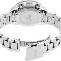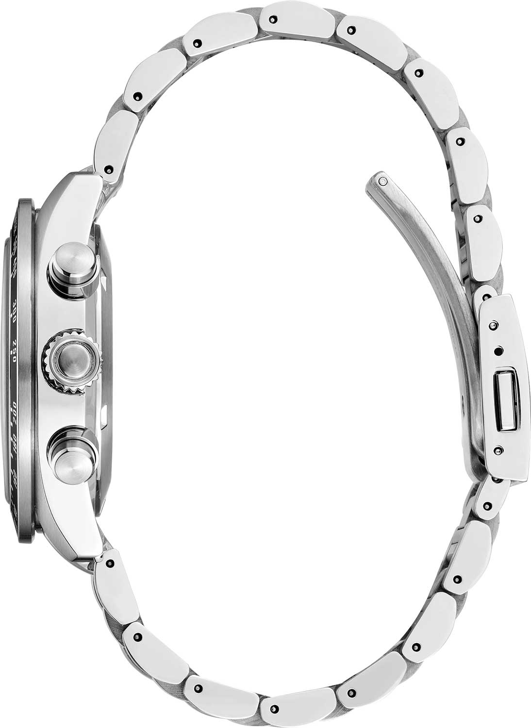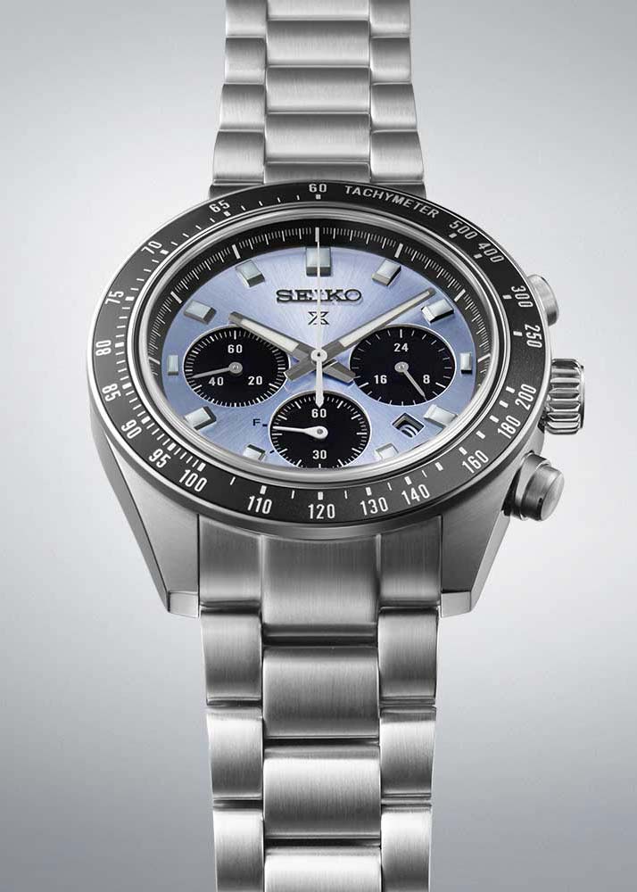 Модель Seiko SSC935P1 из коллекции Prospex Speedtimer — это спортивный солнечный хронограф с выразительным дизайном и высокой функциональностью. Корпус диаметром 41,4 мм выполнен из нержавеющей стали и оснащён завинчивающейся задней крышкой и заводной головкой, обеспечивая водозащиту до 100 метров. Фиксированный алюминиевый тахиметрический безельТахиметрРазмеченная шкала, располагается на ободке или безеле часов. Тахиметр позволяет рассчитать скорость на определённом участке пути, расстояние измеряется в километрах или милях. позволяет производить измерения скорости. Циферблат насыщенного голубого оттенка с солнечным финишем дополнен тремя чёрными счётчиками: 24-часовым, малой секундной стрелкой и хронографом на 60 минут. Стрелки и индексы покрыты люминесцентным покрытиемЛюминесцентное покрытиеПозволяет считывать показания времени в темноте. Производители наносят на стрелки, часовые индексы, безель или поверхность циферблата светонакопительный состав, дающий холодное свечение. LumiBrite для превосходной видимости в тёмное время суток. Защиту циферблата обеспечивает выпуклое сапфировое стеклоСапфировое стеклоПрочный и надёжный материал из кристалла сапфира синтетического происхождения, характеризующийся особой твёрдостью и устойчивостью к царапинам и повреждениям. с внутренним антибликовым покрытиемАнтибликовое покрытиеСлой оксида металла в 0,13-0,3 микрон, благодаря которому стекло часов не бликует и не отражает свет. Антибликовое покрытие уменьшает отражение света в 10 раз, обеспечивая отличную читаемость показателей циферблата., устойчивое к царапинам и бликам. Внутри установлен солнечный кварцевый калибр V192 с функциями хронографаХронографФункция позволяет измерять отрезки времени с особой точностью: часы, минуты, секунды. Верным признаком хронографа является наличие на циферблате 3 дополнительных окошек-счётчиков., индикацией 24 часов, даты и запаса хода. Полного заряда хватает до 6 месяцев автономной работы. Браслет из нержавеющей стали надёжно фиксируется при помощи раскладной застёжкиРаскладная застёжкаТакой тип застёжки используется только на браслетах из металла. Она никогда не раскрывается полностью, происходит разделение на 2 и более частей. Раскладывающая застёжка снизит вероятность потери часов к минимуму. с кнопками.