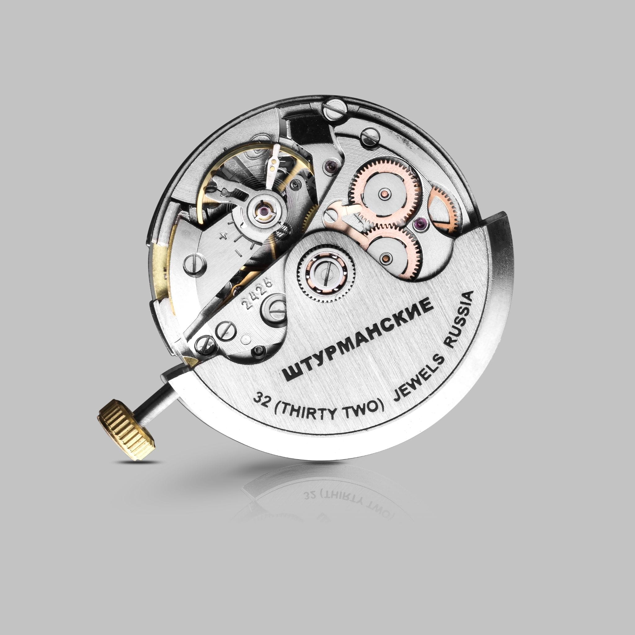 Мужские российские механические часы Штурманские 2426/4571144, механический механизм (автоматический калибр) с высокой точностью. Минеральное стеклоМинеральное стеклоМинеральное стекло представляет собой искусственно выращенный минерал кварца. Такое стекло отличается особой устойчивостью к повреждениям и царапинам. Уступает по некоторым качествам сапфировому стеклу. устойчивое к мелким механическим повреждениям. Класс водозащиты: 50 метров, позволит защитить корпус от случайных брызг или капель дождя. Корпус часов изготовлен из стали. Кожаный ремешок на стандартной застёжке. Чёткая, читаемая минутная шкала уходит за приделы видимой области циферблата, подчёркивая изящность ободка корпуса. Стрелки и метки с люминесцентным покрытиемЛюминесцентное покрытиеПозволяет считывать показания времени в темноте. Производители наносят на стрелки, часовые индексы, безель или поверхность циферблата светонакопительный состав, дающий холодное свечение.. Окошко даты находится в положении 3 часа.