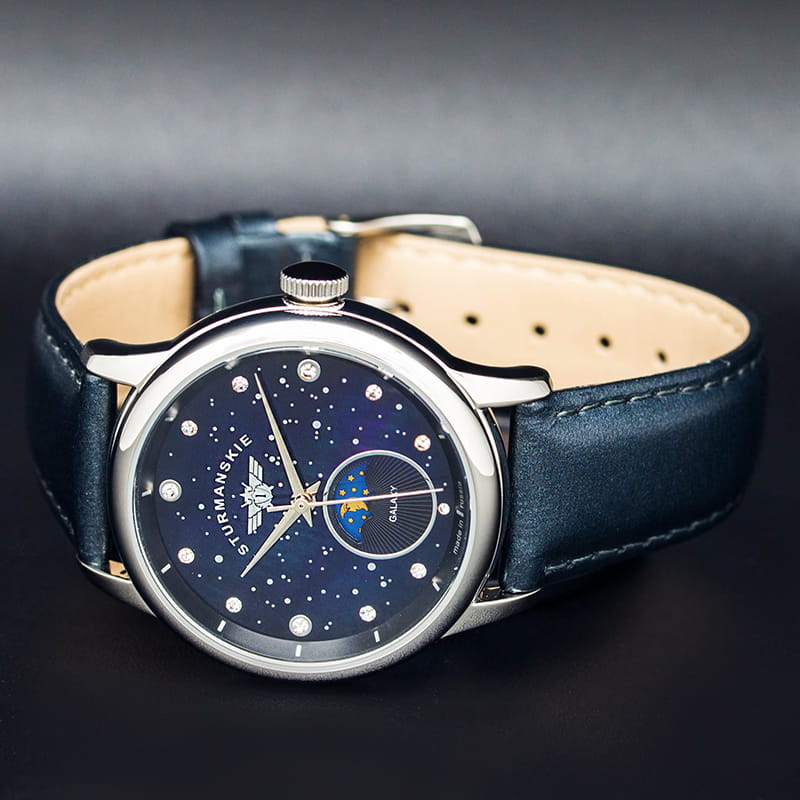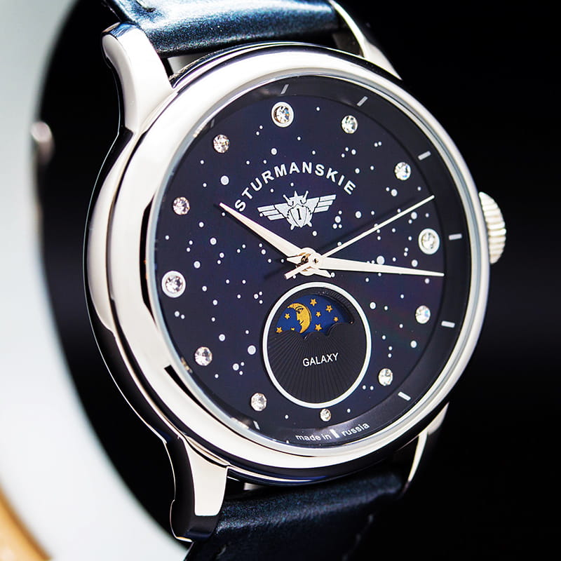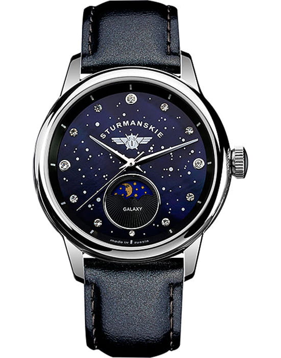 Женские российские кварцевые часы Штурманские 9231/5361193, с высокой точностью. Минеральное стеклоМинеральное стеклоМинеральное стекло представляет собой искусственно выращенный минерал кварца. Такое стекло отличается особой устойчивостью к повреждениям и царапинам. Уступает по некоторым качествам сапфировому стеклу. устойчивое к мелким механическим повреждениям. Класс водозащиты: 30 метров, позволит защитить корпус от случайных брызг или капель дождя. Корпус часов изготовлен из стали. Кожаный ремешок на стандартной застёжке. Чёткая, читаемая минутная шкала уходит за приделы видимой области циферблата, подчёркивая изящность ободка корпуса. Стрелки и метки с люминесцентным покрытиемЛюминесцентное покрытиеПозволяет считывать показания времени в темноте. Производители наносят на стрелки, часовые индексы, безель или поверхность циферблата светонакопительный состав, дающий холодное свечение.. Календарь фаз луны находится в положении 6 часов.