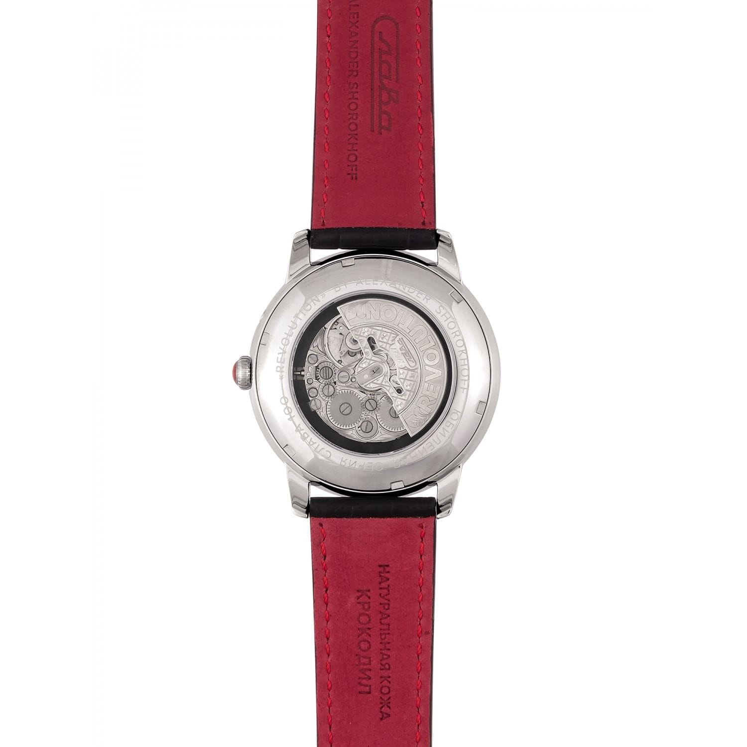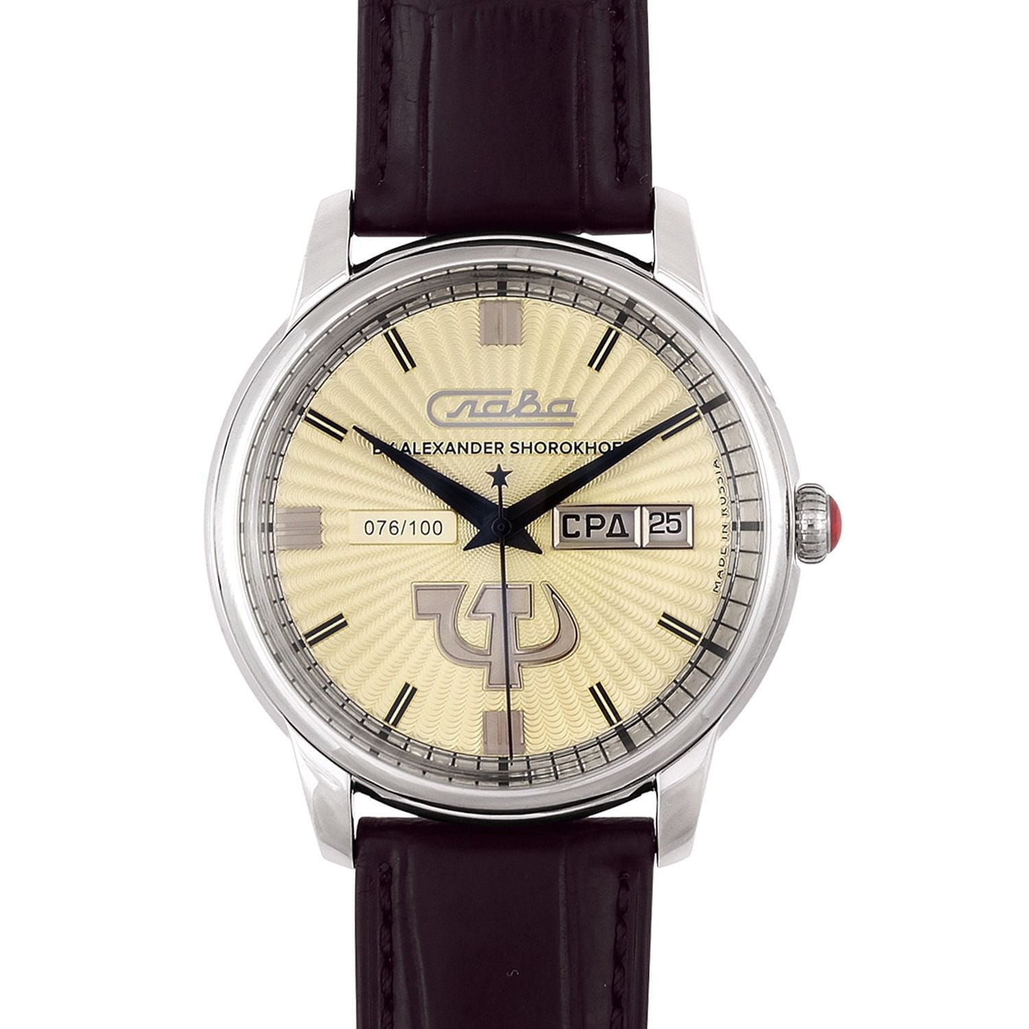 Российские механические часы с автоподзаводом Слава Революция 2600270/300-2427 созданы для тех, кто ценит стиль и надежность. Эта модель является плодом сотрудничества Часовой компании «Слава» и знаменитого мастера Александра Шорохова, который известен своим вкладом в возрождение российского часового мастерства и продвижение культуры в мире. Эти часы выполнены в соответствии с эскизами мастера, с использованием революционных символов — серпа и молота. Часы Слава «Революция» обладают механизмом с автоподзаводом «Слава 2427», украшенным ручной гравировкой, который можно наблюдать через прозрачную заднюю крышку. Этот механизм обеспечивает надежность и точность, а также добавляет элемент эксклюзивности. Корпус часов выполнен из стали и имеет серебристый оттенок, который гармонично сочетается с бежевым циферблатом. Диаметр корпуса составляет 44 мм, а толщина — 14,5 мм, что делает часы выразительными и комфортными для носки. Сапфировое стеклоСапфировое стеклоПрочный и надёжный материал из кристалла сапфира синтетического происхождения, характеризующийся особой твёрдостью и устойчивостью к царапинам и повреждениям. защищает циферблат от царапин и обеспечивает долгий срок службы. Часы оснащены функцией двойного календаря, который отображает дату, что добавляет практичности в повседневной носке. Натуральный кожаный ремешок с застежкой «бабочка»Застёжка "бабочка"Такой вид застёжки дополняется предохранителями, помогающими избежать случайного раскрытия браслета. Обладают изящным исполнением. завершают образ, обеспечивая удобство и стиль. С водонепроницаемостью до 100 метров эти часы подходят для активного образа жизни, позволяя не беспокоиться о случайных контактах с водой, таких как плавание или дождь. Слава «Революция» выпускаются ограниченной серией — в трех видах по 100 штук.