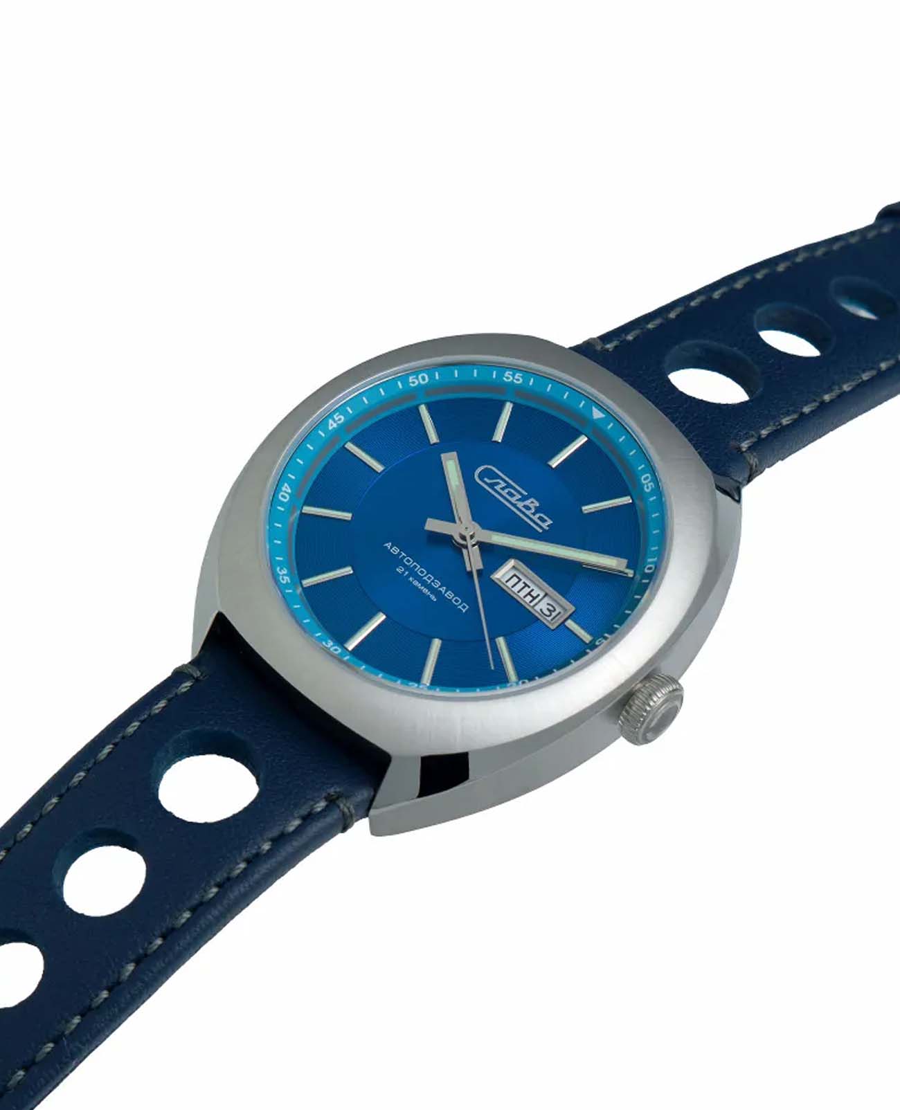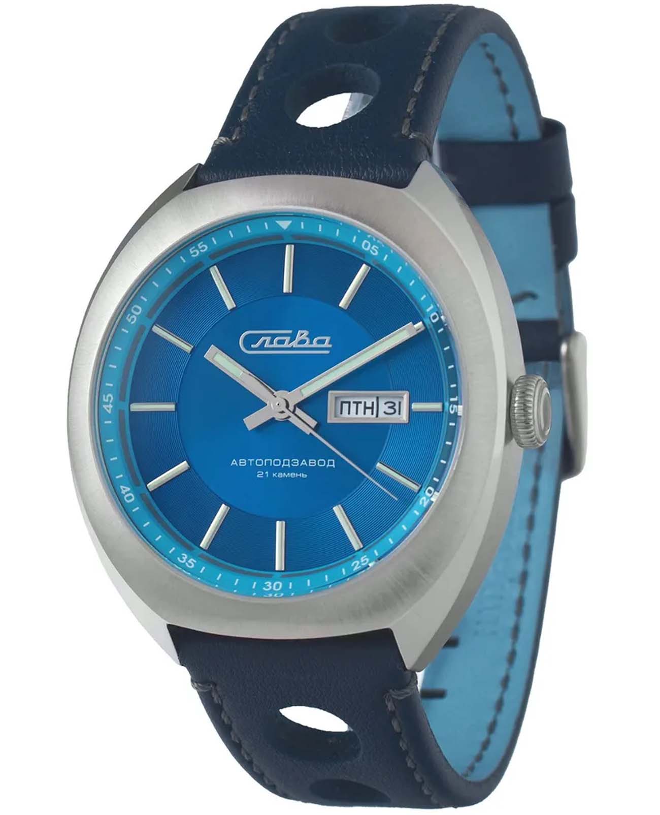 Класс водозащиты часов составляет 100 метров, позволит плавать, нырять и заниматься другими водными видами спорта. Эти часы идеально подойдут для повседневного использования, сочетая в себе стиль, надежность и функциональность. Стрелки и метки с люминесцентным покрытиемЛюминесцентное покрытиеПозволяет считывать показания времени в темноте. Производители наносят на стрелки, часовые индексы, безель или поверхность циферблата светонакопительный состав, дающий холодное свечение.. Окошки дня недели и даты находятся в положении 3 часа.