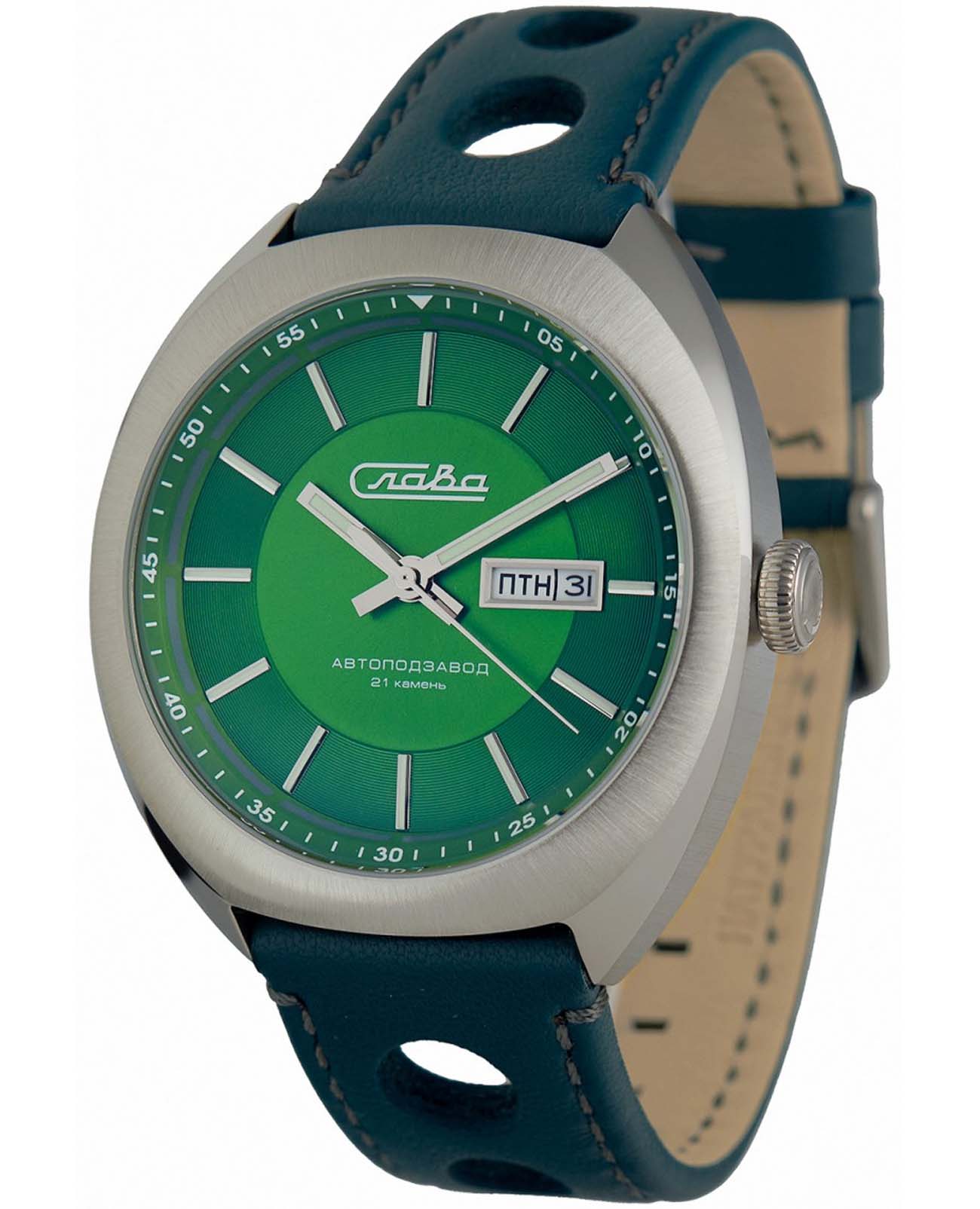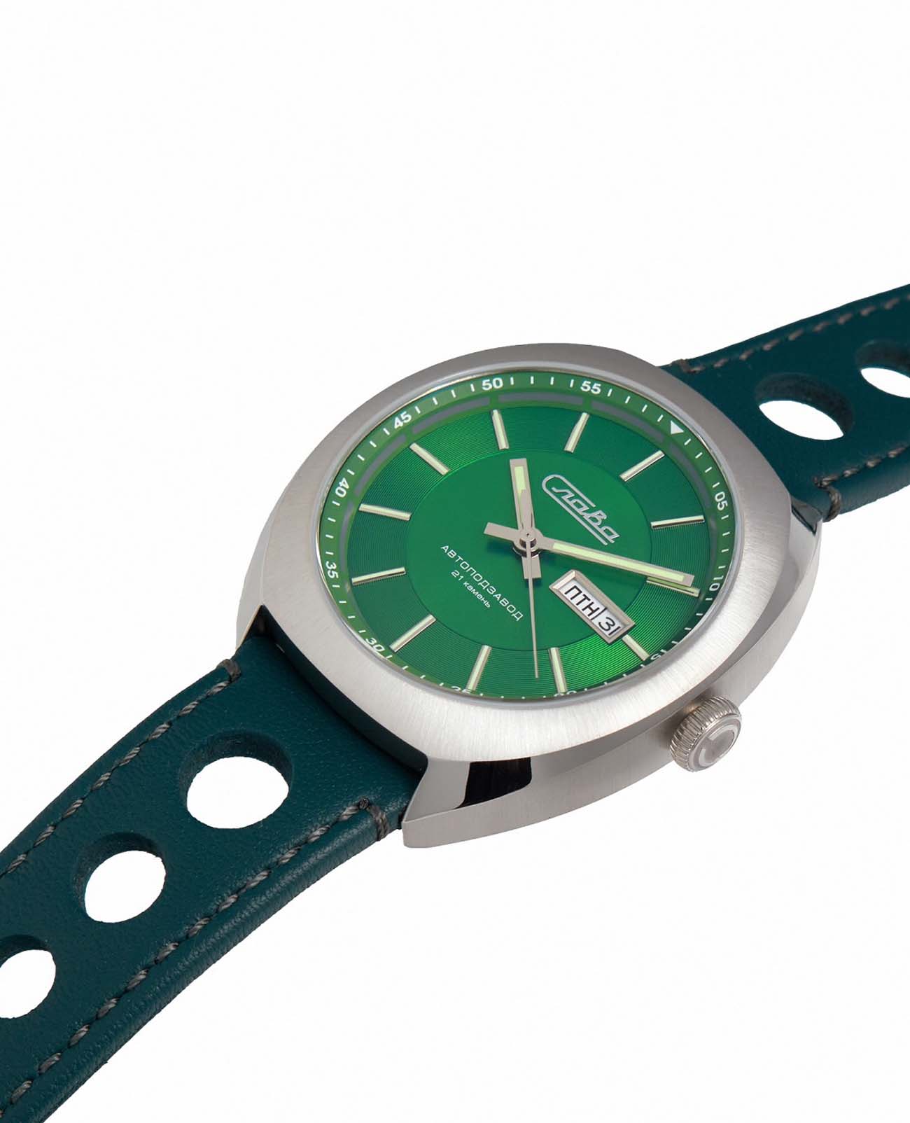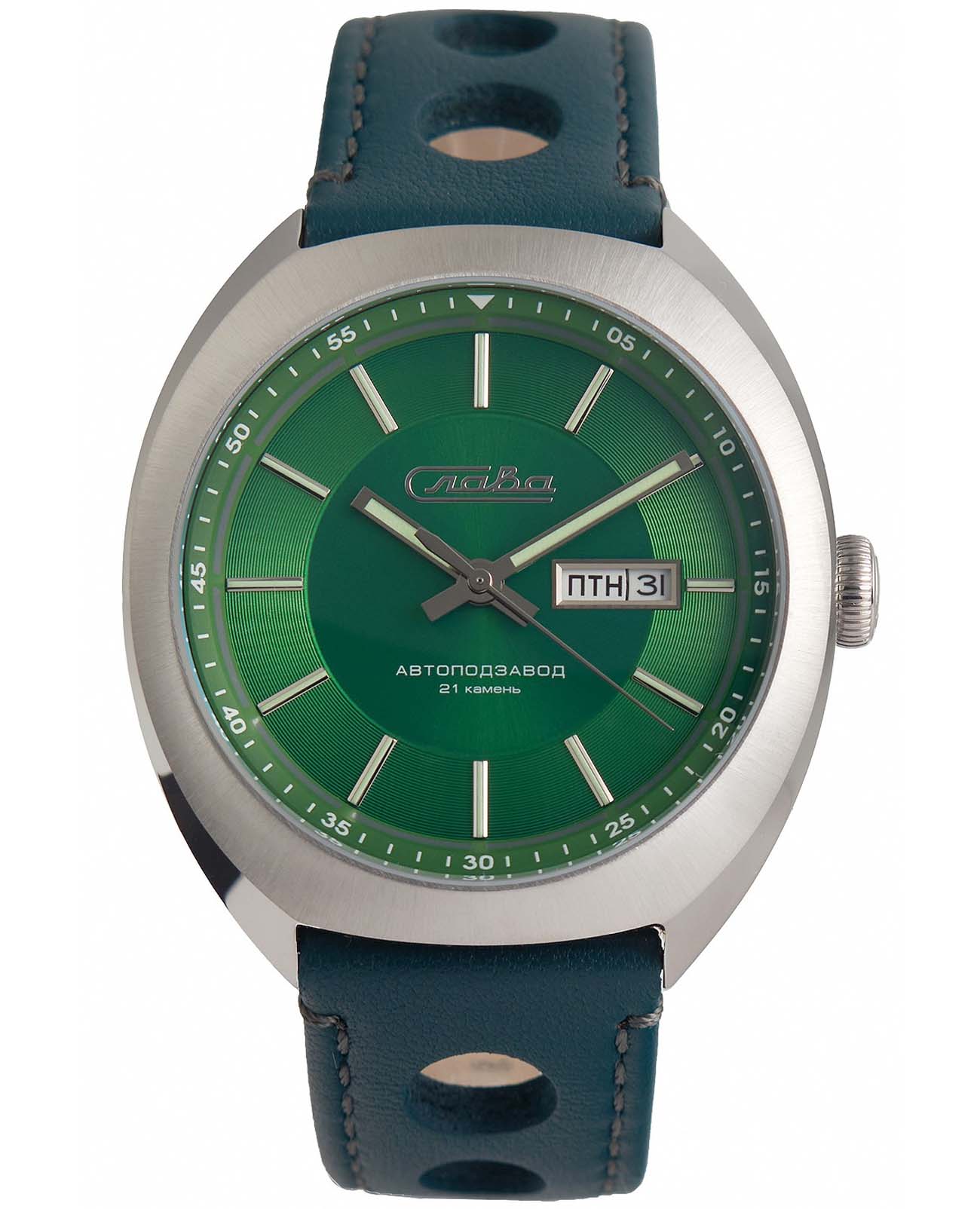 Класс водозащиты часов составляет 100 метров, позволит плавать, нырять и заниматься другими водными видами спорта. Эти часы идеально подойдут для повседневного использования, сочетая в себе стиль, надежность и функциональность. Стрелки и метки с люминесцентным покрытиемЛюминесцентное покрытиеПозволяет считывать показания времени в темноте. Производители наносят на стрелки, часовые индексы, безель или поверхность циферблата светонакопительный состав, дающий холодное свечение.. Окошки дня недели и даты находятся в положении 3 часа.