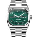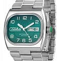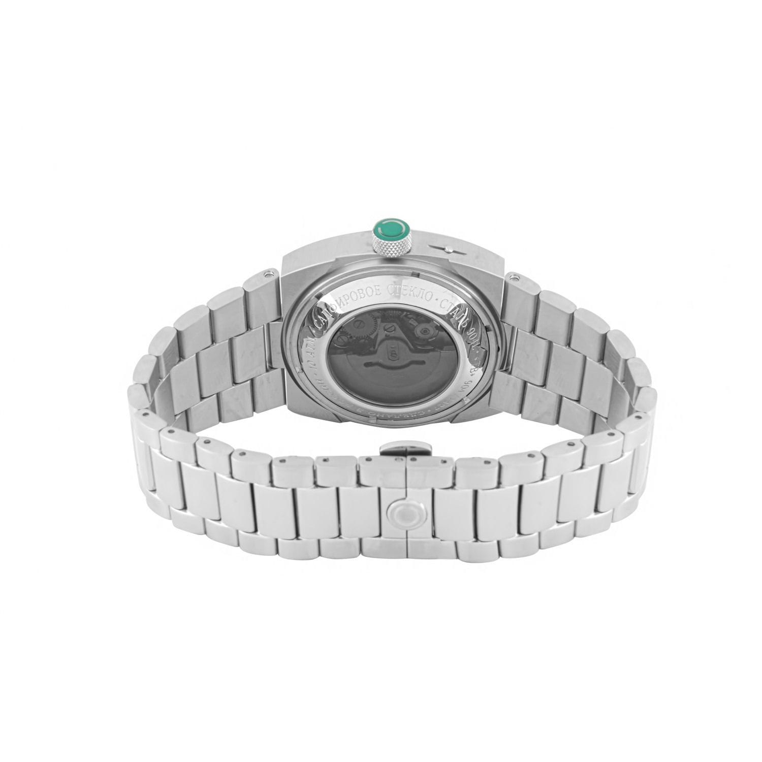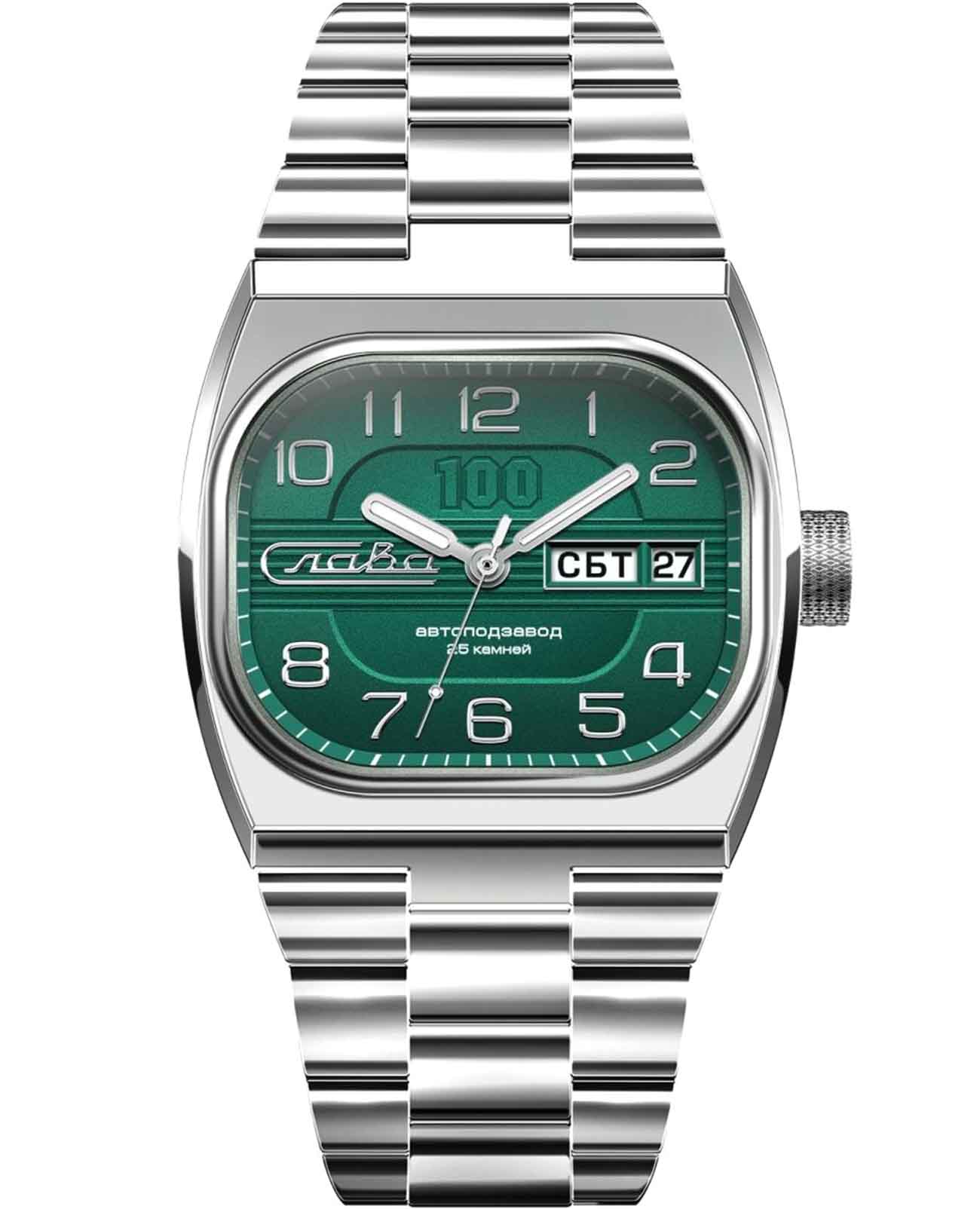 Российские часы Слава Телевизор 9040562/100-2427 оснащены механизмом Слава 2427, что обеспечивает исключительную надежность и точность хода. Корпус и браслет часов выполнены из стали, что придает им долговечность и устойчивость к внешним воздействиям. Сапфировое стеклоСапфировое стеклоПрочный и надёжный материал из кристалла сапфира синтетического происхождения, характеризующийся особой твёрдостью и устойчивостью к царапинам и повреждениям., которое еще и граненое, защищает зеленый циферблат от царапин. Водозащита уровня 100WR позволяет использовать часы в различных условиях. Эти часы идеально подойдут для повседневного использования, сочетая в себе стиль, надежность и функциональность. Стрелки с люминесцентным покрытиемЛюминесцентное покрытиеПозволяет считывать показания времени в темноте. Производители наносят на стрелки, часовые индексы, безель или поверхность циферблата светонакопительный состав, дающий холодное свечение., что облегчает чтение времени даже в условиях слабого освещения. Окошки дня недели и даты находятся в положении 3 часа. Стальной браслет на застежке «бабочка»Застёжка "бабочка"Такой вид застёжки дополняется предохранителями, помогающими избежать случайного раскрытия браслета. Обладают изящным исполнением. обеспечивает комфортное и надёжное крепление на запястье. Лимитированная серия ограничена 500 экземплярами, что подчеркивает их уникальность. Эти часы станут надежным спутником в вашей повседневной жизни.