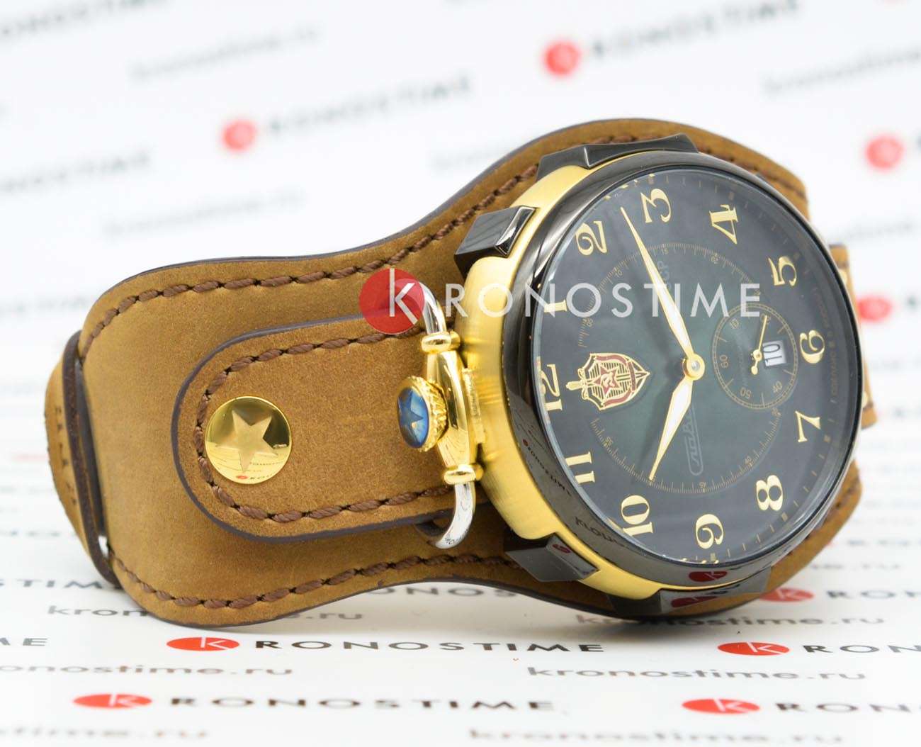 Модель 9624429/300-2555 от «Слава» — коллекционные механические часы с автоподзаводом, вдохновлённые эстетикой КГБ СССР. Корпус из нержавеющей стали с золотистым покрытием IP-покрытиемIP-покрытиеМетод ионного напыления. Демонстрирует повышенную устойчивость к истиранию, окислению и химическим веществам. Под воздействием высокого давления и температуры около 1500°C молекулы металла надёжно соединяются с частицами корпуса часов. и зелёный циферблат подчёркивают винтажный характер модели. Механизм SeaGull 2555 обеспечивает 42 часа запаса хода. Циферблат защищён минеральным стекломМинеральное стеклоМинеральное стекло представляет собой искусственно выращенный минерал кварца. Такое стекло отличается особой устойчивостью к повреждениям и царапинам. Уступает по некоторым качествам сапфировому стеклу., а натуральный кожаный ремешок на стандартной застежке обеспечивает комфортную посадку.