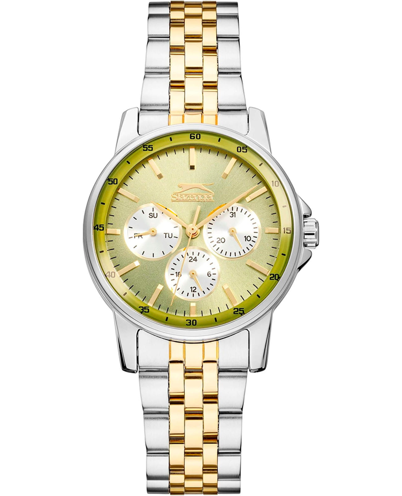 Женские наручные часы Slazenger SL.09.2009.4.09 представляют собой элегантное сочетание классического дизайна и функциональности современных технологий. Модель обладает круглым корпусом диаметром 36 мм, изготовленным из металлического сплава с IP-покрытиемIP-покрытиеМетод ионного напыления. Демонстрирует повышенную устойчивость к истиранию, окислению и химическим веществам. Под воздействием высокого давления и температуры около 1500°C молекулы металла надёжно соединяются с частицами корпуса часов., что обеспечивает высокую устойчивость к внешним воздействиям и привлекательный внешний вид. Интегрированный браслет на 5 звеньев с раскладной замокРаскладной замокДанный вариант застежки используется только на часах с металлическим браслетом. Отличительная особенность такого крепления в том, что длина браслета становится универсальной и вы можете самостоятельно отрегулировать нужный вам размер – застежка просто двигается по браслету часов. гарантирует комфортное ношение и безопасность . Зеленый циферблат дополнен тремя малыми циферблатами для отображения даты, дня недели и времени в формате 24 часа, а также защищен прочным минеральным стекломМинеральное стеклоМинеральное стекло представляет собой искусственно выращенный минерал кварца. Такое стекло отличается особой устойчивостью к повреждениям и царапинам. Уступает по некоторым качествам сапфировому стеклу.. Часы работают на кварцевом механизме, обеспечивающем точное время без необходимости подзаводки. Водонепроницаемость достигает 3 атмосфер (WR30), что позволяет использовать их в повседневной жизни, но не рекомендуется для плавания или водных видов спорта.