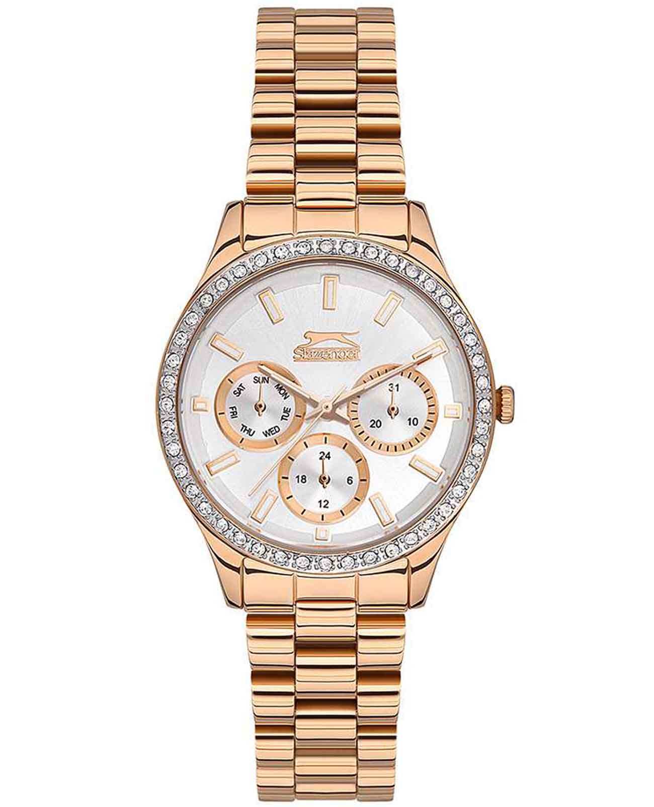 Женские наручные часы Slazenger SL.09.2069.4.04 сочетают в себе классический дизайн и высокое качество исполнения. Модель обладает круглым корпусом диаметром 34 мм, изготовленным из суперметалла IP-покрытиемIP-покрытиеМетод ионного напыления. Демонстрирует повышенную устойчивость к истиранию, окислению и химическим веществам. Под воздействием высокого давления и температуры около 1500°C молекулы металла надёжно соединяются с частицами корпуса часов. цвета розового золота, что обеспечивает устойчивость к внешним воздействиям. Браслет выполнен из суперметалла с IP-покрытиемIP-покрытиеМетод ионного напыления. Демонстрирует повышенную устойчивость к истиранию, окислению и химическим веществам. Под воздействием высокого давления и температуры около 1500°C молекулы металла надёжно соединяются с частицами корпуса часов. на раскладной застёжкеРаскладная застёжкаТакой тип застёжки используется только на браслетах из металла. Она никогда не раскрывается полностью, происходит разделение на 2 и более частей. Раскладывающая застёжка снизит вероятность потери часов к минимуму.. Неподвижный безельБезельВнешний ободок, закрепляющий стекло. В спортивных часах так называется поворотное кольцо с делениями на циферблате, выполняет роль таймера – замеряет отрезки времени на шкале. Неподвижный безель – элемент декора. Однонаправленно вращающийся безель на дайверских часах позволяет фиксировать моменты погружения и выныривания на поверхность. из суперметалла с IP-покрытиемIP-покрытиеМетод ионного напыления. Демонстрирует повышенную устойчивость к истиранию, окислению и химическим веществам. Под воздействием высокого давления и температуры около 1500°C молекулы металла надёжно соединяются с частицами корпуса часов. украшен кристаллами. Перламутровый циферблат оформлен логотипом бренда и метками времени. Имеются дополнительные малые циферблаты для отображения даты, дня недели и текущего времени в 24-часовом формате. Для защиты используется минеральное стеклоМинеральное стеклоМинеральное стекло представляет собой искусственно выращенный минерал кварца. Такое стекло отличается особой устойчивостью к повреждениям и царапинам. Уступает по некоторым качествам сапфировому стеклу., обеспечивающее прочную защиту от царапин. Стрелки и метки имеют люминесцентное покрытиеЛюминесцентное покрытиеПозволяет считывать показания времени в темноте. Производители наносят на стрелки, часовые индексы, безель или поверхность циферблата светонакопительный состав, дающий холодное свечение., что позволяет легко читать время в темноте. Часы работают на японском кварцевом механизме, который обеспечивает точность хода без необходимости подзаводки. Водонепроницаемость часов составляет 3 атмосферы (WR30), что позволяет защитить корпус от случайных брызг или капель дождя.