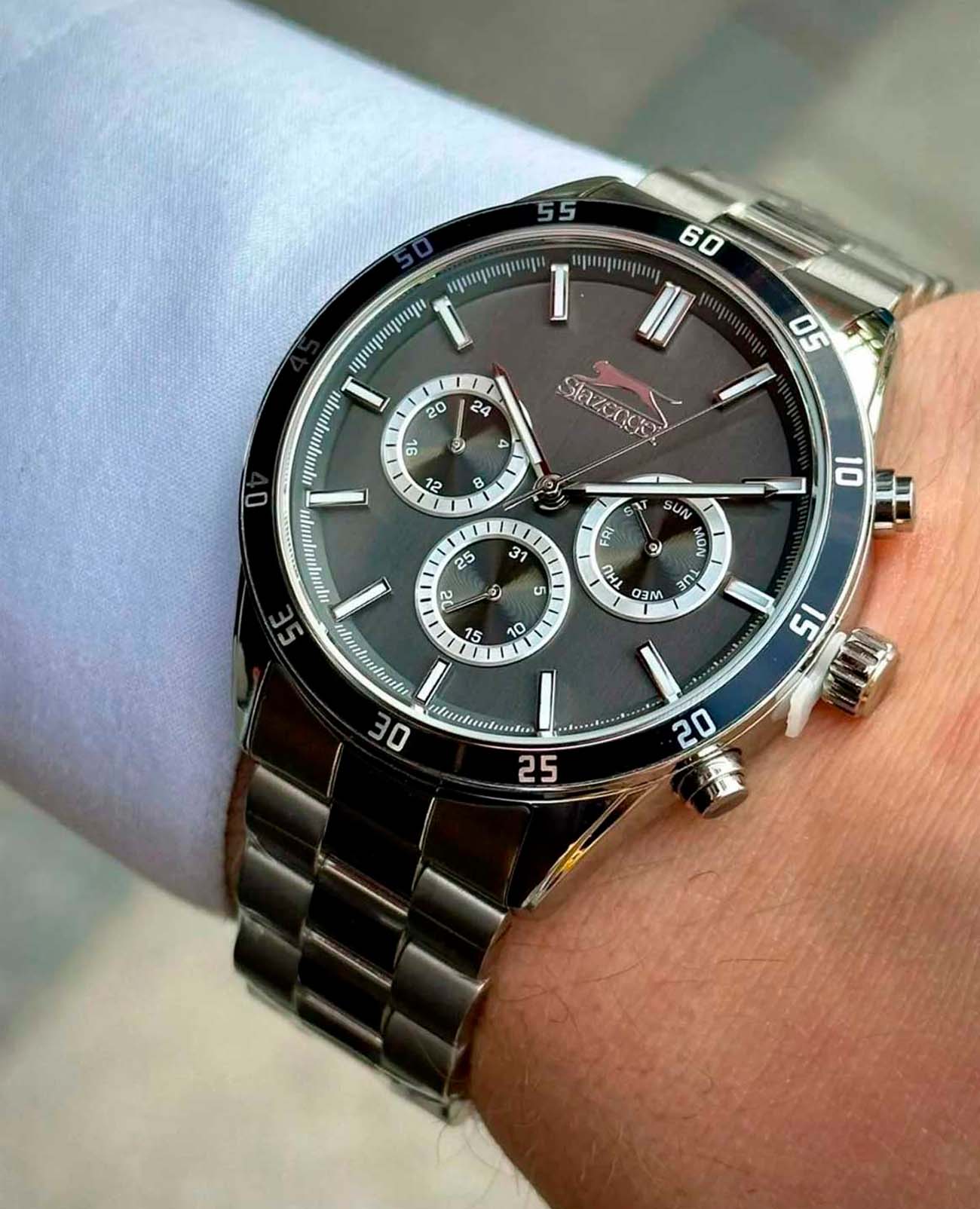Мужские наручные часы Slazenger SL.09.2109.2.04 сочетают в себе классический дизайн и надежность современных технологий. Модель обладает круглым корпусом диаметром 45 мм, изготовленным из нержавеющей стали, что обеспечивает высокую устойчивость к внешним воздействиям. Браслет выполнен из металла суперметалл с раскладной застежкойРаскладной замокДанный вариант застежки используется только на часах с металлическим браслетом. Отличительная особенность такого крепления в том, что длина браслета становится универсальной и вы можете самостоятельно отрегулировать нужный вам размер – застежка просто двигается по браслету часов., гарантирующей комфортное ношение и безопасность. Циферблат черного цвета декорирован стрелками с люминесцентным покрытиемЛюминесцентное покрытиеПозволяет считывать показания времени в темноте. Производители наносят на стрелки, часовые индексы, безель или поверхность циферблата светонакопительный состав, дающий холодное свечение., которые обеспечивают читаемость времени даже при недостаточной освещенности, а также дополнен малыми циферблатами для отображения даты, дня недели и текущего времени в 24-часовом формате. Для защиты используется минеральное стеклоМинеральное стеклоМинеральное стекло представляет собой искусственно выращенный минерал кварца. Такое стекло отличается особой устойчивостью к повреждениям и царапинам. Уступает по некоторым качествам сапфировому стеклу., обеспечивающее прочную защиту от царапин. БезельБезельВнешний ободок, закрепляющий стекло. В спортивных часах так называется поворотное кольцо с делениями на циферблате, выполняет роль таймера – замеряет отрезки времени на шкале. Неподвижный безель – элемент декора. Однонаправленно вращающийся безель на дайверских часах позволяет фиксировать моменты погружения и выныривания на поверхность. с IP-покрытиемIP-покрытиеМетод ионного напыления. Демонстрирует повышенную устойчивость к истиранию, окислению и химическим веществам. Под воздействием высокого давления и температуры около 1500°C молекулы металла надёжно соединяются с частицами корпуса часов.. Часы работают на кварцевом механизме, что гарантирует точное время без необходимости подзаводки. Водонепроницаемость часов достигает 5 атмосфер (WR50), что позволяет использовать их во время плавания, однако они не предназначены для дайвинга или других водных видов спорта. Толщина модели составляет 12 мм. SL.09.2109.2.04 — это стильный аксессуар, который станет отличным дополнением как формального, так и casual образа мужчины.