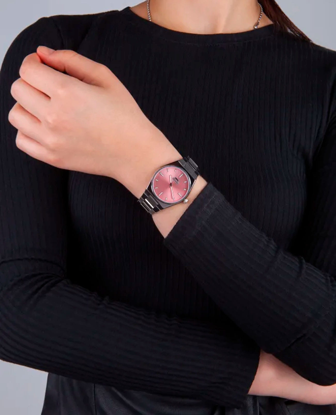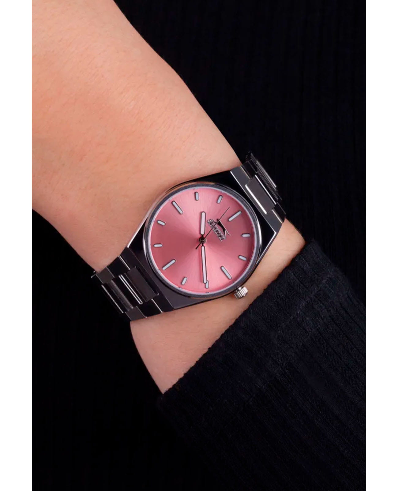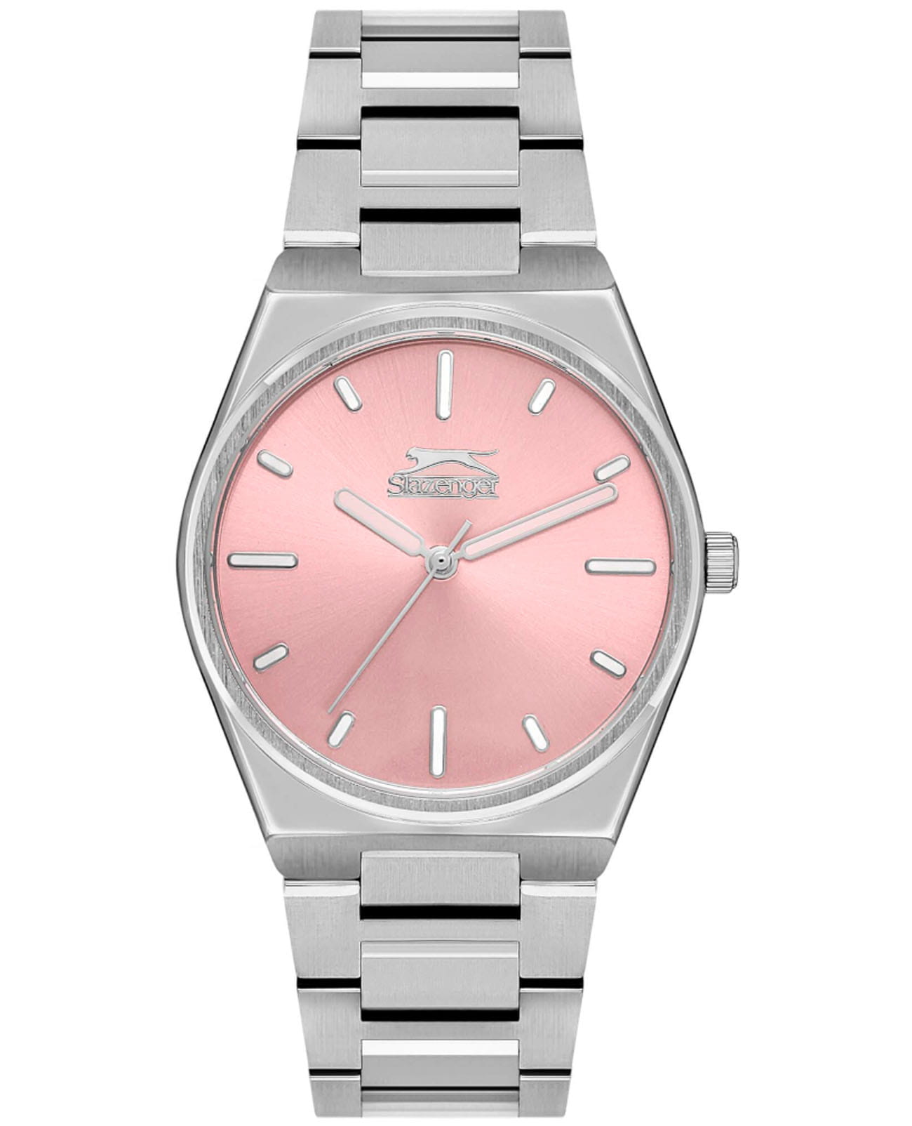 Женские наручные часы Slazenger SL.09.2116.3.03 сочетают в себе классический дизайн и надежность современных технологий. Модель обладает бочкообразным корпусом диаметром 34 мм, изготовленным из металлического сплава, что обеспечивает высокую устойчивость к внешним воздействиям. Браслет выполнен из стали с раскладной застежкойРаскладной замокДанный вариант застежки используется только на часах с металлическим браслетом. Отличительная особенность такого крепления в том, что длина браслета становится универсальной и вы можете самостоятельно отрегулировать нужный вам размер – застежка просто двигается по браслету часов., гарантирующей комфортное ношение и безопасность. Циферблат розового цвета декорирован стрелками и индексами, которые обеспечивают читаемость времени даже в условиях недостаточной освещенности. Для защиты используется минеральное стеклоМинеральное стеклоМинеральное стекло представляет собой искусственно выращенный минерал кварца. Такое стекло отличается особой устойчивостью к повреждениям и царапинам. Уступает по некоторым качествам сапфировому стеклу., обеспечивающее прочную защиту от царапин. Часы работают на кварцевом механизме, что гарантирует точное время без необходимости подзаводки. Модель также оснащена функцией отображения даты, делая ее практичной для повседневного использования. Водонепроницаемость часов достигает 3 атмосфер, что позволяет использовать их при мытье рук или хождении под мелким дождем, однако не рекомендуется для плавания или других водных видов спорта. Вес модели составляет 83 грамма.
