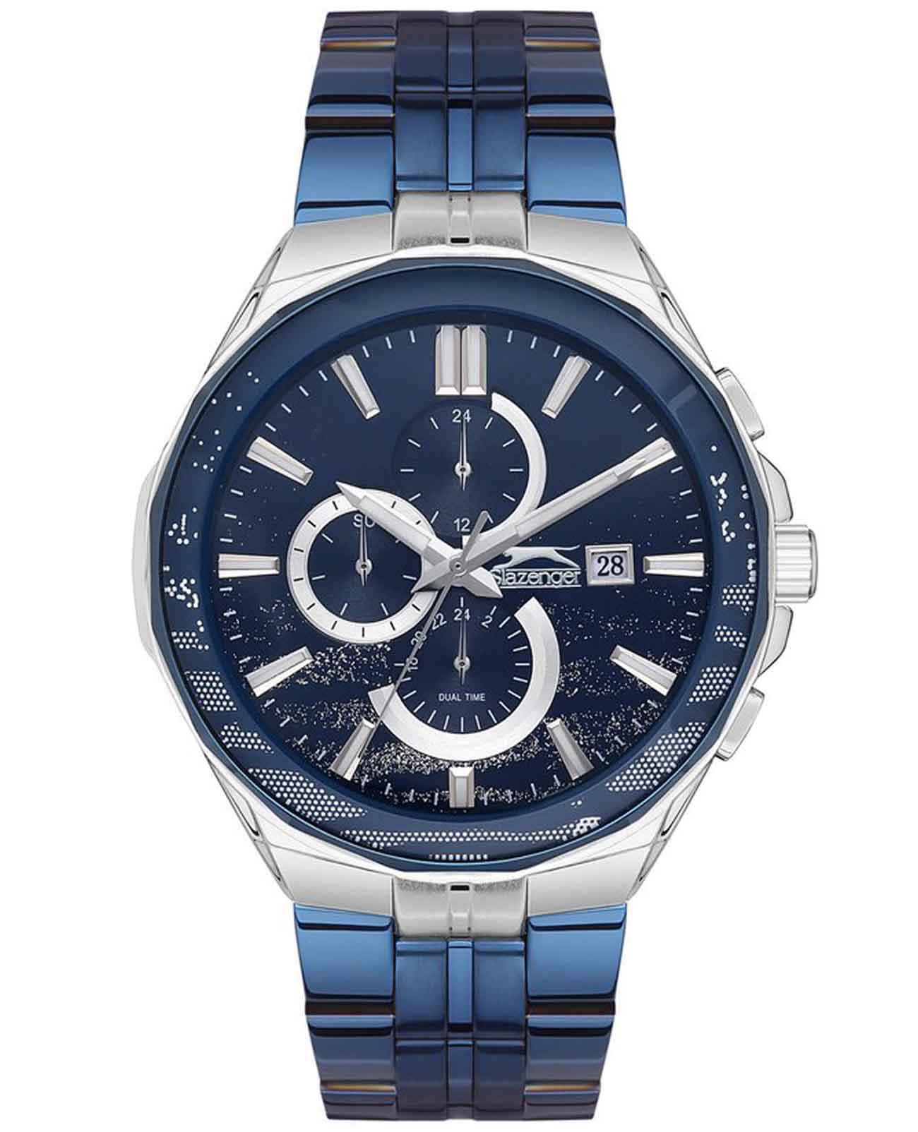 Часы Slazenger SL.09.2129.2.05 воплощают в себе элегантность и практичность, идеально подходящие для современных мужчин. Их синий циферблат, защищенный минеральным стекломМинеральное стеклоМинеральное стекло представляет собой искусственно выращенный минерал кварца. Такое стекло отличается особой устойчивостью к повреждениям и царапинам. Уступает по некоторым качествам сапфировому стеклу., заключен в серебристый корпус диаметром 47 мм, который изготовлен из прочного суперметалла. Часы оснащены двойным форматом времени (12 и 24 часа), вторым часовым поясом и удобным окошком даты. Надежный кварцевый механизм обеспечивает точность, а водозащита 5 ATM делает их устойчивыми к воздействию воды. Стальной браслет из суперметалла с IP-покрытиемIP-покрытиеМетод ионного напыления. Демонстрирует повышенную устойчивость к истиранию, окислению и химическим веществам. Под воздействием высокого давления и температуры около 1500°C молекулы металла надёжно соединяются с частицами корпуса часов. синего цвета имеет раскладную застёжкуРаскладная застёжкаТакой тип застёжки используется только на браслетах из металла. Она никогда не раскрывается полностью, происходит разделение на 2 и более частей. Раскладывающая застёжка снизит вероятность потери часов к минимуму., что подчеркивает современный стиль и позволяет легко снимать часы. Часы оснащены 24-часовым указателем времени, а также функциями отображения даты и дня недели. Люминесцентное покрытиеЛюминесцентное покрытиеПозволяет считывать показания времени в темноте. Производители наносят на стрелки, часовые индексы, безель или поверхность циферблата светонакопительный состав, дающий холодное свечение. на стрелках и метках обеспечивает отличную видимость в темноте.