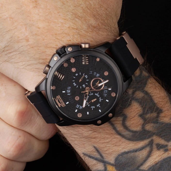 Часы Slazenger SL.09.2212.2.03 представляют собой стильный и функциональный аксессуар, созданный для современных мужчин, ценящих качество и надежность. Они оснащены кварцевым механизмом, который обеспечивает точность хода и минимальную необходимость в обслуживании. Люминесцентное покрытиеЛюминесцентное покрытиеПозволяет считывать показания времени в темноте. Производители наносят на стрелки, часовые индексы, безель или поверхность циферблата светонакопительный состав, дающий холодное свечение. на стрелках и метках обеспечивает отличную видимость в темноте. Благодаря водозащите уровня WR 50 (5 ATM), эти часы отлично справляются с воздействием влаги, что делает их подходящими для повседневного ношения и активного образа жизни. Минеральное стеклоМинеральное стеклоМинеральное стекло представляет собой искусственно выращенный минерал кварца. Такое стекло отличается особой устойчивостью к повреждениям и царапинам. Уступает по некоторым качествам сапфировому стеклу. защищает циферблат от царапин и повреждений, гарантируя долгий срок службы. Корпус часов диаметром 47 мм и толщиной 13 мм выполнен из прочного суперметалла с черным IP-покрытиемIP-покрытиеМетод ионного напыления. Демонстрирует повышенную устойчивость к истиранию, окислению и химическим веществам. Под воздействием высокого давления и температуры около 1500°C молекулы металла надёжно соединяются с частицами корпуса часов., что придаёт им стильный и современный вид. Силиконовый черный браслет, дополненный элементами из суперметалла с золотистым IP-покрытиемIP-покрытиеМетод ионного напыления. Демонстрирует повышенную устойчивость к истиранию, окислению и химическим веществам. Под воздействием высокого давления и температуры около 1500°C молекулы металла надёжно соединяются с частицами корпуса часов., обеспечивает комфорт при носке и надёжно фиксирует часы на запястье, а его размеры (22-20 мм) подходят для большинства мужчин. Часы оснащены рядом полезных функций, таких как индикация даты, дня недели и 24-часовой указатель времени, что делает их не только стильным, но и практичным аксессуаром. Вес модели составляет 110 г, что делает их лёгкими и удобными для ежедневного ношения.