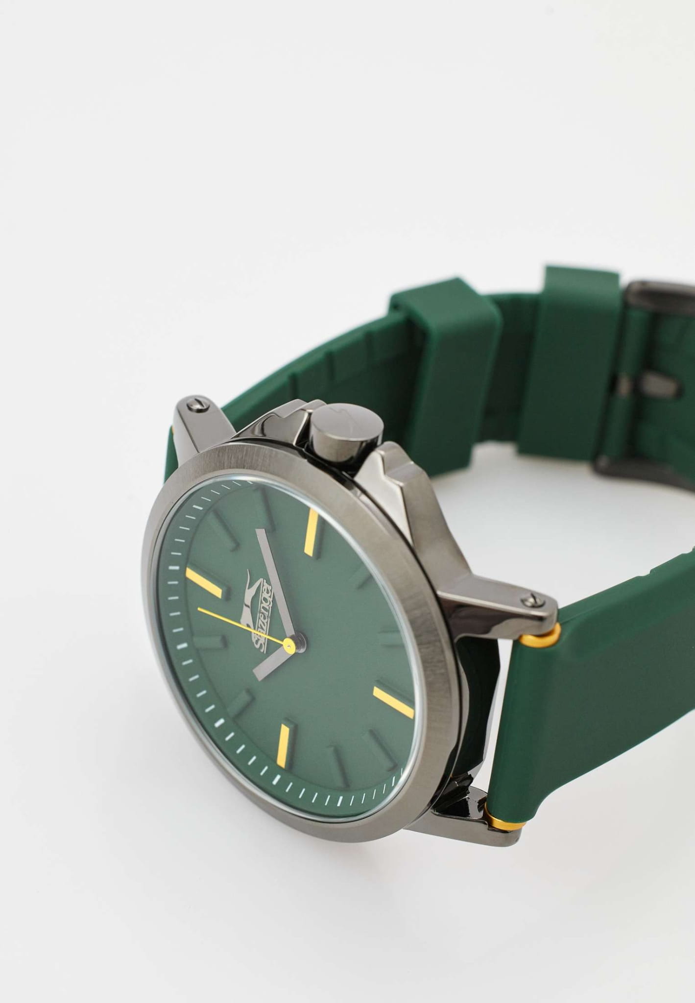Стильные наручные часы Slazenger SL.09.2220.1.07 сочетают современный дизайн и практичность для повседневного использования. Крупный корпус диаметром 48 мм выполнен из прочного металла IP-покрытиемIP-покрытиеМетод ионного напыления. Демонстрирует повышенную устойчивость к истиранию, окислению и химическим веществам. Под воздействием высокого давления и температуры около 1500°C молекулы металла надёжно соединяются с частицами корпуса часов., а минеральное стеклоМинеральное стеклоМинеральное стекло представляет собой искусственно выращенный минерал кварца. Такое стекло отличается особой устойчивостью к повреждениям и царапинам. Уступает по некоторым качествам сапфировому стеклу. обеспечивает дополнительную защиту темно-зеленого циферблата от царапин. Модель оснащена надежным кварцевым механизмом и имеет водозащиту класса WR 50, что позволяет не снимать часы при мытье рук или во время дождя. Зеленый ремешок из мягкого и долговечного силикона удобно сидит на запястье и фиксируется классической застежкой. Часы весят всего 86 грамм, что делает их комфортными для ежедневной носки. Заводная головка оснащена защитой, что предотвращает случайное повреждение. Эта модель станет надежным и стильным аксессуаром для тех, кто ценит качество и функциональность.