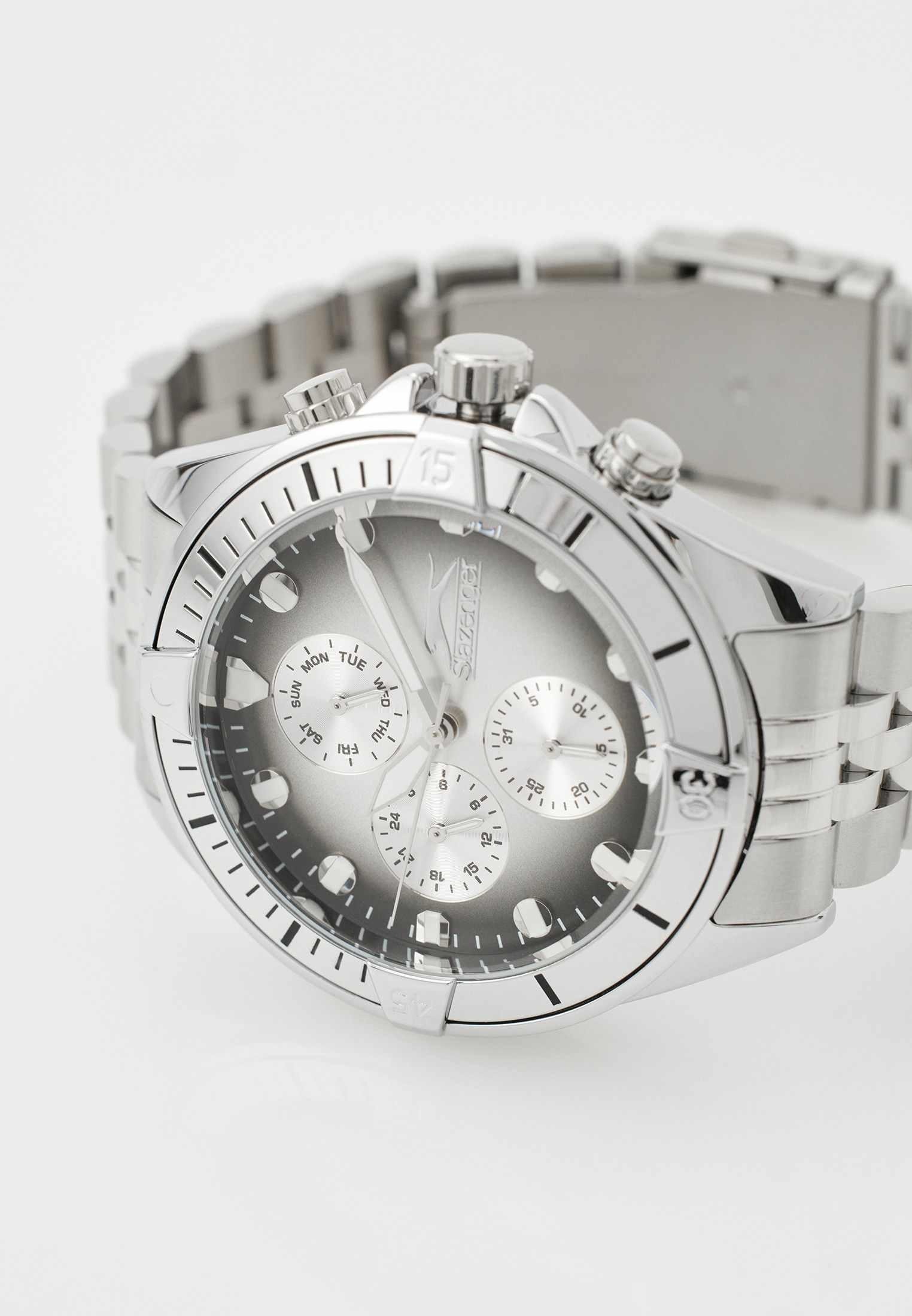 Часы Slazenger SL.09.2227.2.01 — это стильная и функциональная модель, созданная для современных мужчин, ценящих качество и надежность. Корпус из прочного металла и безельБезельВнешний ободок, закрепляющий стекло. В спортивных часах так называется поворотное кольцо с делениями на циферблате, выполняет роль таймера – замеряет отрезки времени на шкале. Неподвижный безель – элемент декора. Однонаправленно вращающийся безель на дайверских часах позволяет фиксировать моменты погружения и выныривания на поверхность. диаметром 46 мм и толщиной 12 мм придаёт часам солидный вид, а серебристый металлический браслет с раскладной застёжкойРаскладная застёжкаТакой тип застёжки используется только на браслетах из металла. Она никогда не раскрывается полностью, происходит разделение на 2 и более частей. Раскладывающая застёжка снизит вероятность потери часов к минимуму. обеспечивает удобство при ношении. Надежный кварцевый механизм гарантирует точность хода, а минеральное стеклоМинеральное стеклоМинеральное стекло представляет собой искусственно выращенный минерал кварца. Такое стекло отличается особой устойчивостью к повреждениям и царапинам. Уступает по некоторым качествам сапфировому стеклу. защищает градиентный черно-белый циферблат от царапин. Модель оснащена дополнительными малыми циферблатами, отображающими дату, день недели и текущее время в 24-часовом формате, что делает часы особенно практичными. Для удобства использования в темное время суток предусмотрено люминесцентное покрытиеЛюминесцентное покрытиеПозволяет считывать показания времени в темноте. Производители наносят на стрелки, часовые индексы, безель или поверхность циферблата светонакопительный состав, дающий холодное свечение. стрелок. Заводная головка имеет специальную защиту. Водозащита уровня WR 50 позволяет не беспокоиться о случайном попадании воды. Вес изделия составляет 161 грамм. Эти часы станут отличным выбором для тех, кто ценит элегантность и функциональность в одном аксессуаре.