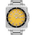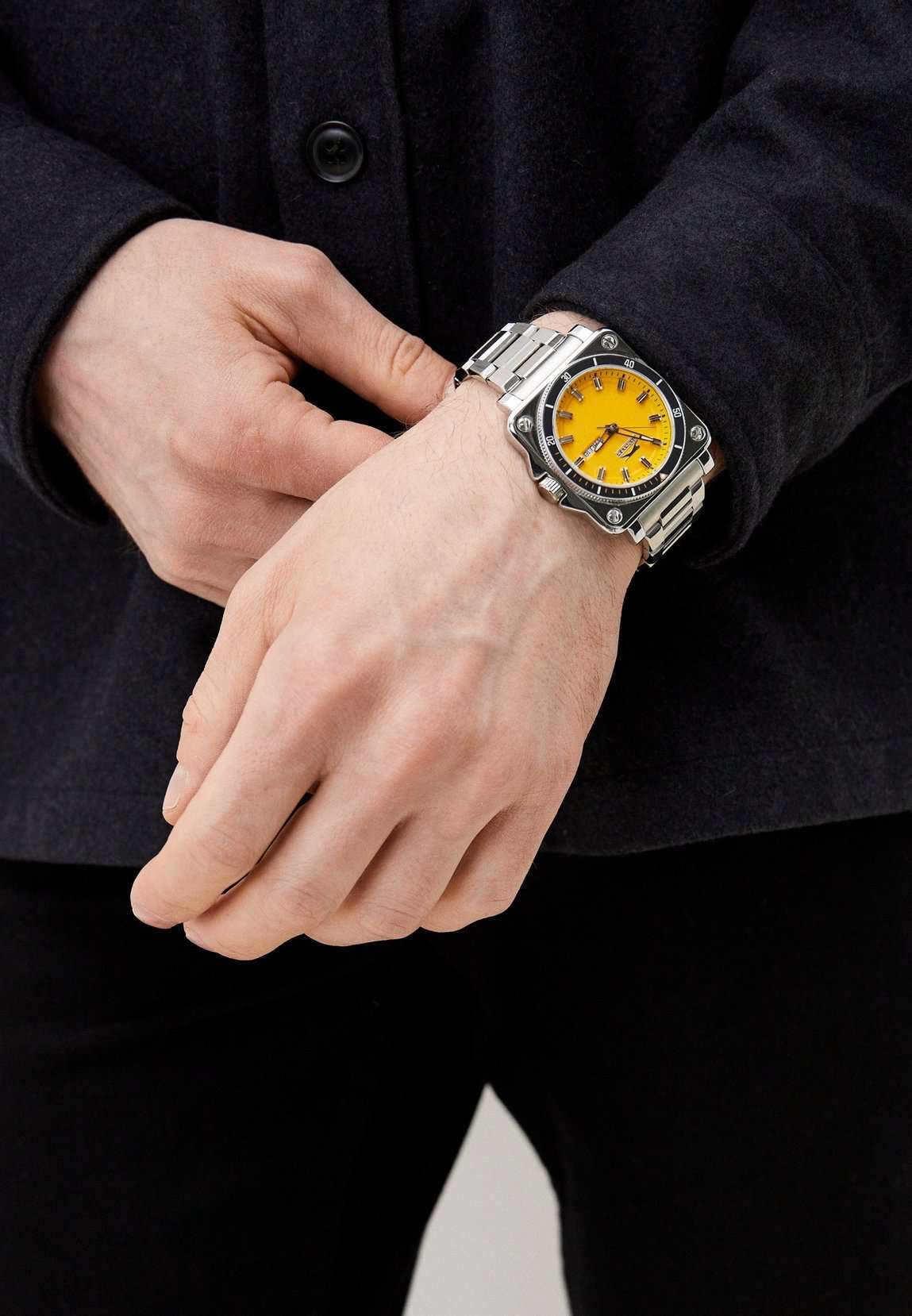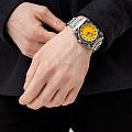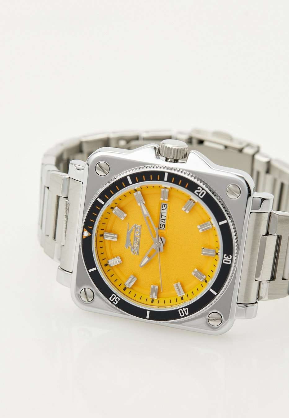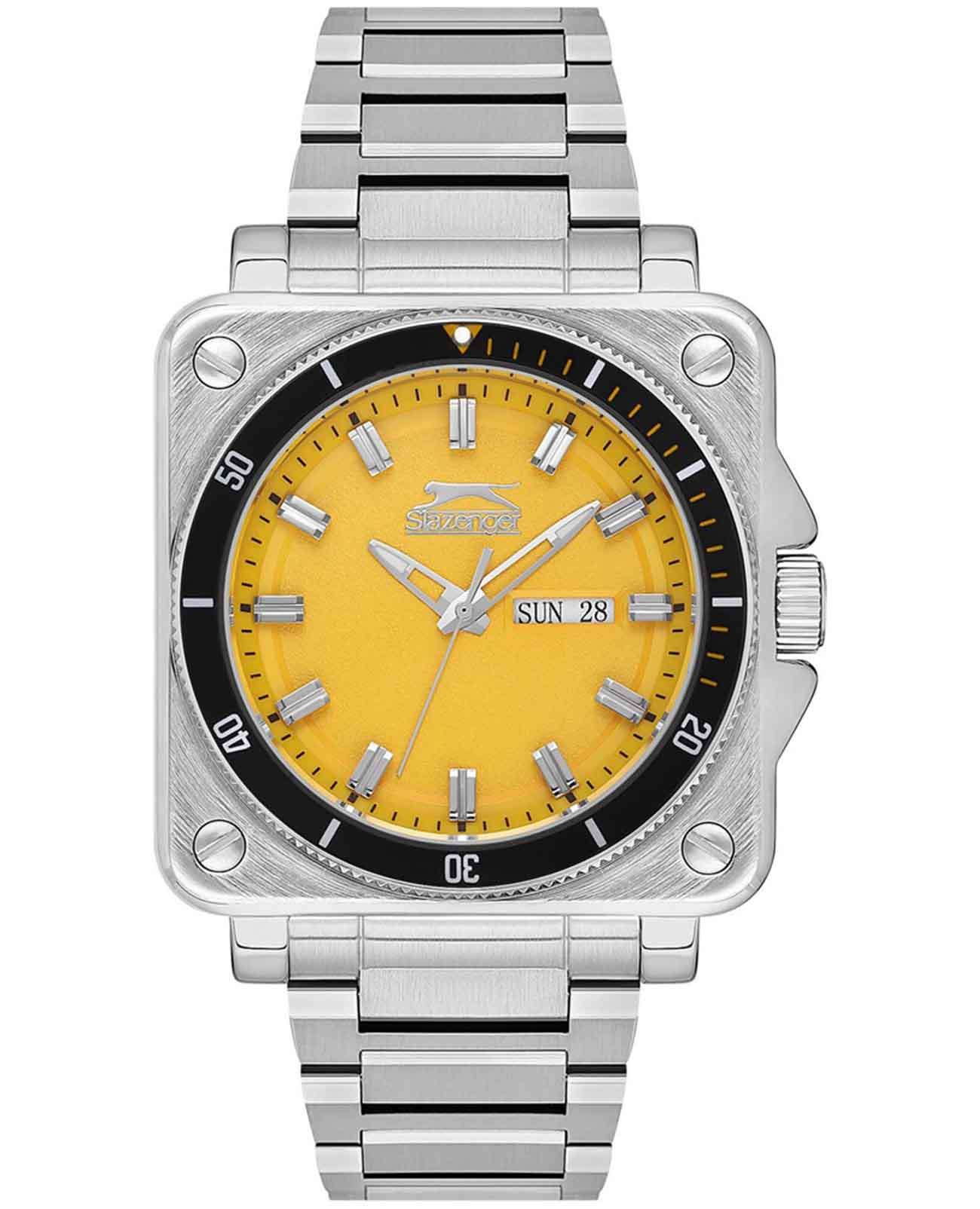 Часы Slazenger SL.09.2232.1.07 — это современная модель, сочетающая стиль и практичность. Корпус квадратной формы выполнен из прочного металла, а круглый желтый циферблат придает дизайну особую выразительность. На вращающийся безельБезельВнешний ободок, закрепляющий стекло. В спортивных часах так называется поворотное кольцо с делениями на циферблате, выполняет роль таймера – замеряет отрезки времени на шкале. Неподвижный безель – элемент декора. Однонаправленно вращающийся безель на дайверских часах позволяет фиксировать моменты погружения и выныривания на поверхность. нанесено черное IP-покрытиеIP-покрытиеМетод ионного напыления. Демонстрирует повышенную устойчивость к истиранию, окислению и химическим веществам. Под воздействием высокого давления и температуры около 1500°C молекулы металла надёжно соединяются с частицами корпуса часов.. Серебристый металлический браслет снабжен надежной раскладной застёжкойРаскладная застёжкаТакой тип застёжки используется только на браслетах из металла. Она никогда не раскрывается полностью, происходит разделение на 2 и более частей. Раскладывающая застёжка снизит вероятность потери часов к минимуму., обеспечивающей удобство при повседневном ношении. Модель оснащена кварцевым механизмом, минеральное стеклоМинеральное стеклоМинеральное стекло представляет собой искусственно выращенный минерал кварца. Такое стекло отличается особой устойчивостью к повреждениям и царапинам. Уступает по некоторым качествам сапфировому стеклу., защищающим от случайных повреждений, и водозащитой уровня WR 50, позволяющей не бояться контакта с водой в повседневных ситуациях. На циферблате расположены окошки даты и дня недели. Для удобства использования в темное время суток предусмотрено люминесцентное покрытиеЛюминесцентное покрытиеПозволяет считывать показания времени в темноте. Производители наносят на стрелки, часовые индексы, безель или поверхность циферблата светонакопительный состав, дающий холодное свечение. стрелок. Заводная головка дополнительно защищена от случайных нажатий. Габариты корпуса составляют 43 на 43 мм, толщина — 11 мм.