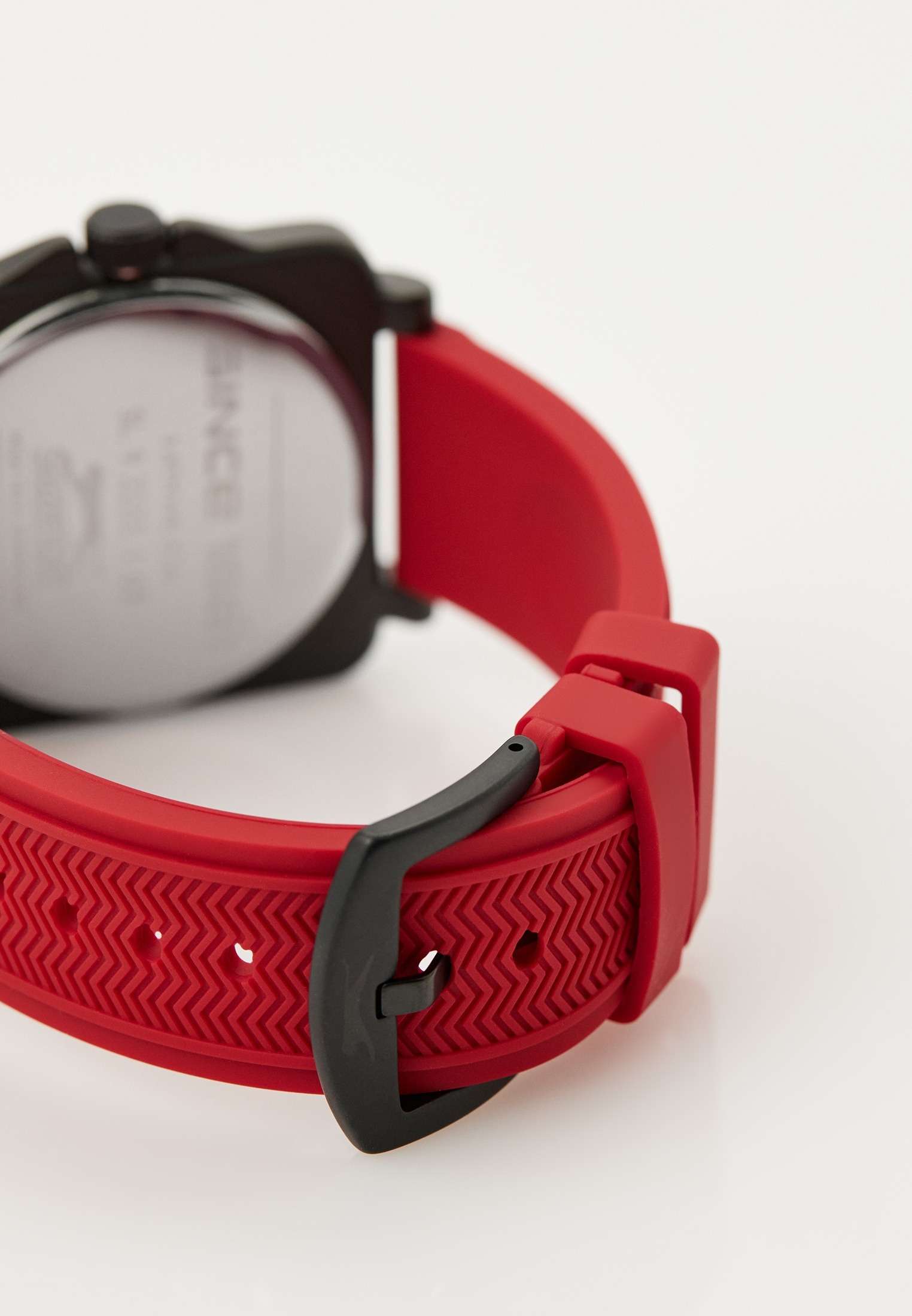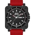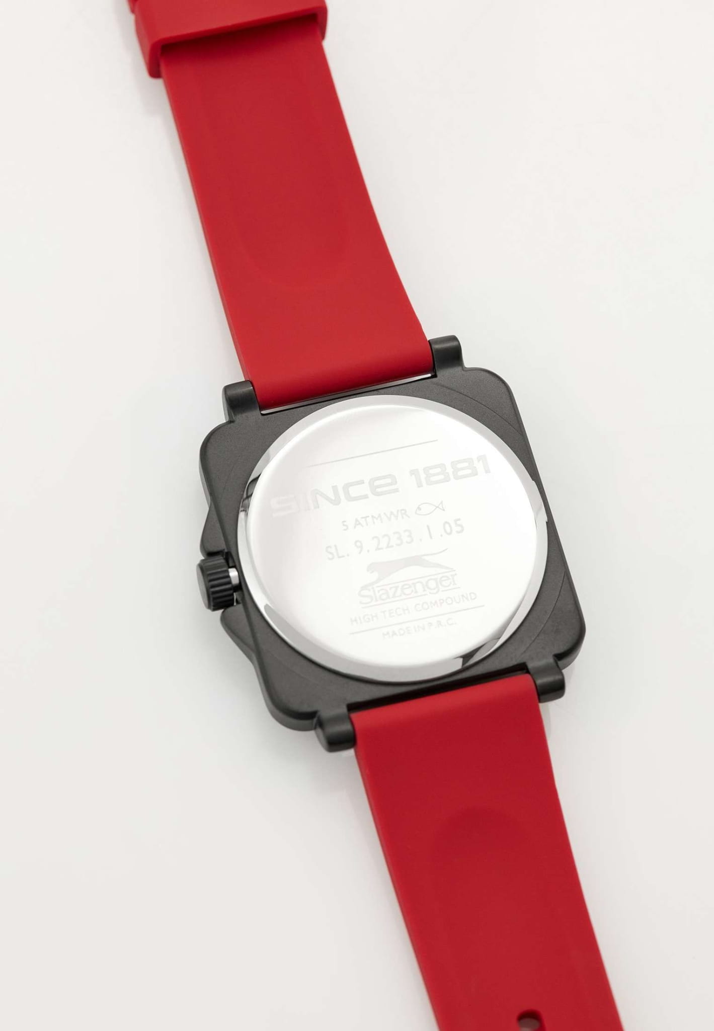 Часы Slazenger SL.09.2233.1.05 — это современная модель, сочетающая стиль и практичность. Корпус квадратной формы выполнен из прочного металла с черным IP-покрытиемIP-покрытиеМетод ионного напыления. Демонстрирует повышенную устойчивость к истиранию, окислению и химическим веществам. Под воздействием высокого давления и температуры около 1500°C молекулы металла надёжно соединяются с частицами корпуса часов., а круглый красный циферблат придает дизайну особую выразительность. На вращающийся безельБезельВнешний ободок, закрепляющий стекло. В спортивных часах так называется поворотное кольцо с делениями на циферблате, выполняет роль таймера – замеряет отрезки времени на шкале. Неподвижный безель – элемент декора. Однонаправленно вращающийся безель на дайверских часах позволяет фиксировать моменты погружения и выныривания на поверхность. нанесено черное IP-покрытиеIP-покрытиеМетод ионного напыления. Демонстрирует повышенную устойчивость к истиранию, окислению и химическим веществам. Под воздействием высокого давления и температуры около 1500°C молекулы металла надёжно соединяются с частицами корпуса часов.. Резиновый красный ремешок с классической застежкой обеспечивает удобство при повседневном ношении. Модель оснащена кварцевым механизмом, минеральное стеклоМинеральное стеклоМинеральное стекло представляет собой искусственно выращенный минерал кварца. Такое стекло отличается особой устойчивостью к повреждениям и царапинам. Уступает по некоторым качествам сапфировому стеклу., защищающим от случайных повреждений, и водозащитой уровня WR 50, позволяющей не бояться контакта с водой в повседневных ситуациях. На циферблате расположены окошки даты и дня недели. Для удобства использования в темное время суток предусмотрено люминесцентное покрытиеЛюминесцентное покрытиеПозволяет считывать показания времени в темноте. Производители наносят на стрелки, часовые индексы, безель или поверхность циферблата светонакопительный состав, дающий холодное свечение. стрелок. Заводная головка дополнительно защищена от случайных нажатий. Габариты корпуса составляют 43 на 43 мм, толщина — 11 мм.