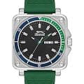 Часы Slazenger SL.09.2233.1.06 — это современная модель, сочетающая стиль и практичность. Корпус квадратной формы выполнен из прочного металла, а круглый черный циферблат придает дизайну особую выразительность. На вращающийся безельБезельВнешний ободок, закрепляющий стекло. В спортивных часах так называется поворотное кольцо с делениями на циферблате, выполняет роль таймера – замеряет отрезки времени на шкале. Неподвижный безель – элемент декора. Однонаправленно вращающийся безель на дайверских часах позволяет фиксировать моменты погружения и выныривания на поверхность. нанесено синее и зеленое IP-покрытиеIP-покрытиеМетод ионного напыления. Демонстрирует повышенную устойчивость к истиранию, окислению и химическим веществам. Под воздействием высокого давления и температуры около 1500°C молекулы металла надёжно соединяются с частицами корпуса часов.. Резиновый зеленый ремешок с классической застежкой обеспечивает удобство при повседневном ношении. Модель оснащена кварцевым механизмом, минеральное стеклоМинеральное стеклоМинеральное стекло представляет собой искусственно выращенный минерал кварца. Такое стекло отличается особой устойчивостью к повреждениям и царапинам. Уступает по некоторым качествам сапфировому стеклу., защищающим от случайных повреждений, и водозащитой уровня WR 50, позволяющей не бояться контакта с водой в повседневных ситуациях. На циферблате расположены окошки даты и дня недели. Для удобства использования в темное время суток предусмотрено люминесцентное покрытиеЛюминесцентное покрытиеПозволяет считывать показания времени в темноте. Производители наносят на стрелки, часовые индексы, безель или поверхность циферблата светонакопительный состав, дающий холодное свечение. стрелок. Заводная головка дополнительно защищена от случайных нажатий. Габариты корпуса составляют 43 на 43 мм, толщина — 11 мм.
