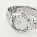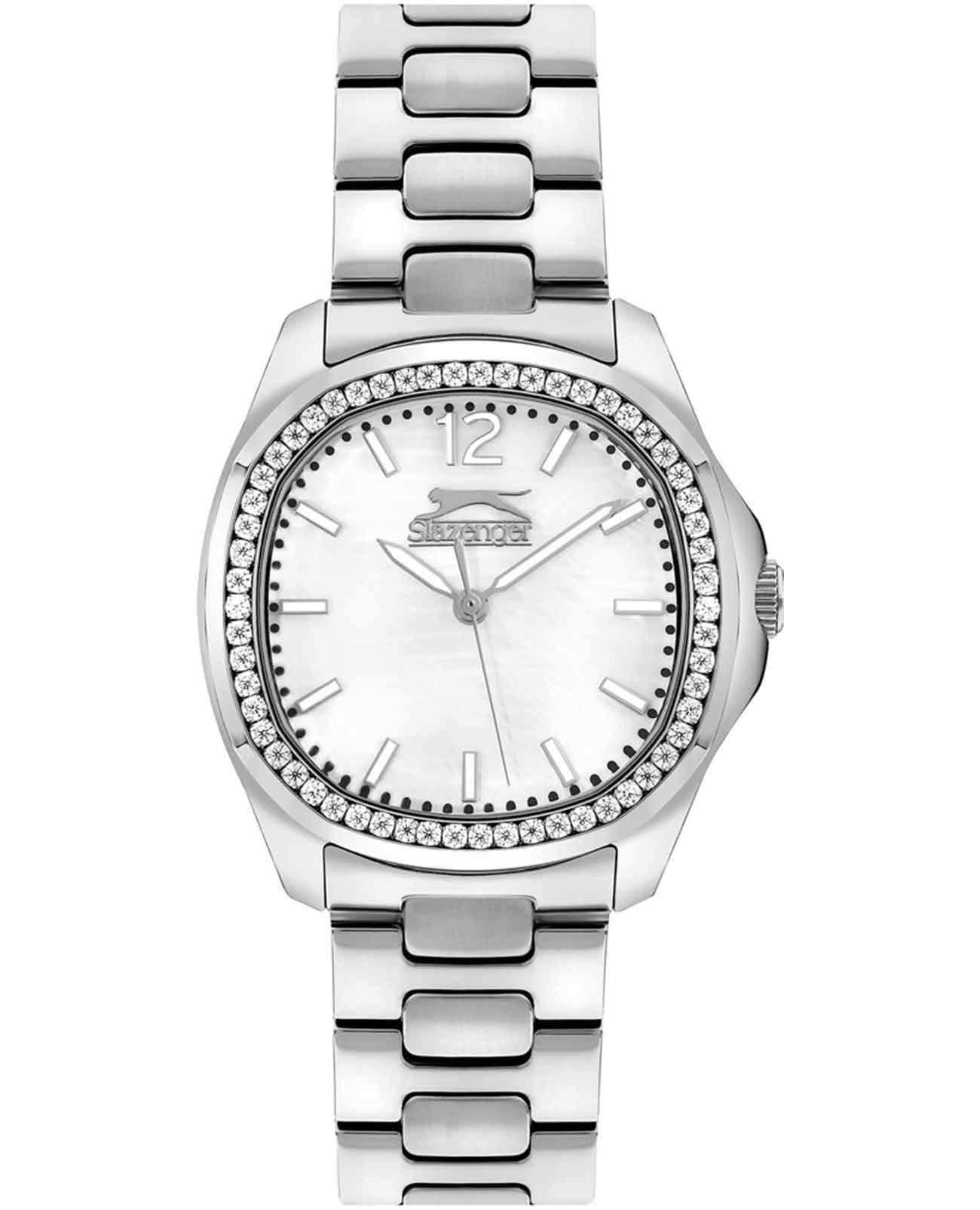 Часы Slazenger SL.09.2238.3.01 – это изысканный аксессуар, который станет стильным акцентом любого образа. Модель оснащена надежным кварцевым механизмом. Корпус из прочного металла размером 34х34 мм украшен россыпью сверкающих фианитов по безелюБезельВнешний ободок, закрепляющий стекло. В спортивных часах так называется поворотное кольцо с делениями на циферблате, выполняет роль таймера – замеряет отрезки времени на шкале. Неподвижный безель – элемент декора. Однонаправленно вращающийся безель на дайверских часах позволяет фиксировать моменты погружения и выныривания на поверхность., что придает часам особое сияние и элегантность. Белый перламутровый циферблат с логотипом бренда защищен стойким к царапинам минеральным стекломМинеральное стеклоМинеральное стекло представляет собой искусственно выращенный минерал кварца. Такое стекло отличается особой устойчивостью к повреждениям и царапинам. Уступает по некоторым качествам сапфировому стеклу.. Четкие часовые метки в виде лаконичных штрихов и крупная арабская цифра 12 обеспечивают удобство чтения времени. Заводная головка с рифлением дополнена защитой для повышения долговечности. Металлический браслет шириной 18 мм надежно фиксируется на запястье с помощью застежки «бабочка»Застёжка "бабочка"Такой вид застёжки дополняется предохранителями, помогающими избежать случайного раскрытия браслета. Обладают изящным исполнением. . Для удобства использования в темное время суток предусмотрено люминесцентное покрытиеЛюминесцентное покрытиеПозволяет считывать показания времени в темноте. Производители наносят на стрелки, часовые индексы, безель или поверхность циферблата светонакопительный состав, дающий холодное свечение. стрелок. Водозащита 30WR позволяет не беспокоиться о случайных брызгах. Вес изделия составляет 92 грамма, что делает часы комфортными для ежедневного ношения. Эти часы идеально подойдут для тех, кто ценит гармонию стиля, качества и функциональности.