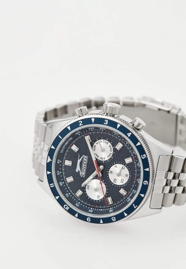 Часы Slazenger SL.09.2248.2.02 — это современная модель с выразительным спортивным характером, идеально подходящая для активного образа жизни. Корпус выполнен из прочного металла, синий циферблат защищён минеральным стекломМинеральное стеклоМинеральное стекло представляет собой искусственно выращенный минерал кварца. Такое стекло отличается особой устойчивостью к повреждениям и царапинам. Уступает по некоторым качествам сапфировому стеклу., устойчивым к царапинам. Часы также оснащены шкалой тахиметраТахиметрРазмеченная шкала, располагается на ободке или безеле часов. Тахиметр позволяет рассчитать скорость на определённом участке пути, расстояние измеряется в километрах или милях., что добавляет им функциональности и может быть полезно для измерения скорости. На безельБезельВнешний ободок, закрепляющий стекло. В спортивных часах так называется поворотное кольцо с делениями на циферблате, выполняет роль таймера – замеряет отрезки времени на шкале. Неподвижный безель – элемент декора. Однонаправленно вращающийся безель на дайверских часах позволяет фиксировать моменты погружения и выныривания на поверхность. нанесено синее IP-покрытиеIP-покрытиеМетод ионного напыления. Демонстрирует повышенную устойчивость к истиранию, окислению и химическим веществам. Под воздействием высокого давления и температуры около 1500°C молекулы металла надёжно соединяются с частицами корпуса часов.. Диаметр корпуса составляет 46 мм, толщина — 11 мм, а ширина браслета — 22 мм. Часы оснащены металлическим браслетом с надежной раскладной застёжкойРаскладная застёжкаТакой тип застёжки используется только на браслетах из металла. Она никогда не раскрывается полностью, происходит разделение на 2 и более частей. Раскладывающая застёжка снизит вероятность потери часов к минимуму., благодаря чему часы удобно сидят на руке и не вызывают дискомфорта даже при длительном ношении. Вес модели составляет 130 грамм. Надёжный кварцевый механизм обеспечивает точность времени, а уровень водозащиты WR 50 позволяет использовать часы в повседневных условиях, не опасаясь случайных брызг или дождя. Для удобства использования в темное время суток предусмотрено люминесцентное покрытиеЛюминесцентное покрытиеПозволяет считывать показания времени в темноте. Производители наносят на стрелки, часовые индексы, безель или поверхность циферблата светонакопительный состав, дающий холодное свечение. стрелок и меток. Дополнительные малые циферблаты показывают дату, день недели и текущее время в 24-часовом формате, что делает использование часов ещё более удобным и функциональным.