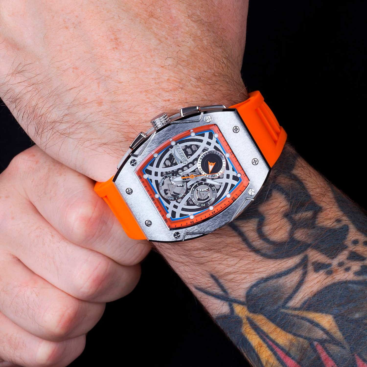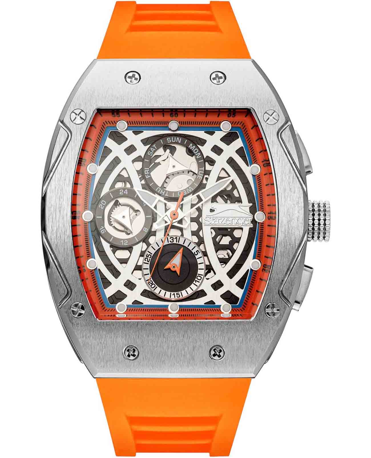 Часы Slazenger SL.09.2257.2.04 — это современная модель, сочетающая стильный внешний вид и функциональность. Крупный корпус размером 44х53 мм выполнен из металла, что придает часам выразительный характер и надежную защиту от внешних воздействий. Сатинированный безельБезельВнешний ободок, закрепляющий стекло. В спортивных часах так называется поворотное кольцо с делениями на циферблате, выполняет роль таймера – замеряет отрезки времени на шкале. Неподвижный безель – элемент декора. Однонаправленно вращающийся безель на дайверских часах позволяет фиксировать моменты погружения и выныривания на поверхность. гармонично сочетается с серебристым циферблатом, украшенным логотипом бренда и аккуратными часовыми метками в виде точек. Минеральное стеклоМинеральное стеклоМинеральное стекло представляет собой искусственно выращенный минерал кварца. Такое стекло отличается особой устойчивостью к повреждениям и царапинам. Уступает по некоторым качествам сапфировому стеклу. обеспечивает защиту от случайных царапин, а стрелки и метки с люминесцентным покрытиемЛюминесцентное покрытиеПозволяет считывать показания времени в темноте. Производители наносят на стрелки, часовые индексы, безель или поверхность циферблата светонакопительный состав, дающий холодное свечение. удобно подсвечиваются в темноте после зарядки на свету. На циферблате расположены отдельные индикаторы даты, дня недели, а также 12- и 24-часового формата времени. За точность хода отвечает кварцевый механизм, не требующий ежедневного завода. Модель снабжена оранжевым силиконовым ремешком шириной 26 мм с классической застежкой, который комфортно фиксируется на запястье и подходит для активного образа жизни. Водозащита 50WR позволяет не снимать часы при мытье рук или во время прогулок под дождем.