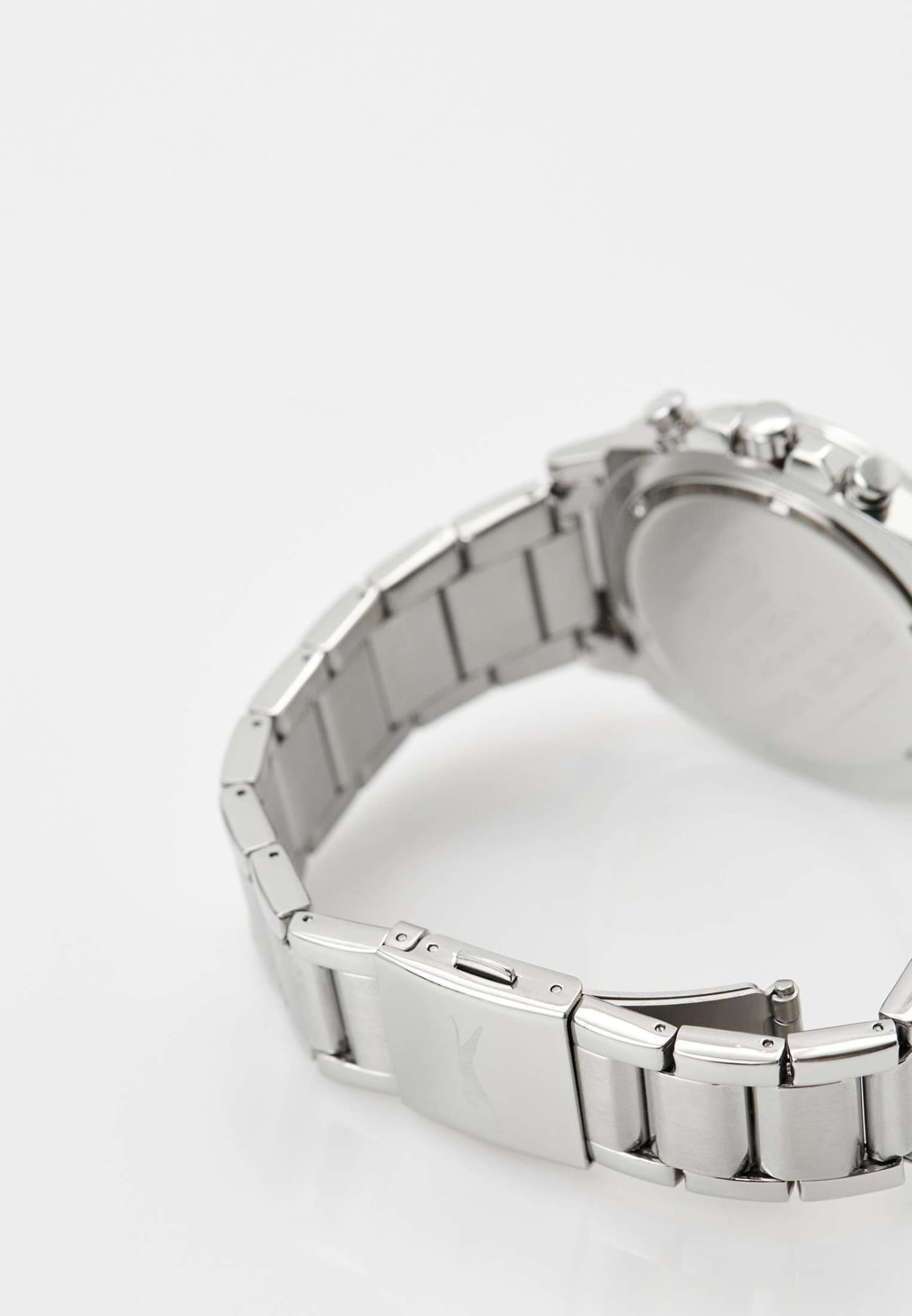 Slazenger SL.09.2292.2.05 — это стильные наручные часы, выполненные в современном дизайне и отлично подходящие для повседневного использования. Корпус диаметром 45 мм изготовлен из прочного металла и дополнен минеральным стекломМинеральное стеклоМинеральное стекло представляет собой искусственно выращенный минерал кварца. Такое стекло отличается особой устойчивостью к повреждениям и царапинам. Уступает по некоторым качествам сапфировому стеклу., которое защищает серебристый циферблат. Серебристый металлический браслет шириной 24 мм оснащён надежной раскладной застёжкойРаскладная застёжкаТакой тип застёжки используется только на браслетах из металла. Она никогда не раскрывается полностью, происходит разделение на 2 и более частей. Раскладывающая застёжка снизит вероятность потери часов к минимуму., которая обеспечивает комфортную посадку на руке. Кварцевый механизм гарантирует точный ход, а водозащита уровня WR 50 позволяет не снимать часы во время мытья рук или под дождём. Модель оснащена люминесцентным покрытиемЛюминесцентное покрытиеПозволяет считывать показания времени в темноте. Производители наносят на стрелки, часовые индексы, безель или поверхность циферблата светонакопительный состав, дающий холодное свечение. стрелок и меток, что облегчает считывание времени в темноте. Дополнительные малые циферблаты отображают дату, день недели и текущее время в 24-часовом формате. Часы также оснащены заводной головкой с защитой и безелемБезельВнешний ободок, закрепляющий стекло. В спортивных часах так называется поворотное кольцо с делениями на циферблате, выполняет роль таймера – замеряет отрезки времени на шкале. Неподвижный безель – элемент декора. Однонаправленно вращающийся безель на дайверских часах позволяет фиксировать моменты погружения и выныривания на поверхность. с черным IP-покрытиемIP-покрытиеМетод ионного напыления. Демонстрирует повышенную устойчивость к истиранию, окислению и химическим веществам. Под воздействием высокого давления и температуры около 1500°C молекулы металла надёжно соединяются с частицами корпуса часов. и секундной разметкой. Вес изделия составляет 173 грамма.